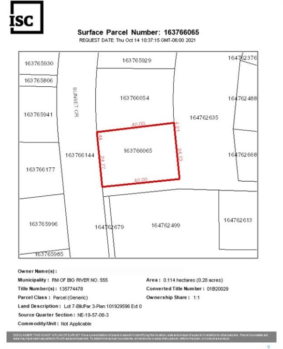 NEW PRICE - $34,900.00! Check out this excellent lot on Sunset Cove at Cowan Lake, approximately 1.5 hours from Prince Albert and 2.5 hours from Saskatoon in the beautiful Northern Boreal Forest. This 0.28-acre titled parcel is located at the resort community of Sunset Cove, a year-round getaway with many nearby activities including fishing, snowmobiling, watersports, and even skiing at nearby Timber Ridge ski hill. The town of Big River is just 16km away and serves as a service hub for the local community. Located on the edge of the shoreline, Sunset Cove is a small subdivision with many year-round residents and a private boat launch/parking for residents. One row back from the water, this sloping parcel is perfect for a future walk-out basement or garage loft with views of the water. The lot backs onto an environmental reserve, providing a buffer strip between the lot and the adjacent property. The road approach and culvert have already been installed, power and phone service are located near the edge of the property in the ditch. Whether you're looking to build a summer retreat or your dream home at the lake, this lot offers an excellent opportunity for you to enjoy the peace and serenity of Northern Saskatchewan. Don't miss out!