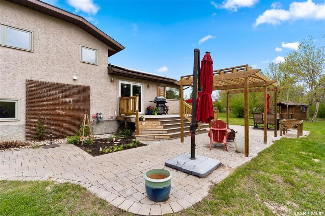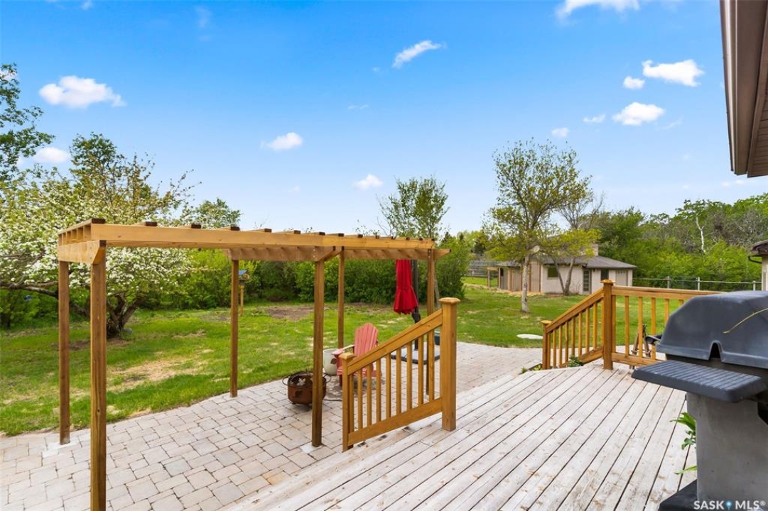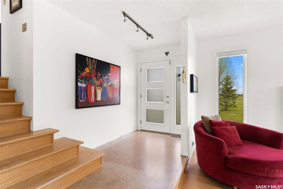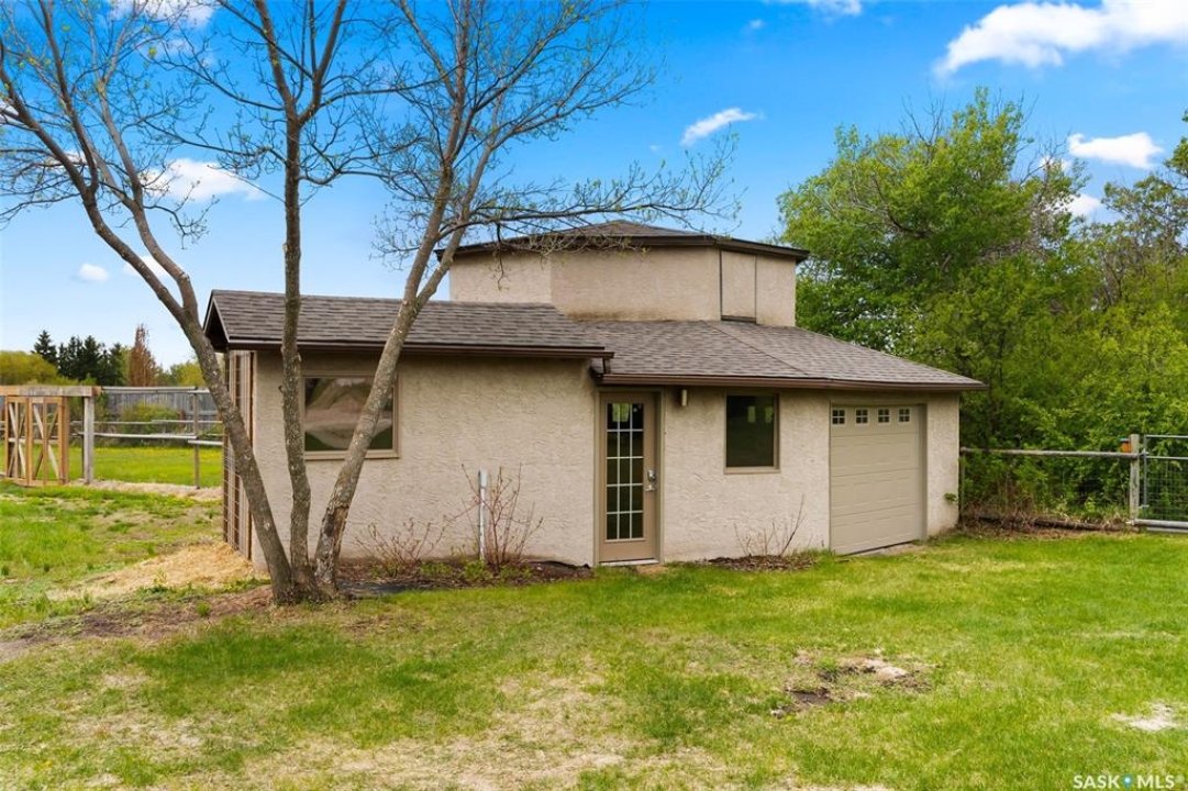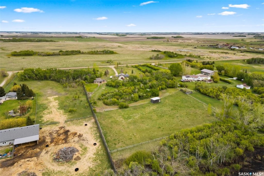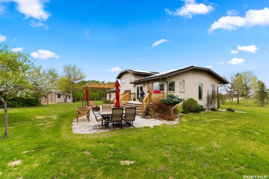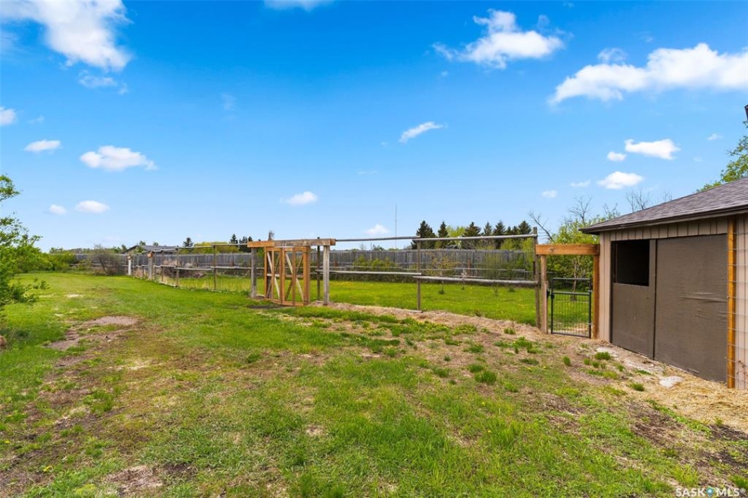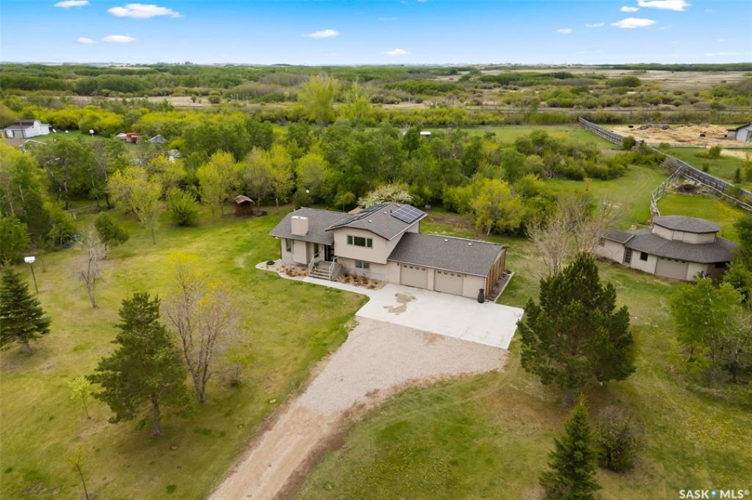 Welcome to this stunning country retreat, where modern convenience meets peaceful rural living. Nestled on 4.48 acres of thoughtfully developed land, this beautifully updated 1,584 sq. ft. four-level split offers tranquility with easy access to Regina, White City, Pilot Butte and the scenic White Butte trails. Built in 1984, this meticulously maintained home features cork & hardwood flooring throughout most living spaces, complemented by natural light pouring through triple-pane windows. The renovated kitchen boasts stainless steel appliances, a gas stovetop, built-in oven with warming drawer, an island, wall pantry, granite and quartz counter tops & backsplash, roll-out drawers. It opens nicely to the dining area. The sunken living room offers a cozy 25,000 BTU gas fireplace—perfect for relaxing evenings. Upstairs, the spacious primary bedroom has Jack & Jill access to the main bathroom, alongside a generous 2nd bedroom, a stylish 3 piece bath & a conveniently located laundry room. The 3rd level offers 2 additional bedrooms (one without a closet), a 2nd bath, a pantry with 2nd fridge, sink & under-cabinet grow lights. A generous side entry foyer provides direct access to the oversized double garage. The fully finished basement features a large L-shaped family room & utility room. Thoughtful upgrades include: high-efficiency furnace (2023), A/C (2021), SOLAR PANEL system (2022), Kinetico water softener and RO system, and central vac (2022). The oversized 30' x 26' garage includes 220-volt power and an inverter for future energy needs. The picturesque acreage features a 946 sq. ft. barn with an insulated tack room, fenced garden and fruit tree area, a large dog pen, horse and hay shelters, and a meadow seeded with wildflowers. The south-facing deck, paving stone patio, pergola, gas BBQ hookup provide endless outdoor enjoyment. Backing onto the White Butte ski trails, this acreage is the perfect blend of comfort, functionality, and natural beauty! A must see property!