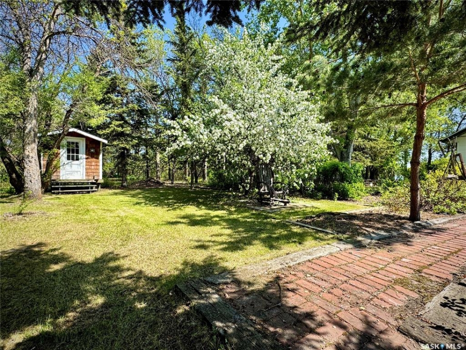 If you're an outdoor enthusiast who dreams of acreage life without sacrificing town conveniences, Lakeside Acres will capture your imagination—and your heart. This one-of-a-kind property is the result of years of thoughtful design, each tree planted, brick laid, and timber chosen with an artist's eye. The result? A yard that tells a story with every turn, every detail, every lovingly placed stone. What began as a humble prairie home has been transformed into a sprawling bungalow (built in 1998), blending craftsmanship and comfort. Solid wood doors and casings, hand-laid tile, warm hardwood floors, and a natural gas in-floor boiler heating system provide the foundation for a space that is both practical and beautiful. History lovers will appreciate the nods to the past woven throughout: hand-milled doors and transoms salvaged from the old Saltcoats school, original brickwork, vintage light fixtures, and even classic bar stools from nearby heritage schools—each element chosen with purpose and care. The kitchen looks straight out of a country living magazine, featuring a gleaming butcher block island, concrete countertops, stainless appliances, gas range, and a farmhouse sink. The four-season room might just be your favourite spot, with its stamped concrete floors, natural gas fireplace, and panoramic views that invite you to linger a little longer. Step out from the primary bedroom and greet Anderson Lake each morning—a view that never gets old. And then there's the outbuildings: a large cold storage garage, perfect for multiple vehicles or workshop space; a lean-to for all your tools and gear; and the pièce de résistance—an enchanting red “she shed” barn with its own deck, roughed-in in-floor heat, and a cozy finished guest space. Welcome to Lakeside Acres. A home as storied and soulful as you are.