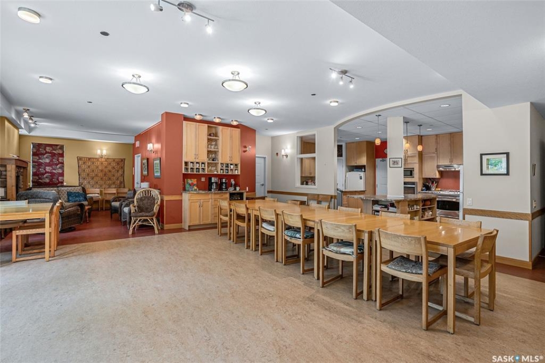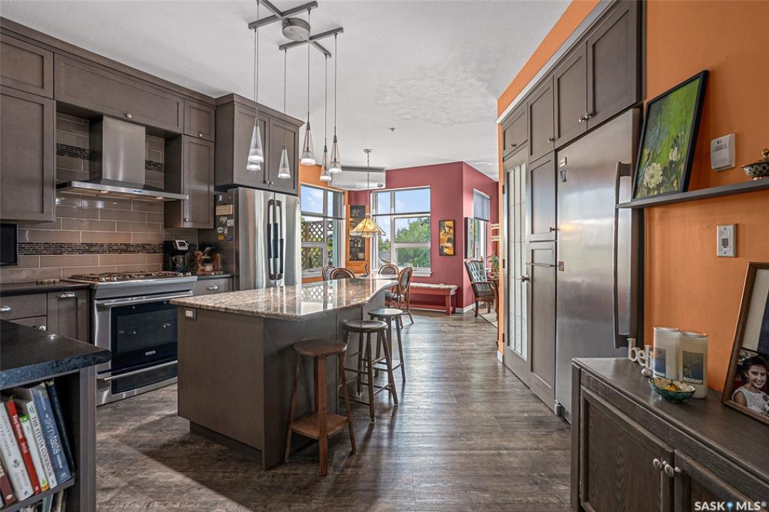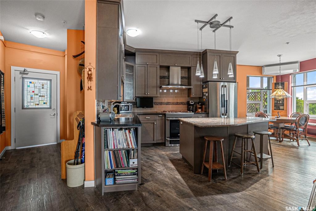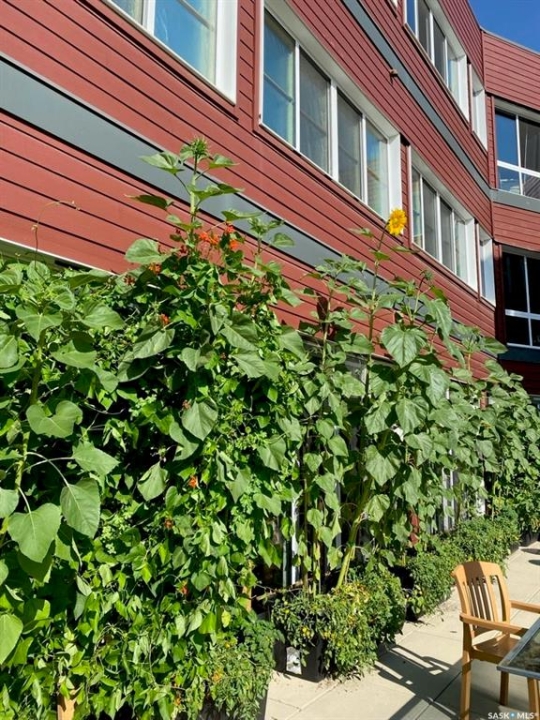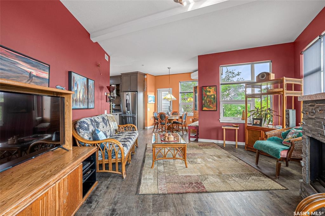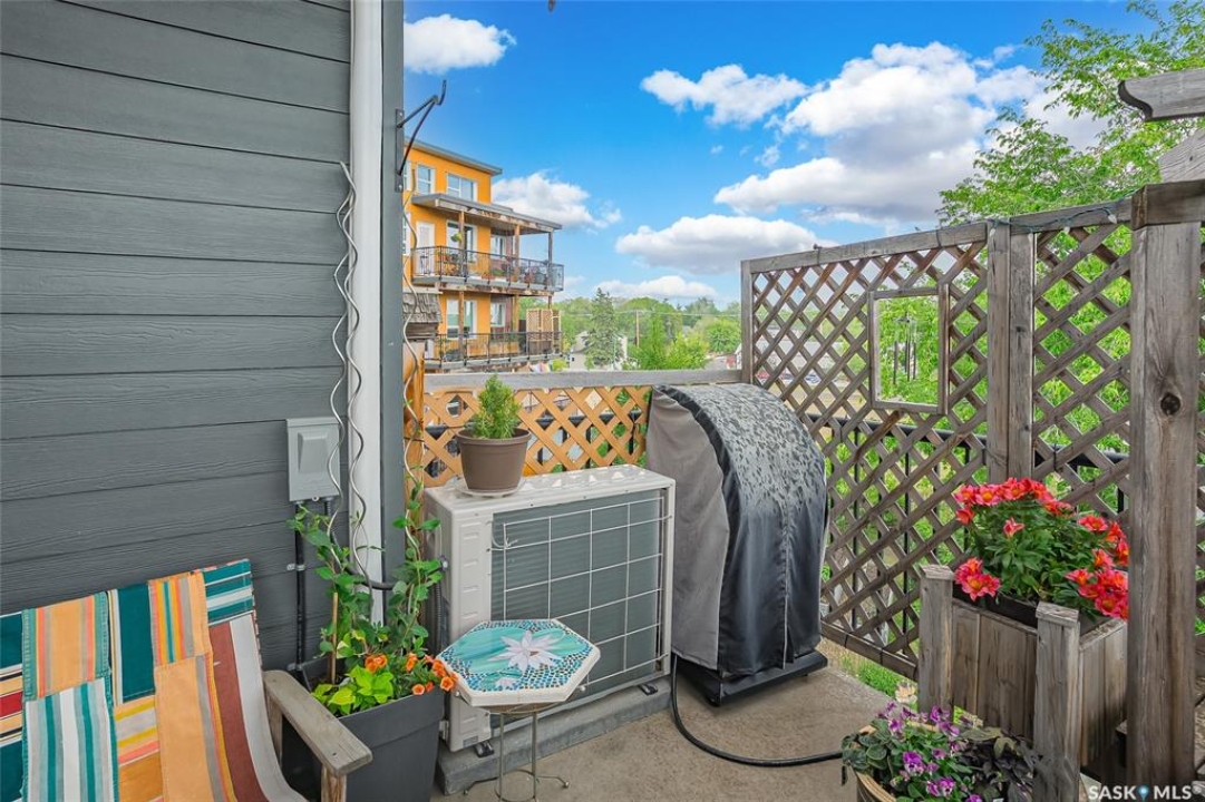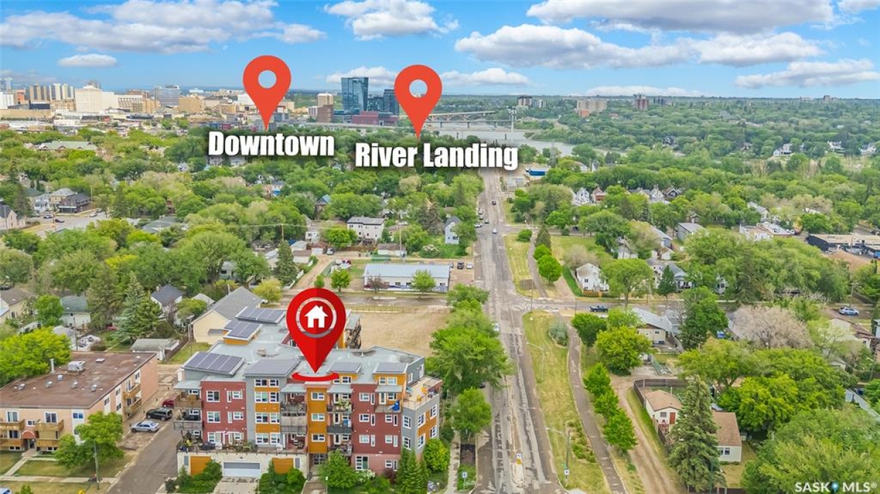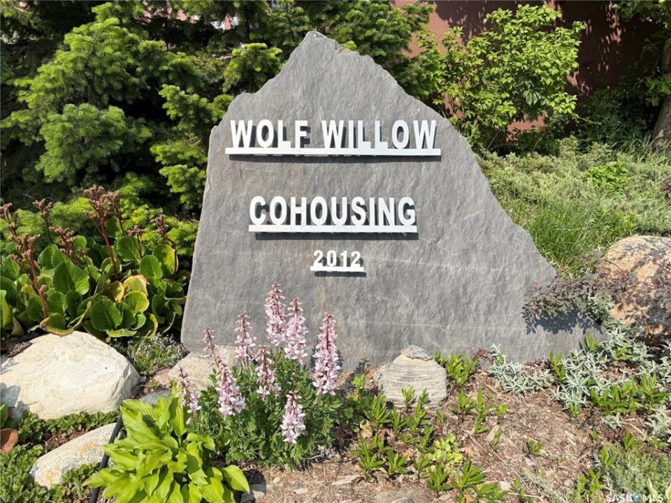This stunning condo exemplifies unique living & luxury with private units, all while fostering community, connection, & creative, purposeful living with like-minded owners. This remarkable unit spans approximately 1,235 sq. ft. & features 3 bdrms (one functioning as a den) & 2 combined 3-piece baths with elegant marmoleum flooring. The 2 main bedrooms have ample space & a walk-thru closet in the master. The kitchen is equipped with high-end custom cabinets, SS appliances, tile backsplash, & an impressive gas range with 2 electric ovens. The spacious island is topped with gorgeous granite, while a stacking washer & dryer are discreetly tucked into the kitchen area for added convenience. The inviting living room is a large crescent-shaped space bathed in sunlight from windows facing 3 directions & enhanced by a stunning gas fireplace. The open-concept layout includes warm earthy paint colors to warm the soul, beautiful laminate floors & adjoining dining area. Step onto the cozy balcony, complete with a natural gas BBQ & handmade wood swing, perfect for enjoying your mornings. Each unit shares ownership of the approximate 5,000 sq. ft of common space, with floor to ceiling windows & in-floor heat, cozy sitting areas & amenities such as a cedar dry sauna, art room, workshop, & exercise room. The dining and kitchen areas of the common lounge serve as the heart of the community hosting numerous events and activities. Double doors lead to a shared patio & beautifully maintained garden space, where residents collaboratively care for the grounds. There are 2 upper decks, one on the 2nd floor & 4th floor. Additional benefits include guest suites for family & friends, secured covered parking, & a smoke-free environment. Partnered with SES Solar Cooperative. This one-of-a-kind community offers an exceptional lifestyle in the heart of downtown, within walking distance of Meewasin Trails & River Landing, shopping & restaurants. More info at www.wolfwillowcohousing.ca