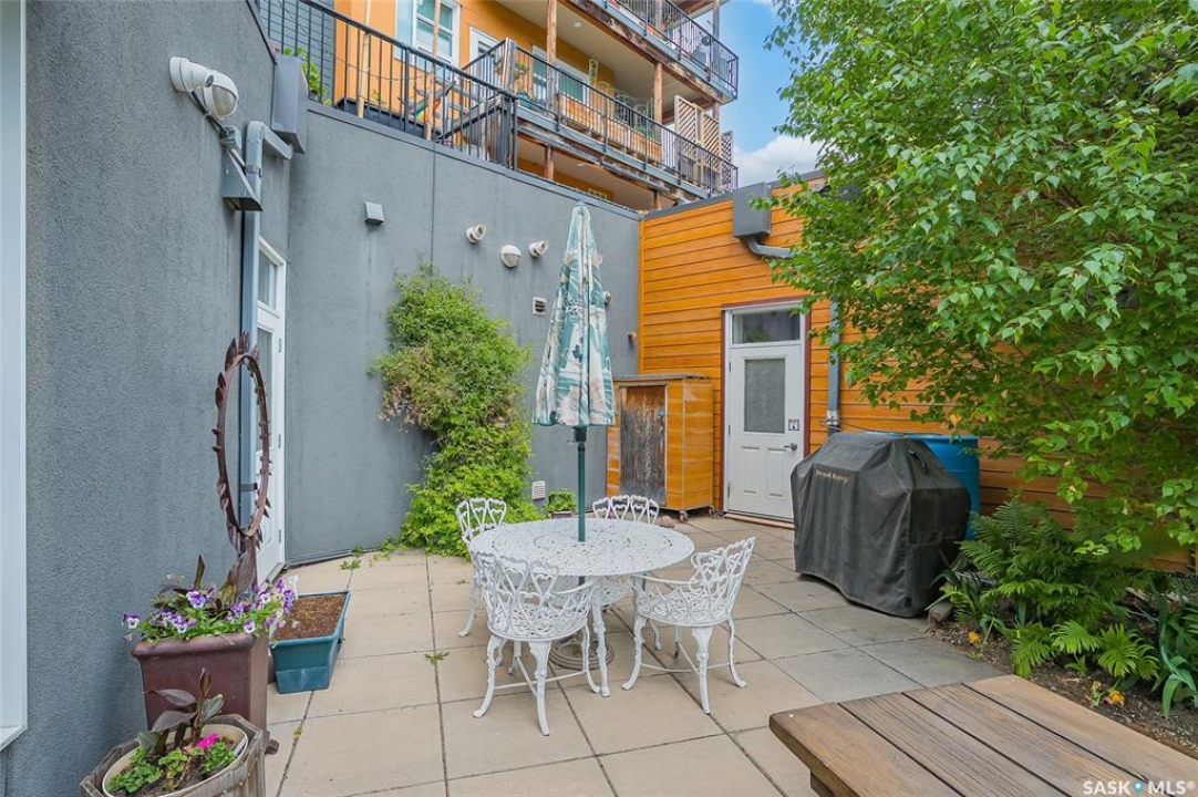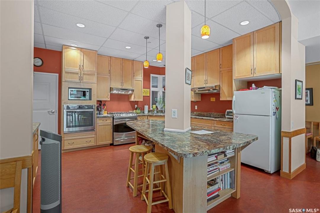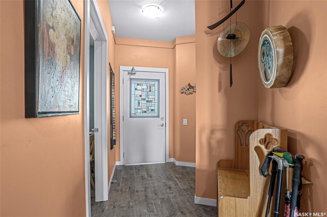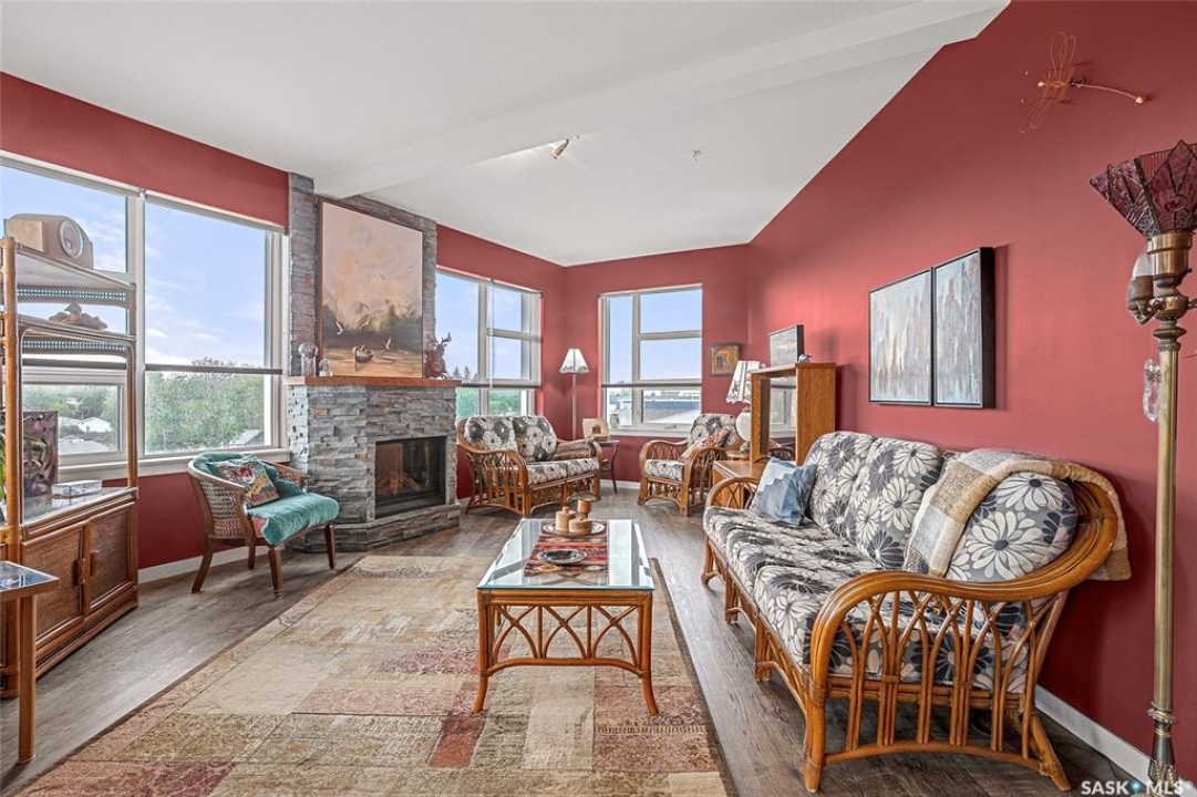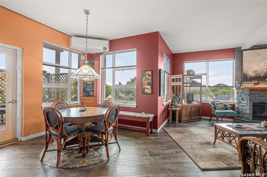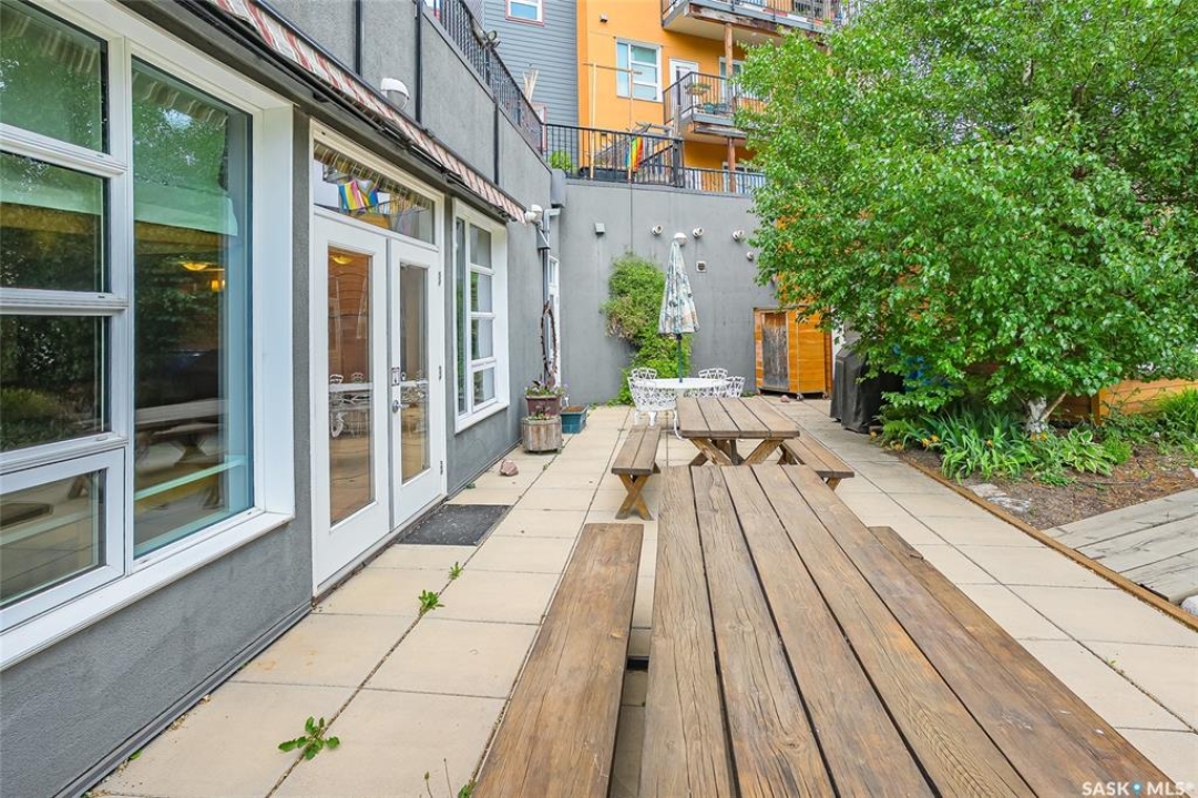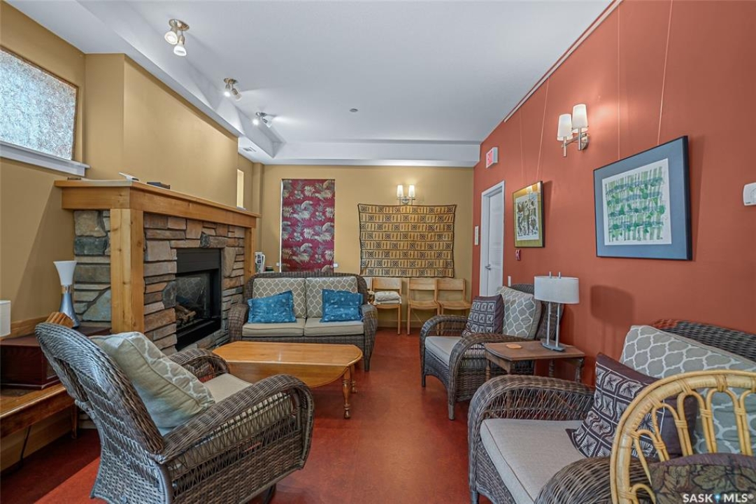 This stunning condo exemplifies unique living & luxury with private units, all while fostering community, connection, & creative, purposeful living with like-minded owners. This remarkable unit spans approximately 1,235 sq. ft. & features 3 bdrms (one functioning as a den) & 2 combined 3-piece baths with elegant marmoleum flooring. The 2 main bedrooms have ample space & a walk-thru closet in the master. The kitchen is equipped with high-end custom cabinets, SS appliances, tile backsplash, & an impressive gas range with 2 electric ovens. The spacious island is topped with gorgeous granite, while a stacking washer & dryer are discreetly tucked into the kitchen area for added convenience. The inviting living room is a large crescent-shaped space bathed in sunlight from windows facing 3 directions & enhanced by a stunning gas fireplace. The open-concept layout includes warm earthy paint colors to warm the soul, beautiful laminate floors & adjoining dining area. Step onto the cozy balcony, complete with a natural gas BBQ & handmade wood swing, perfect for enjoying your mornings. Each unit shares ownership of the approximate 5,000 sq. ft of common space, with floor to ceiling windows & in-floor heat, cozy sitting areas & amenities such as a cedar dry sauna, art room, workshop, & exercise room. The dining and kitchen areas of the common lounge serve as the heart of the community hosting numerous events and activities. Double doors lead to a shared patio & beautifully maintained garden space, where residents collaboratively care for the grounds. There are 2 upper decks, one on the 2nd floor & 4th floor. Additional benefits include guest suites for family & friends, secured covered parking, & a smoke-free environment. Partnered with SES Solar Cooperative. This one-of-a-kind community offers an exceptional lifestyle in the heart of downtown, within walking distance of Meewasin Trails & River Landing, shopping & restaurants. More info at www.wolfwillowcohousing.ca