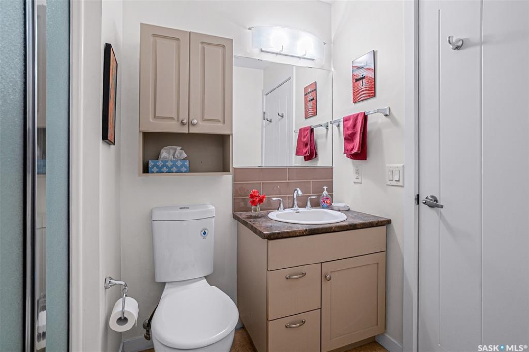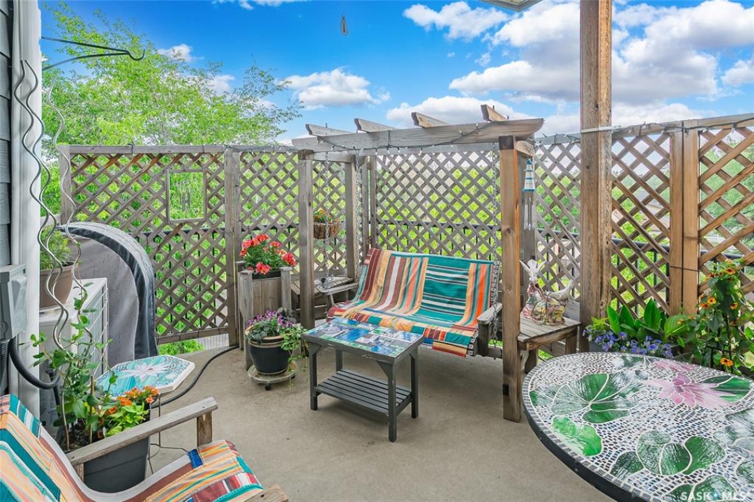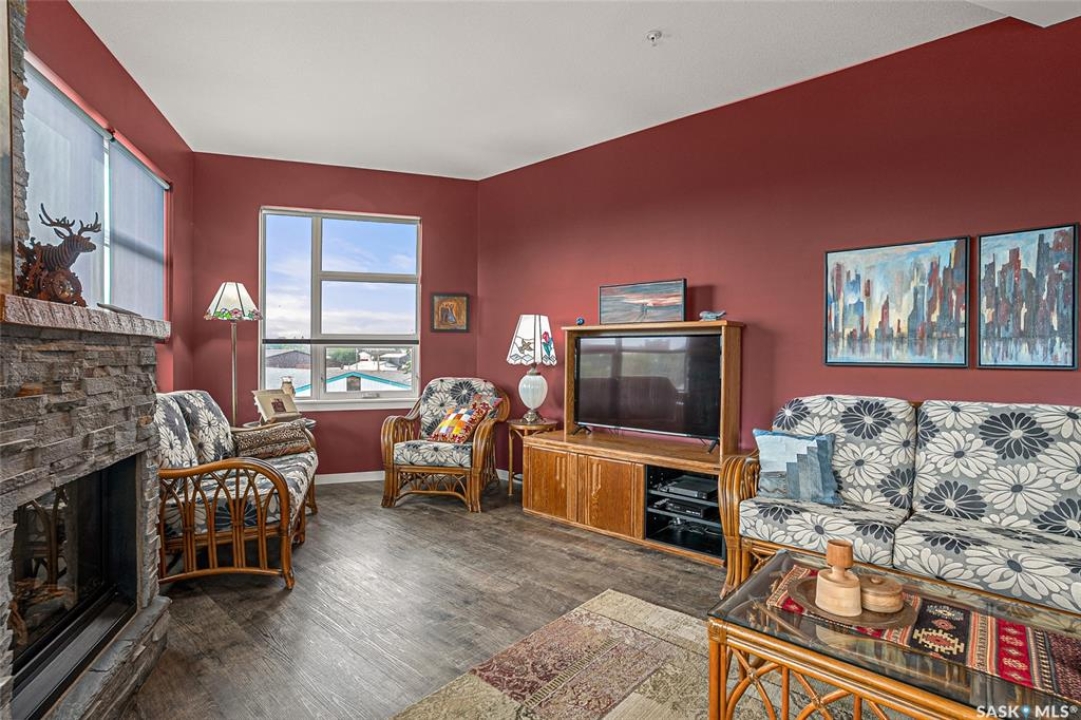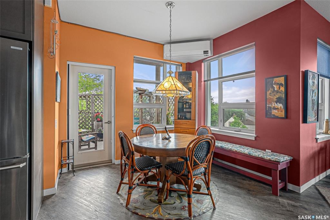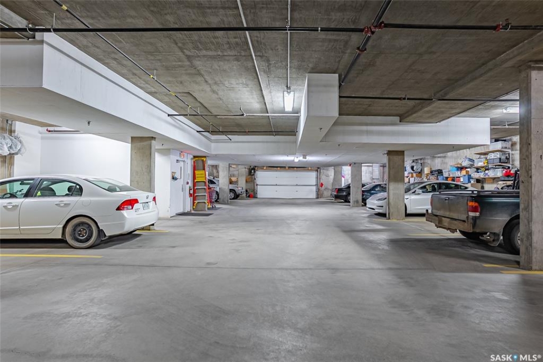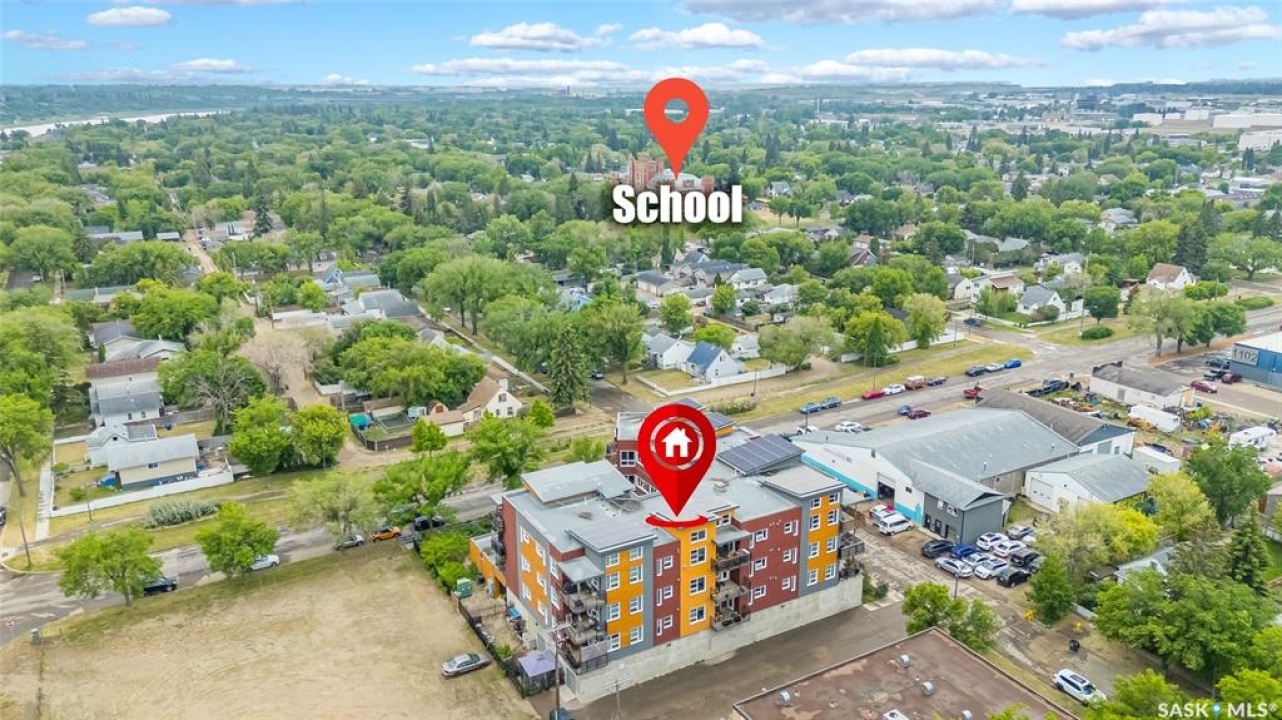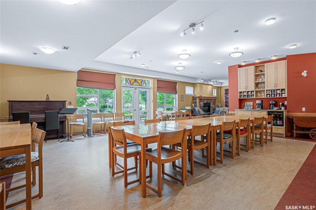 This stunning condo exemplifies unique living & luxury with private units, all while fostering community, connection, & creative, purposeful living with like-minded owners. This remarkable unit spans approximately 1,235 sq. ft. & features 3 bdrms (one functioning as a den) & 2 combined 3-piece baths with elegant marmoleum flooring. The 2 main bedrooms have ample space & a walk-thru closet in the master. The kitchen is equipped with high-end custom cabinets, SS appliances, tile backsplash, & an impressive gas range with 2 electric ovens. The spacious island is topped with gorgeous granite, while a stacking washer & dryer are discreetly tucked into the kitchen area for added convenience. The inviting living room is a large crescent-shaped space bathed in sunlight from windows facing 3 directions & enhanced by a stunning gas fireplace. The open-concept layout includes warm earthy paint colors to warm the soul, beautiful laminate floors & adjoining dining area. Step onto the cozy balcony, complete with a natural gas BBQ & handmade wood swing, perfect for enjoying your mornings. Each unit shares ownership of the approximate 5,000 sq. ft of common space, with floor to ceiling windows & in-floor heat, cozy sitting areas & amenities such as a cedar dry sauna, art room, workshop, & exercise room. The dining and kitchen areas of the common lounge serve as the heart of the community hosting numerous events and activities. Double doors lead to a shared patio & beautifully maintained garden space, where residents collaboratively care for the grounds. There are 2 upper decks, one on the 2nd floor & 4th floor. Additional benefits include guest suites for family & friends, secured covered parking, & a smoke-free environment. Partnered with SES Solar Cooperative. This one-of-a-kind community offers an exceptional lifestyle in the heart of downtown, within walking distance of Meewasin Trails & River Landing, shopping & restaurants. More info at www.wolfwillowcohousing.ca