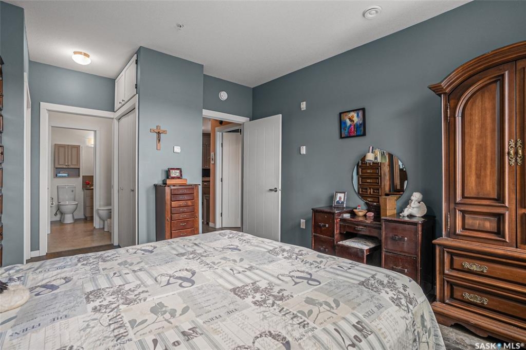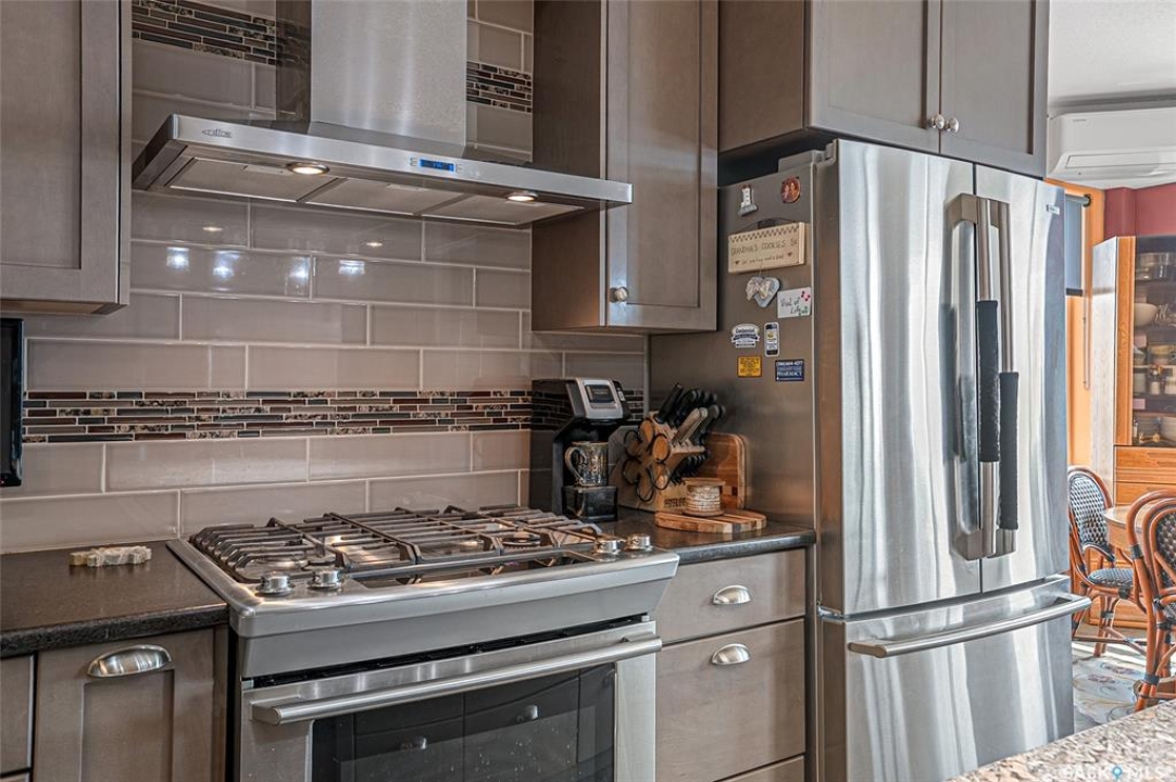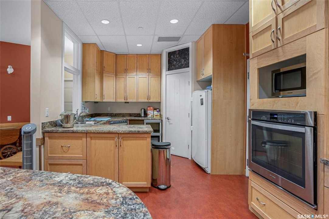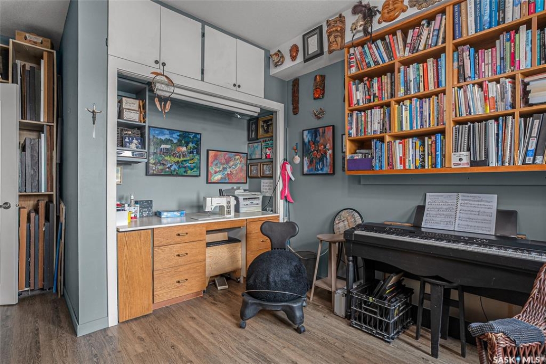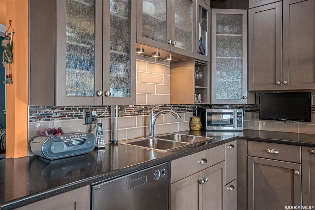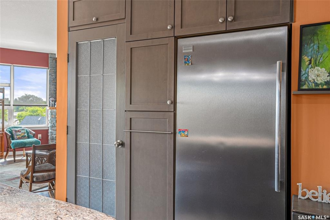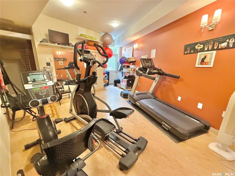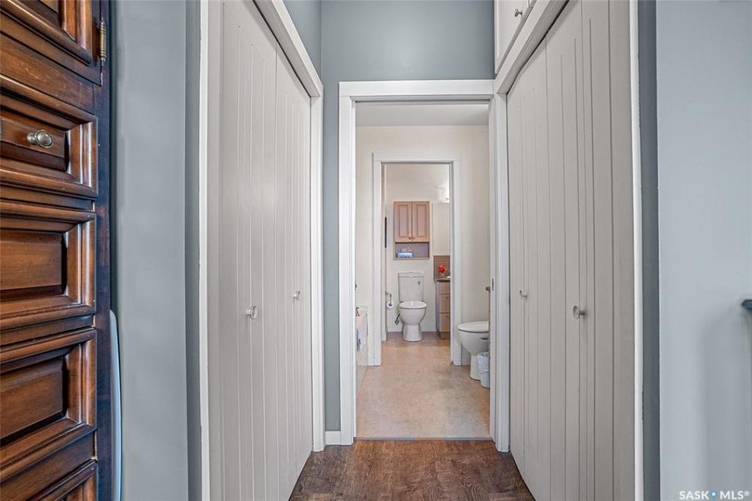 This stunning condo exemplifies unique living & luxury with private units, all while fostering community, connection, & creative, purposeful living with like-minded owners. This remarkable unit spans approximately 1,235 sq. ft. & features 3 bdrms (one functioning as a den) & 2 combined 3-piece baths with elegant marmoleum flooring. The 2 main bedrooms have ample space & a walk-thru closet in the master. The kitchen is equipped with high-end custom cabinets, SS appliances, tile backsplash, & an impressive gas range with 2 electric ovens. The spacious island is topped with gorgeous granite, while a stacking washer & dryer are discreetly tucked into the kitchen area for added convenience. The inviting living room is a large crescent-shaped space bathed in sunlight from windows facing 3 directions & enhanced by a stunning gas fireplace. The open-concept layout includes warm earthy paint colors to warm the soul, beautiful laminate floors & adjoining dining area. Step onto the cozy balcony, complete with a natural gas BBQ & handmade wood swing, perfect for enjoying your mornings. Each unit shares ownership of the approximate 5,000 sq. ft of common space, with floor to ceiling windows & in-floor heat, cozy sitting areas & amenities such as a cedar dry sauna, art room, workshop, & exercise room. The dining and kitchen areas of the common lounge serve as the heart of the community hosting numerous events and activities. Double doors lead to a shared patio & beautifully maintained garden space, where residents collaboratively care for the grounds. There are 2 upper decks, one on the 2nd floor & 4th floor. Additional benefits include guest suites for family & friends, secured covered parking, & a smoke-free environment. Partnered with SES Solar Cooperative. This one-of-a-kind community offers an exceptional lifestyle in the heart of downtown, within walking distance of Meewasin Trails & River Landing, shopping & restaurants. More info at www.wolfwillowcohousing.ca
