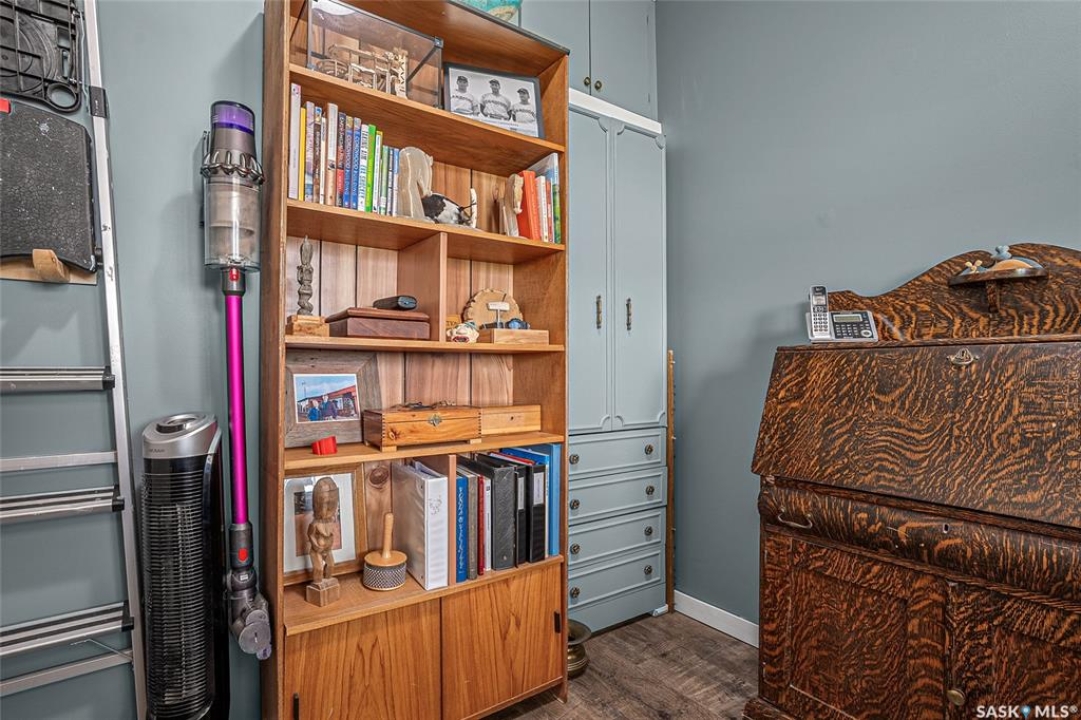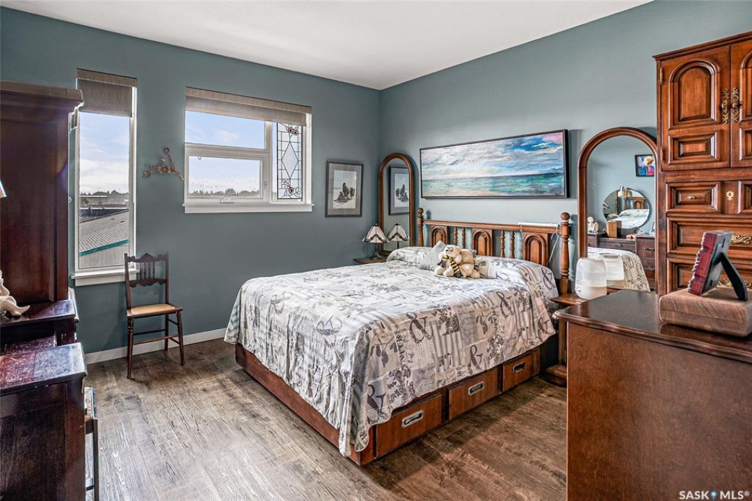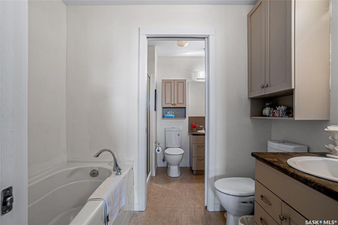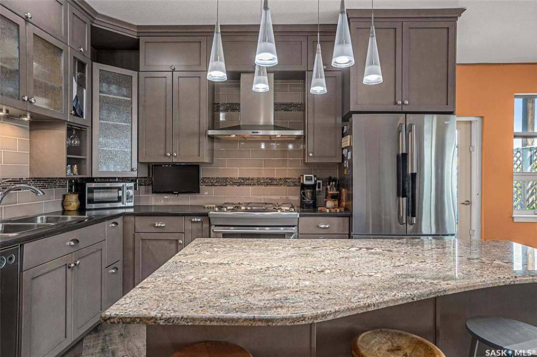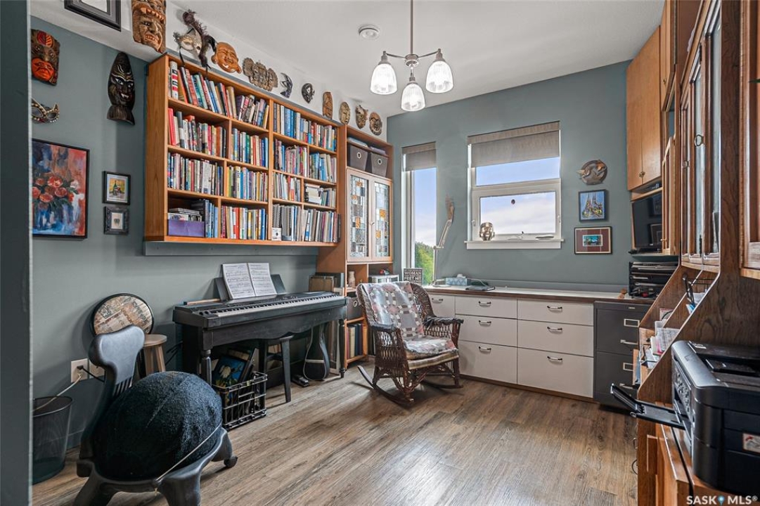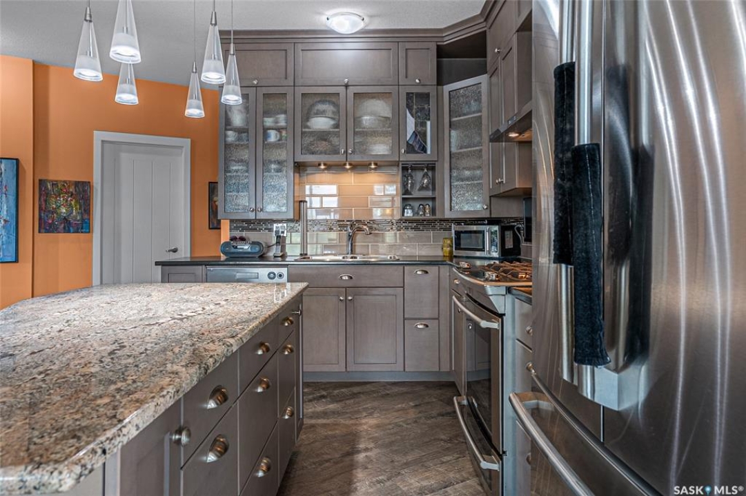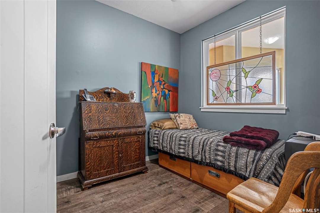 This stunning condo exemplifies unique living & luxury with private units, all while fostering community, connection, & creative, purposeful living with like-minded owners. This remarkable unit spans approximately 1,235 sq. ft. & features 3 bdrms (one functioning as a den) & 2 combined 3-piece baths with elegant marmoleum flooring. The 2 main bedrooms have ample space & a walk-thru closet in the master. The kitchen is equipped with high-end custom cabinets, SS appliances, tile backsplash, & an impressive gas range with 2 electric ovens. The spacious island is topped with gorgeous granite, while a stacking washer & dryer are discreetly tucked into the kitchen area for added convenience. The inviting living room is a large crescent-shaped space bathed in sunlight from windows facing 3 directions & enhanced by a stunning gas fireplace. The open-concept layout includes warm earthy paint colors to warm the soul, beautiful laminate floors & adjoining dining area. Step onto the cozy balcony, complete with a natural gas BBQ & handmade wood swing, perfect for enjoying your mornings. Each unit shares ownership of the approximate 5,000 sq. ft of common space, with floor to ceiling windows & in-floor heat, cozy sitting areas & amenities such as a cedar dry sauna, art room, workshop, & exercise room. The dining and kitchen areas of the common lounge serve as the heart of the community hosting numerous events and activities. Double doors lead to a shared patio & beautifully maintained garden space, where residents collaboratively care for the grounds. There are 2 upper decks, one on the 2nd floor & 4th floor. Additional benefits include guest suites for family & friends, secured covered parking, & a smoke-free environment. Partnered with SES Solar Cooperative. This one-of-a-kind community offers an exceptional lifestyle in the heart of downtown, within walking distance of Meewasin Trails & River Landing, shopping & restaurants. More info at www.wolfwillowcohousing.ca