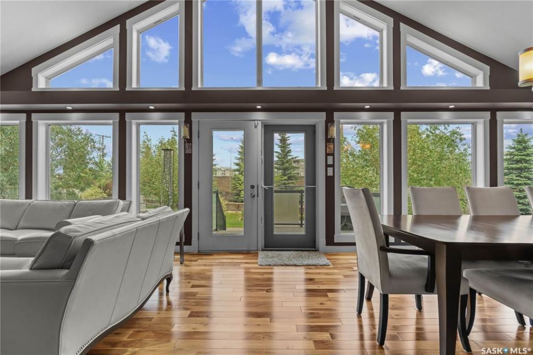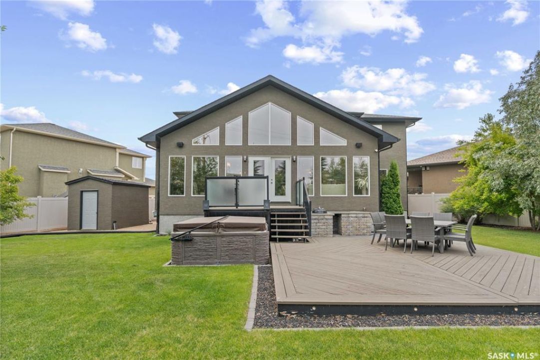 Stunning home in the Creeks was voted Best Custom Home under 2400 sq/ft in 2012 by the Regina Home Builders Association. Built by Stahhman Homes, attention to detail is on display. Exceptional street appeal with stone exterior, wide concrete step to a covered veranda. Step inside to a welcoming tiled entrance which is anchored by the gorgeous main floor office that measures 12 x 12. Carefully designed kitchen is positioned to entertain by overlooking the living room, dining room and views of the park-like backyard. The kitchen features custom stained maple cabinetry, granite countertops, gas range stove, stainless steel appliances and flanked by a convenient butler's pantry. Gorgeous tigerwood walnut flooring provides warm luxurious feel. Second level showcases 3 bedrooms including a large primary bedroom with in-ceiling speakers, a spa-like ensuite with ceramic tiled floor, 5 foot tiled walk in shower, jetted tub. Basement is nearly finished and just needs some finishing touches to make it your own. 4th bedroom, rec-room and 3 piece bathroom. Step outside and be WOWED by the meticulously cared for backyard (27 trees planted!), outdoor kitchen, wood burning firepit and smoker. Storage shed has power to it. Underground sprinklers front and back.
