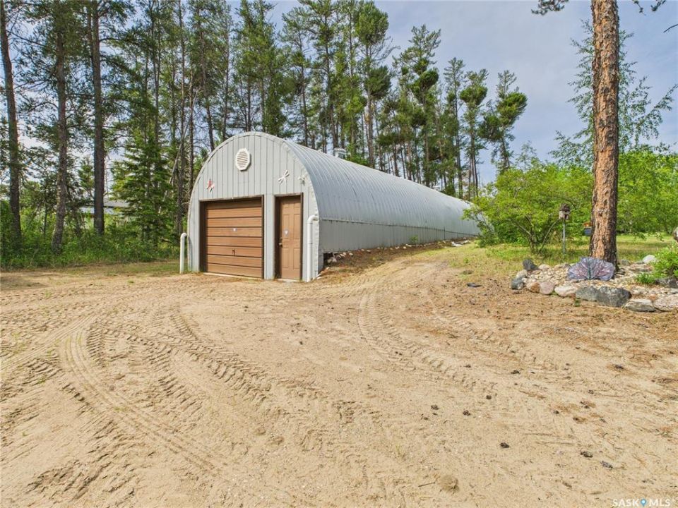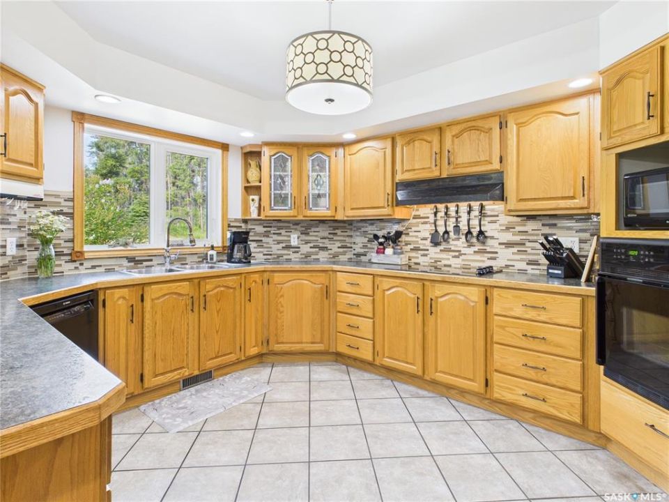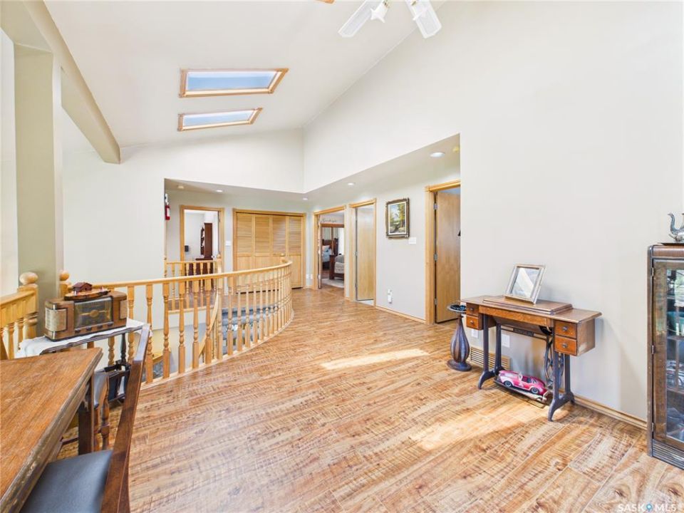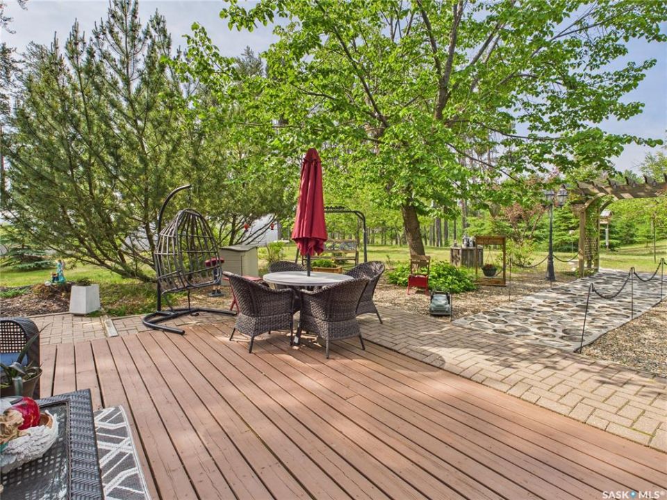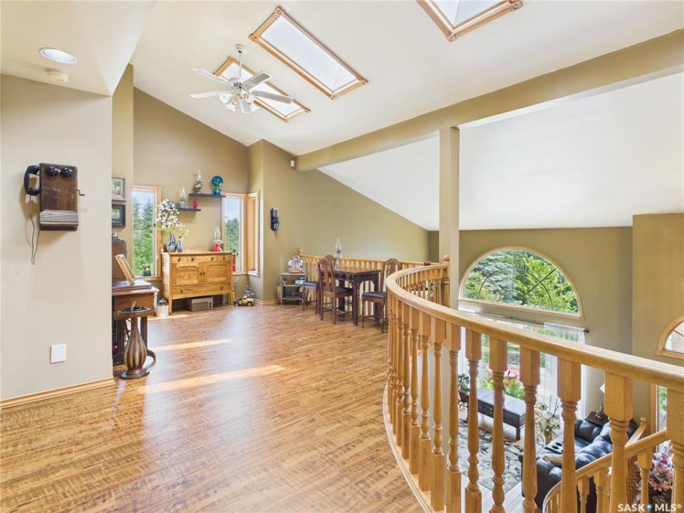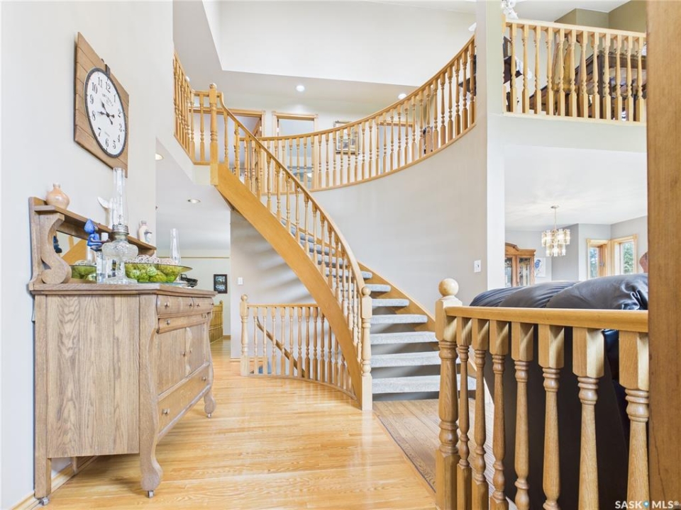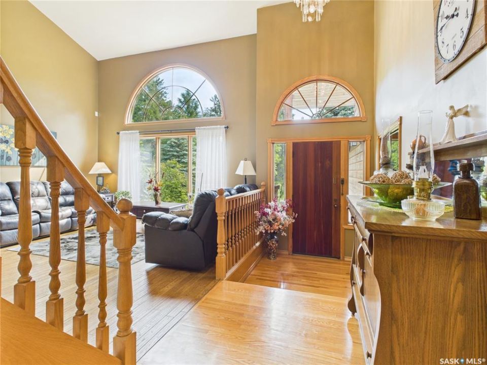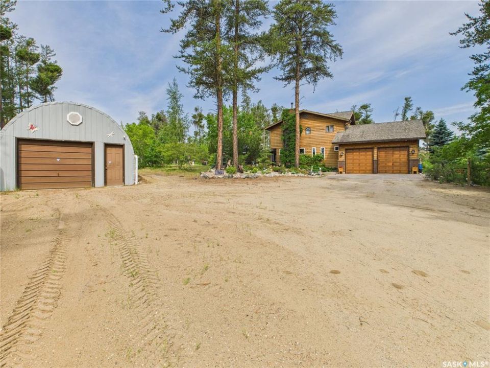 Welcome to this stunning 5-acre property just 7.7 km from Prince Albert, where timeless craftsmanship meets peaceful country living. Tucked behind a canopy of mature trees, this beautifully maintained 2,732 sq ft home offers the perfect blend of privacy, space, and high-end finishes, all just minutes from the city, Red Wing School, and Mark's 9 Golf Course. With 2,732 sq ft of living space, this home has been thoughtfully designed and cared for. A curved staircase makes a stunning first impression as you enter the foyer, and from there, the main floor opens up with both formal and casual living and dining spaces, a den, a 2-piece bath, main floor laundry (with a laundry chute from upstairs!), and direct entry to the double attached garage. The kitchen is filled with custom cabinetry and plenty of prep space overlooking the casual dining area that flows into the sunken family room - perfect for game nights or cozy evenings in. Upstairs, the primary suite features two walk-in closets and a spacious ensuite with double sinks and a combined tub and shower. Two additional bedrooms, a 4 piece bathroom, and a large open loft with skylights complete the upper level, offering a flexible space with a view over the formal living room below. The basement includes a large rec room, a bathroom, and an abundance of storage space for whatever your lifestyle needs. Outside, the cedar shakes and siding add to the home's timeless charm. Interlocking brick paths run from front to back and connect to a generous pad in front of the garage. The yard is extremely private—lined with mature trees and full of quiet corners to relax and enjoy nature. A heated and powered workshop gives you space for hobbies or extra storage, and there's also a Quonset for all the toys. This property is perfect for nature lovers, families looking for room to grow, or anyone craving peaceful country living with high-end touches and city convenience just down the road.