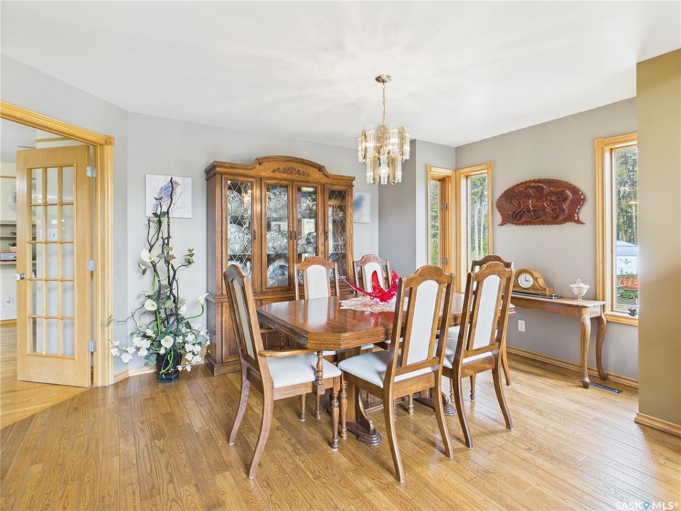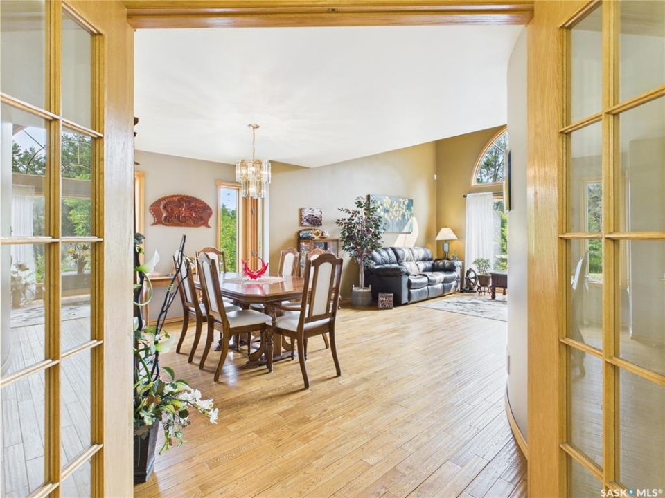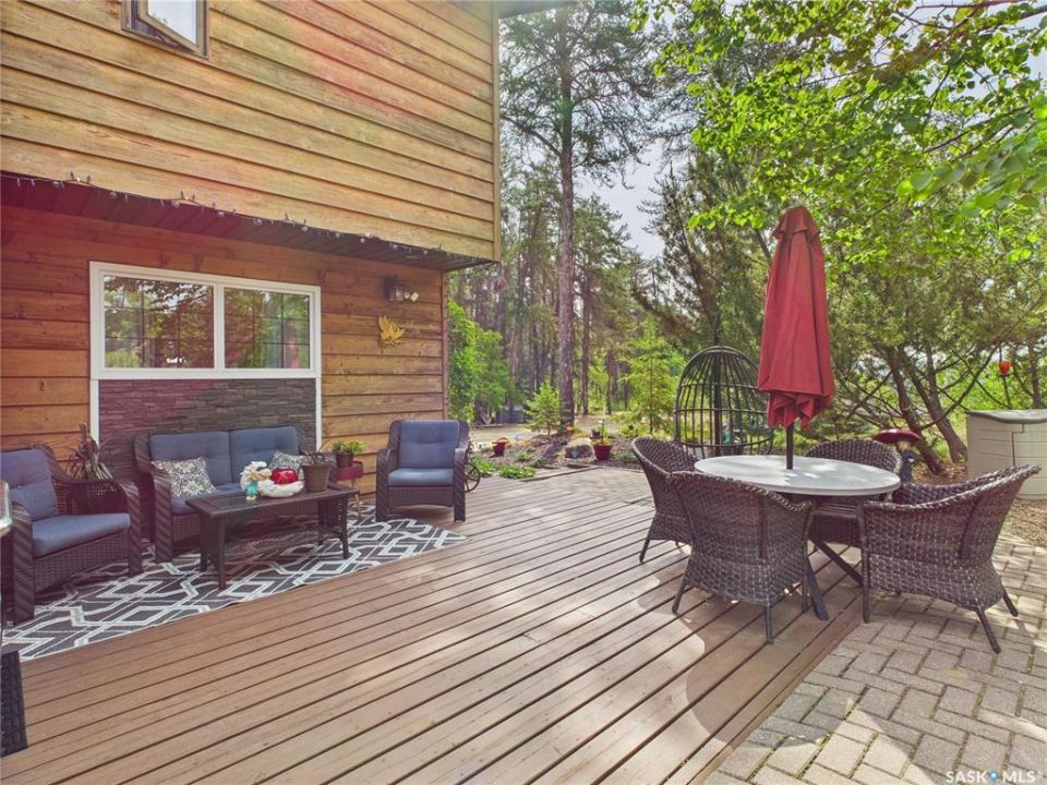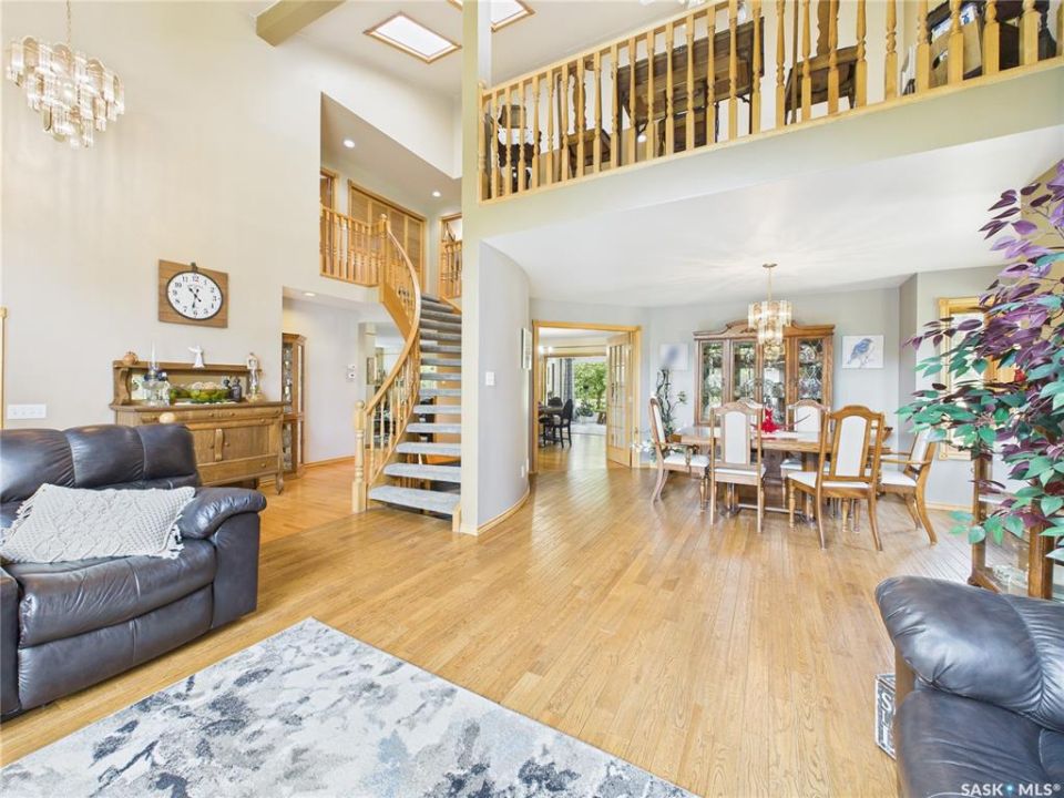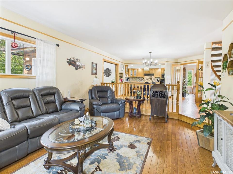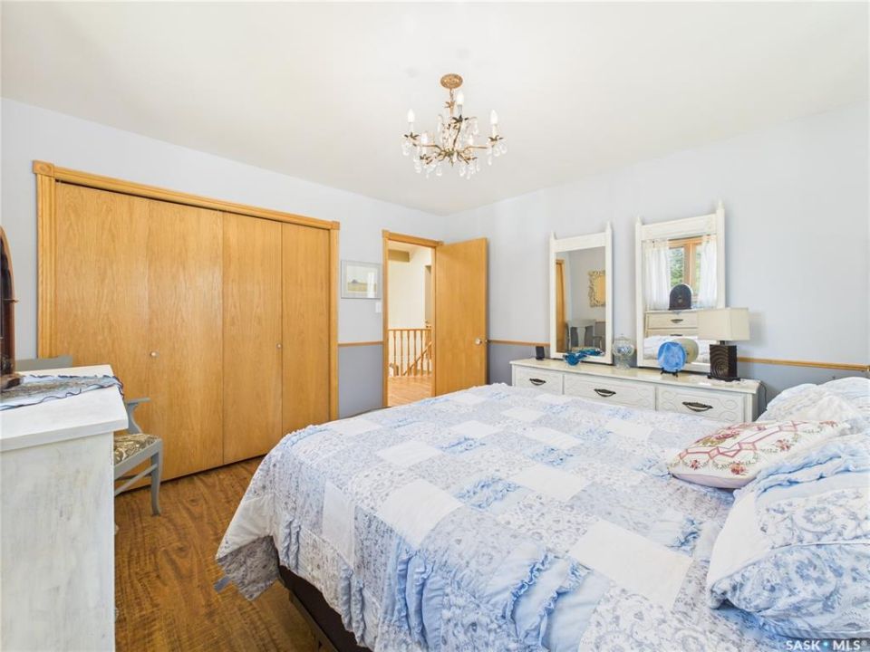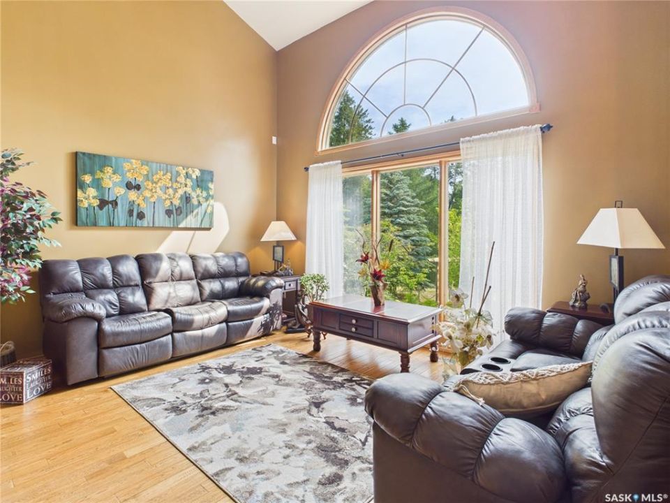 Welcome to this stunning 5-acre property just 7.7 km from Prince Albert, where timeless craftsmanship meets peaceful country living. Tucked behind a canopy of mature trees, this beautifully maintained 2,732 sq ft home offers the perfect blend of privacy, space, and high-end finishes, all just minutes from the city, Red Wing School, and Mark's 9 Golf Course. With 2,732 sq ft of living space, this home has been thoughtfully designed and cared for. A curved staircase makes a stunning first impression as you enter the foyer, and from there, the main floor opens up with both formal and casual living and dining spaces, a den, a 2-piece bath, main floor laundry (with a laundry chute from upstairs!), and direct entry to the double attached garage. The kitchen is filled with custom cabinetry and plenty of prep space overlooking the casual dining area that flows into the sunken family room - perfect for game nights or cozy evenings in. Upstairs, the primary suite features two walk-in closets and a spacious ensuite with double sinks and a combined tub and shower. Two additional bedrooms, a 4 piece bathroom, and a large open loft with skylights complete the upper level, offering a flexible space with a view over the formal living room below. The basement includes a large rec room, a bathroom, and an abundance of storage space for whatever your lifestyle needs. Outside, the cedar shakes and siding add to the home's timeless charm. Interlocking brick paths run from front to back and connect to a generous pad in front of the garage. The yard is extremely private—lined with mature trees and full of quiet corners to relax and enjoy nature. A heated and powered workshop gives you space for hobbies or extra storage, and there's also a Quonset for all the toys. This property is perfect for nature lovers, families looking for room to grow, or anyone craving peaceful country living with high-end touches and city convenience just down the road.