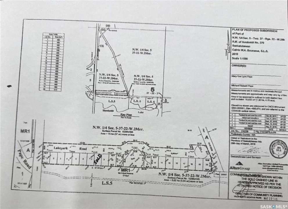 19 Vacant Interior RV lots on North Side of Humboldt Lake! Enjoy lake living on these private lots with limited traffic as there is no through road. Each lot is .11 acre. Culverts and driveways have been installed and trees planted. Lots have 100 amp power to property line for each lot. Three lots have power boxes on them (lot 3, 14, 16). Some building restrictions apply. Buyer to sign Servicing Agreement with Pape Holdings Inc.. Buyer responsible for utility hookup costs. Buyer is responsible for septic holding tank cost and install. Buyers to consult with RM of Humboldt regarding building guidelines and approval. There is a limited number of water rights that could be purchased at an additional cost. Minutes from the City of Humboldt and approx. 50 min from the BHP Jansen Potash Mine site. Call today for more information!