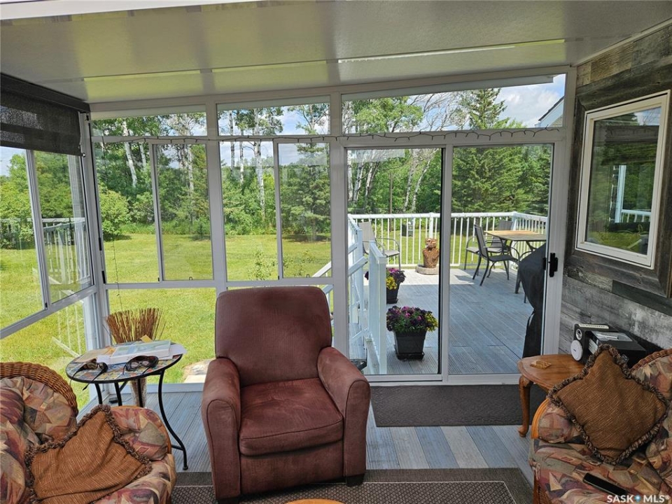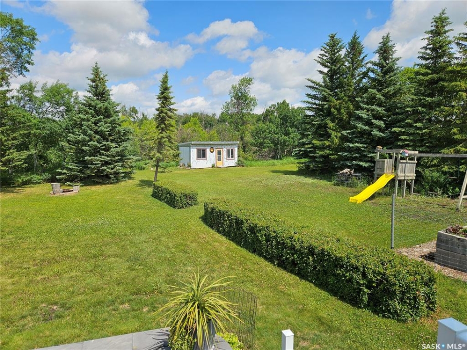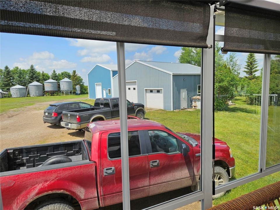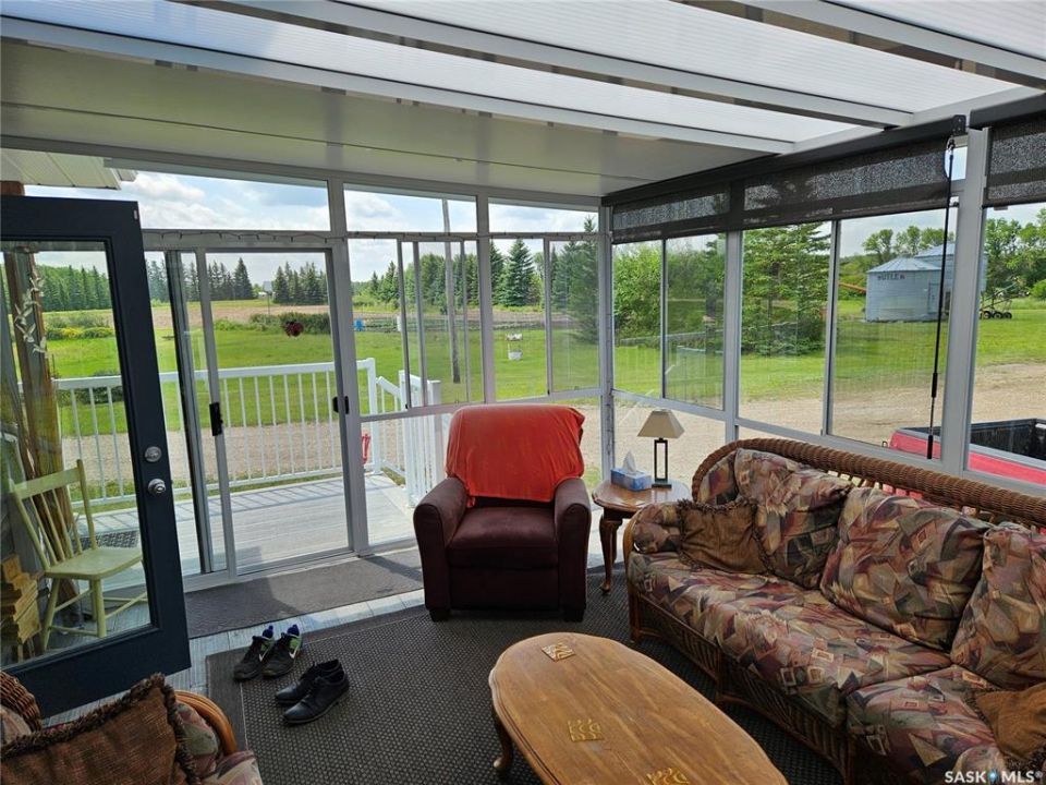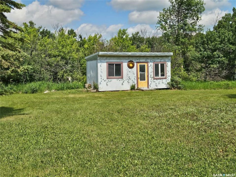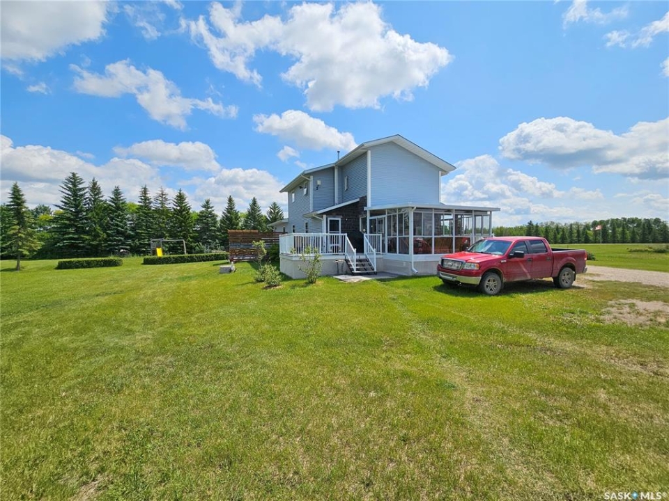 Welcome to this fabulous 19.1 acreage with 2,300 sf of home. The house boasts 3 bedrooms up and an additional bedroom in the finished basement. New kitchen and an addition to the living area on the main that allows for lots of room for a growing family. The 3 season sun room is a great way to start and end your day. The deck in back has a hot tub for total relaxation watching the sunset, overlooking a great yard and raised garden area. The two outbuilding are a 32' x 36' insulated shop with a wood burning stove, and a 40' x 70' split half farm equipment storage, and half for a honey processing facility that is isolated and complete with a 2 piece washroom. The shelter belt is well treed with walking trails around the property. This property and house have been very meticulously cared for and is only 15 minutes from the City of Regina.