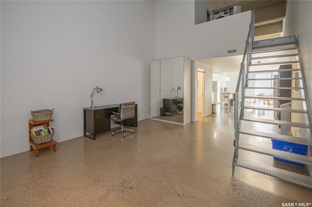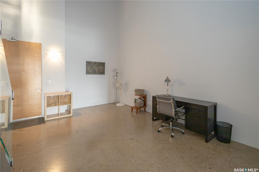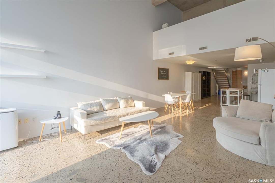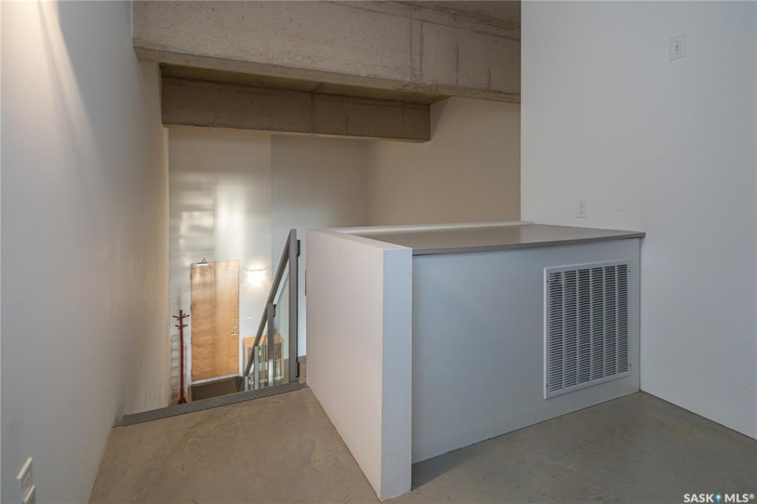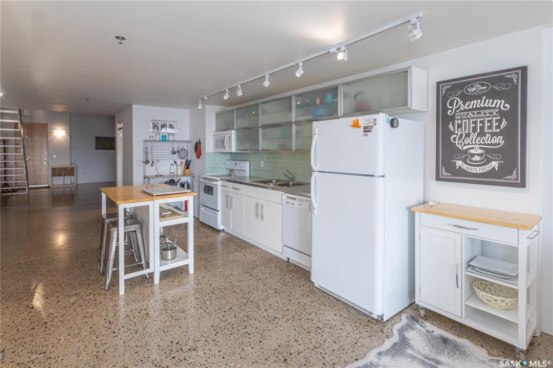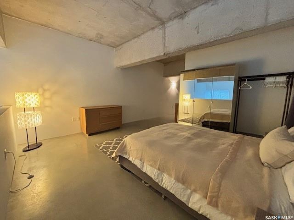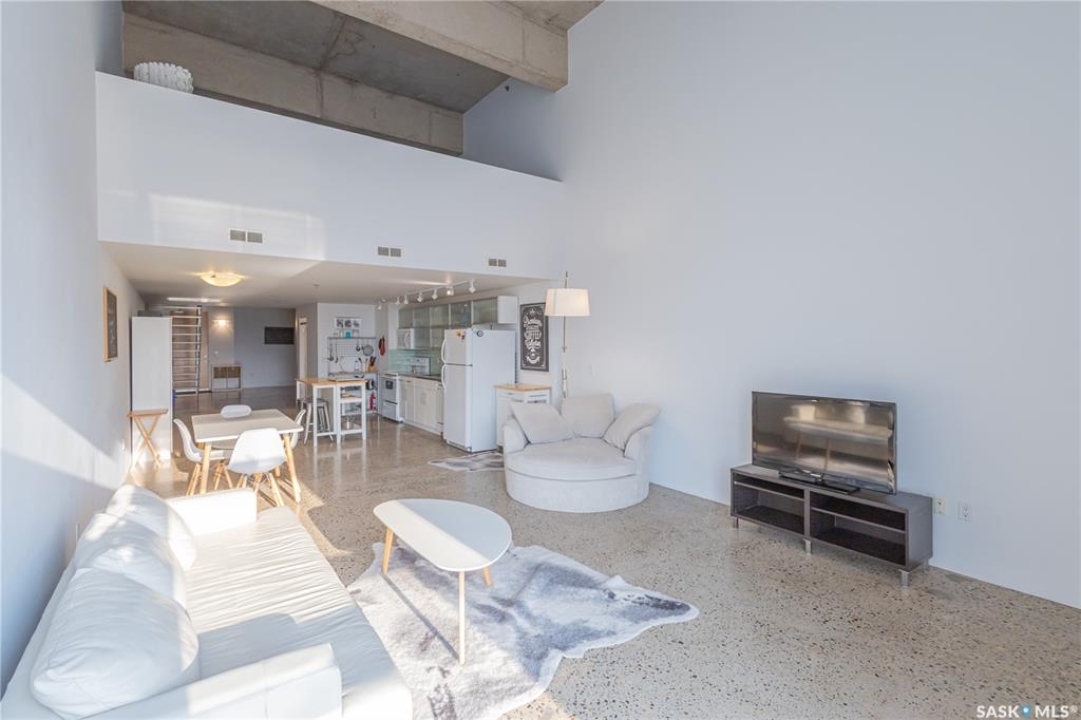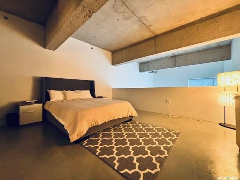 Experience the best of downtown living in this spacious and modern 1,268 sq ft loft condo, located in the sought-after 2nd Ave Lofts. With its industrial-chic design, polished concrete floors, stainless steel accents, and soaring ceilings, this 4th floor unit blends urban style with everyday comfort. The open-concept layout features a sleek kitchen with a center island perfect for entertaining. Upstairs features a large open loft bedroom, a 4 pc bathroom and laundry. A 2nd bedroom could be added to the left of the foyer. The building itself is just as impressive, with open-air corridors, accented by glass railings, a dramatic skylight-filled atrium, and a contemporary lobby that makes a statement. Enjoy the rooftop terrace complete with a pergola-covered BBQ area, perfect for relaxing or hosting friends. Additional perks include a fitness centre, elevator, and secure underground heated parking. One underground parking stall included. Quick possession is available, just move in and start enjoying downtown living at its finest! Condo fees include power and heat! Buyer/Buyer's Agent to verify all measurements. Call to book your viewing today.