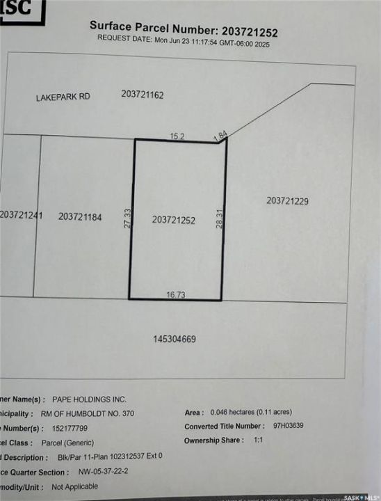 Enjoy lake living on this lot. The Seasonal lot is .11 acre. Culverts and driveways have been installed and trees planted. Lot has 100 amp power to property line. Buyer to sign Servicing Agreement with Pape Holdings Inc.. Buyer responsible for utility hookup costs. Buyer is responsible for septic holding tank cost and install. Buyers to consult with RM of Humboldt regarding building guidelines and approval. Minutes from the City of Humboldt and approx. 50 min from the BHP Jansen Potash Mine site. Call today for more information!