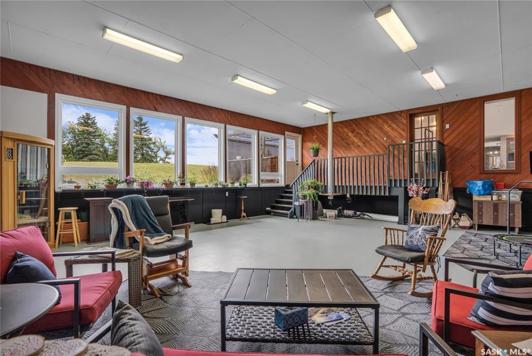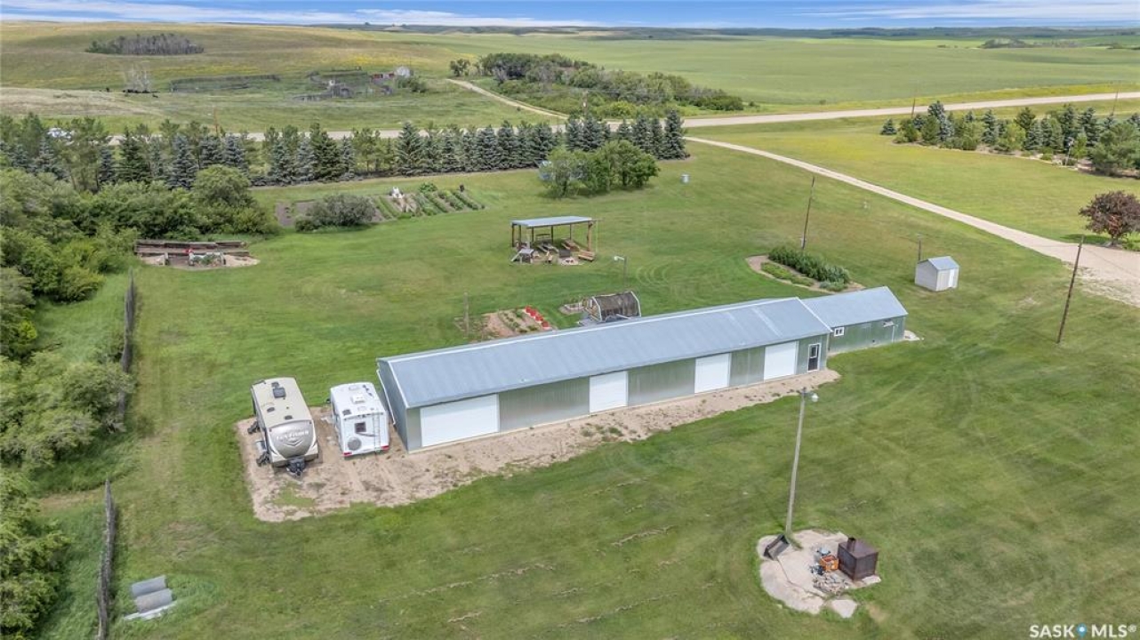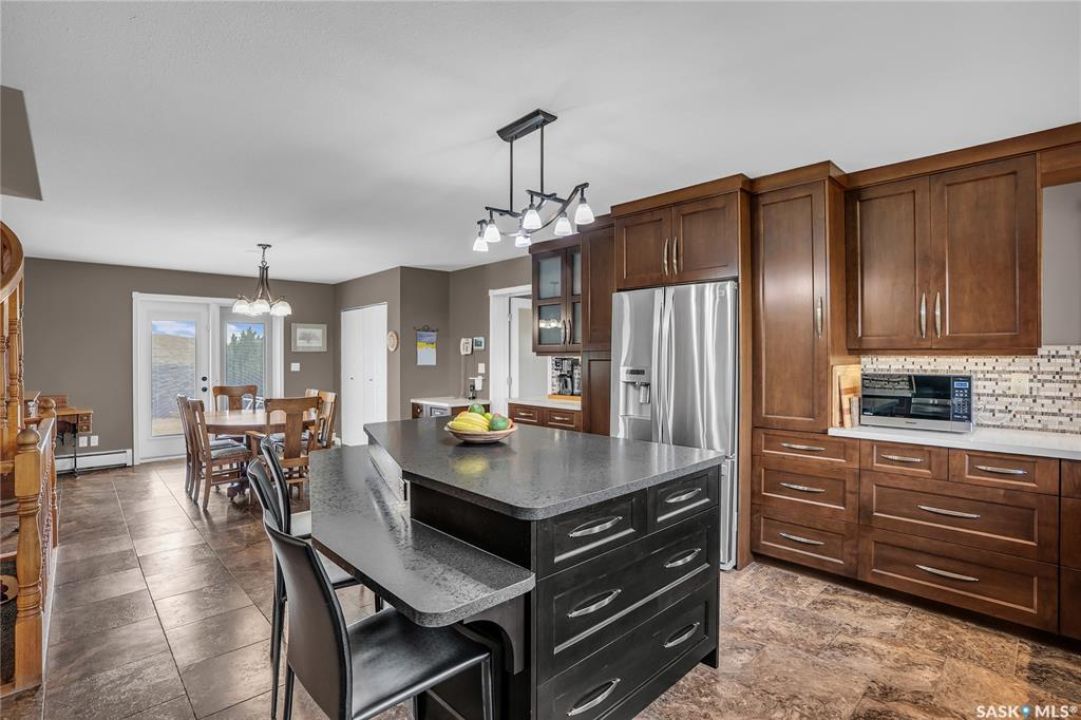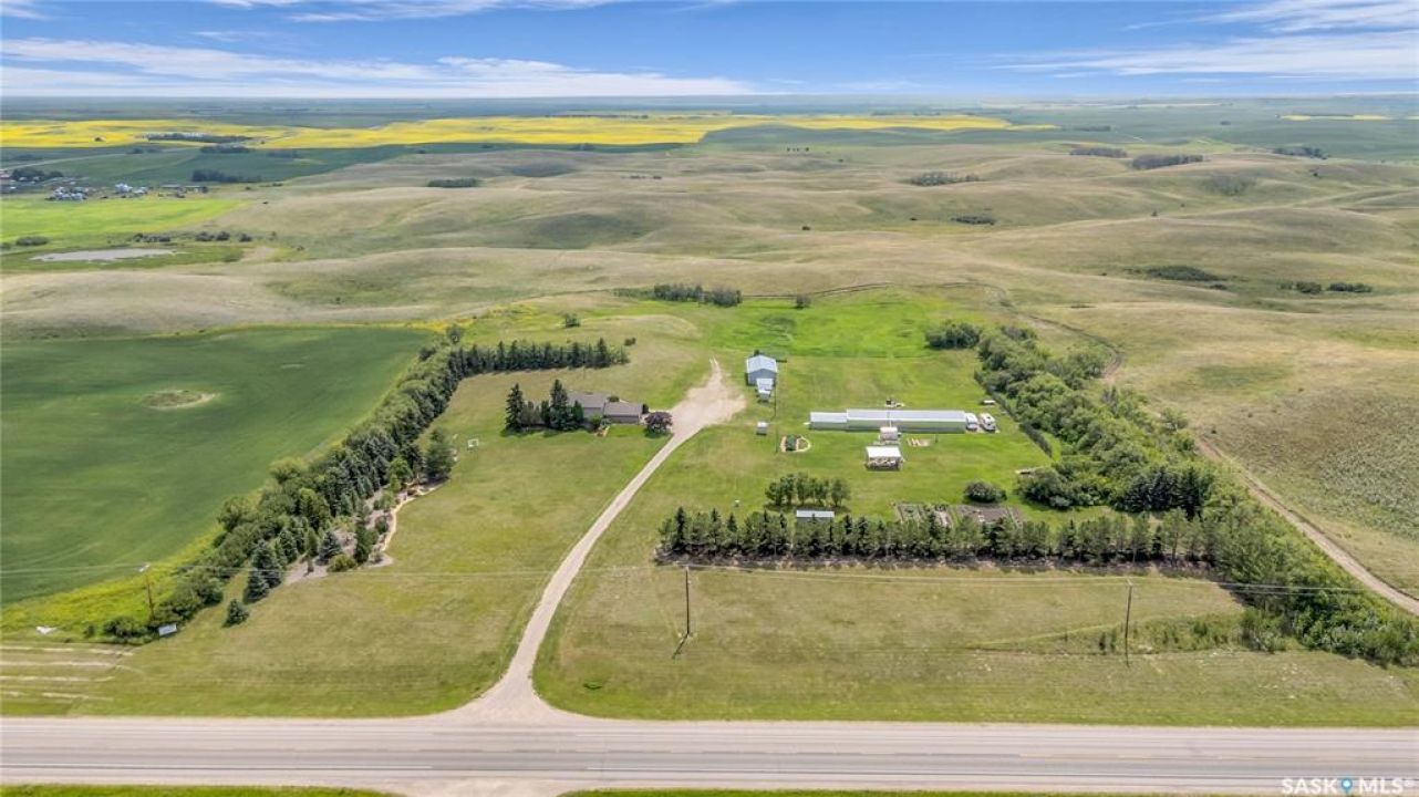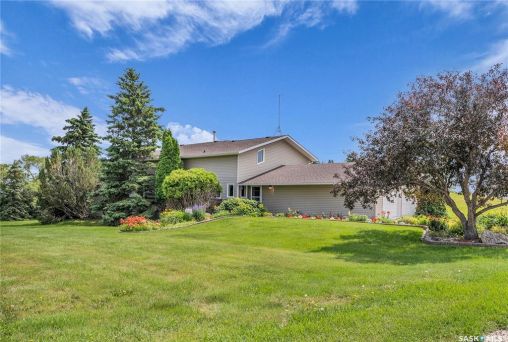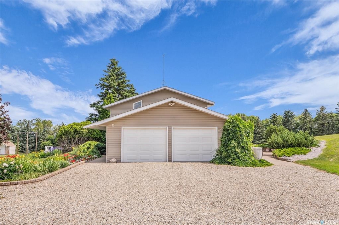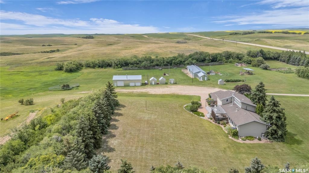 Discover this uniquely designed acreage home, nestled in the hills and thoughtfully crafted by the original owner. Offering nearly 3,000 sqft of total living space with approx 144 acres of pasture land, this home is ideal for families, home-based businesses, or anyone seeking space, privacy, and character. The main floor boasts a spacious updated kitchen with abundant cabinetry, stainless steel appliances, and open layout perfect for entertaining. Hickory hardwood floors and vaulted ceilings create an inviting living space, complemented by built-in cabinetry and custom features throughout. There is an impressive 26' x 32' bonus room—ideal as a family room, studio, office, or could easily be converted into additional bedrooms. An additional bedroom/office is located on the main. The 4-piece bathroom features an air jet tub, and the generous mudroom/laundry area includes a convenient powder room and direct access to the insulated garage. A spiral staircase leads to the luxurious 600 sq ft primary suite with a 3-piece ensuite and extended vanity. A fully developed basement offers two more bedrooms, a full bathroom, and separate entry through the garage or the main house—great for extended family or guests. Outside, enjoy the 14'x48' cedar deck with pergola covering, perfect for relaxing or entertaining with scenic views and peaceful walking paths. Outbuildings are extensive and include a 25'x50' insulated and finished garage/shop combo, a 16'x30' heated barn/workshop with concrete floor and power, a massive 25'x110' storage shed with multiple garage doors (including a 12' door) and ample shelving, plus several other storage buildings and a 24'x8' garden shed. Additional features include a covered fire pit area, children's playhouse and swings, gravelled RV parking, and a fenced lagoon. Recent updates include new kitchen cabinets, backsplash, and main floor flooring (2013), and a new water heater (2025). Heating is provided by an efficient boiler furnace. View today!