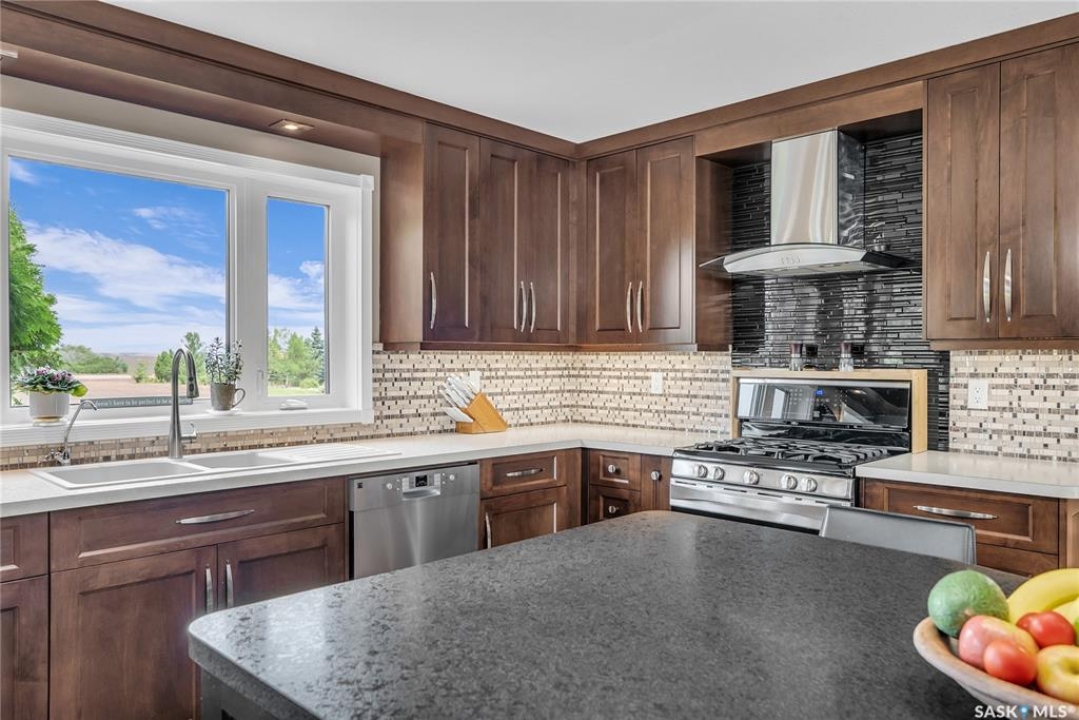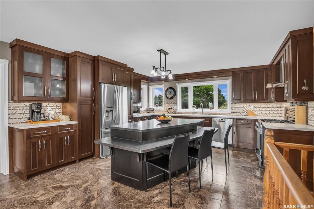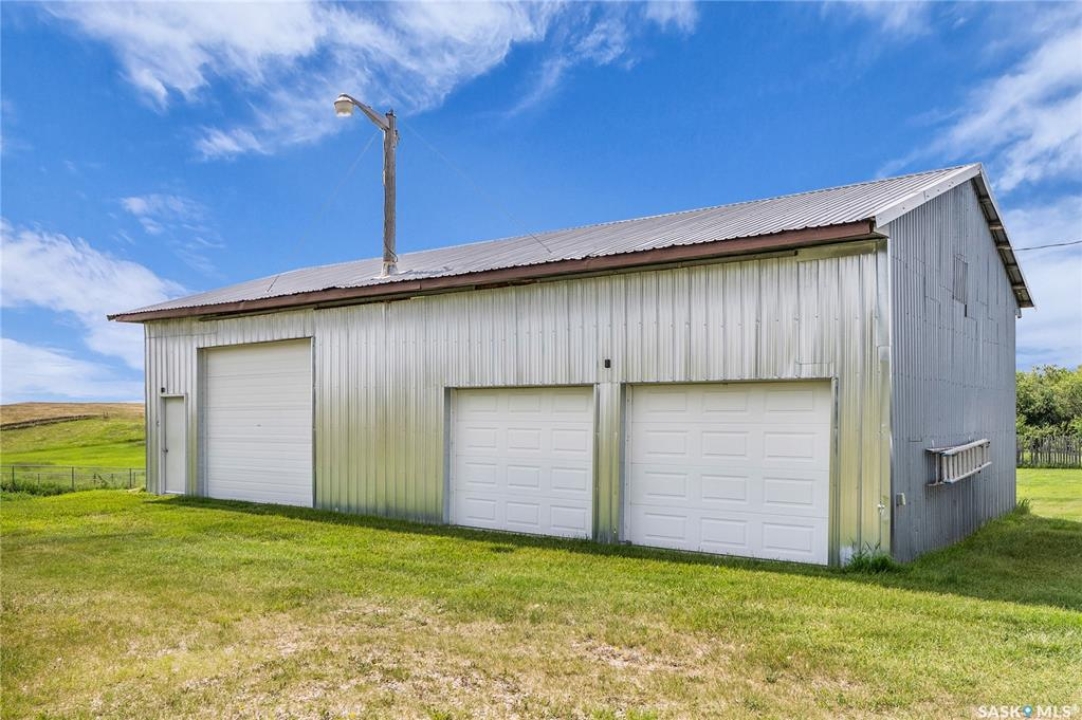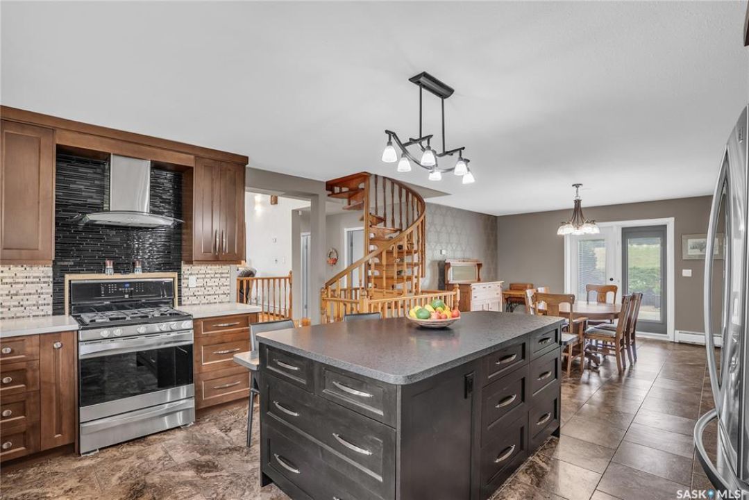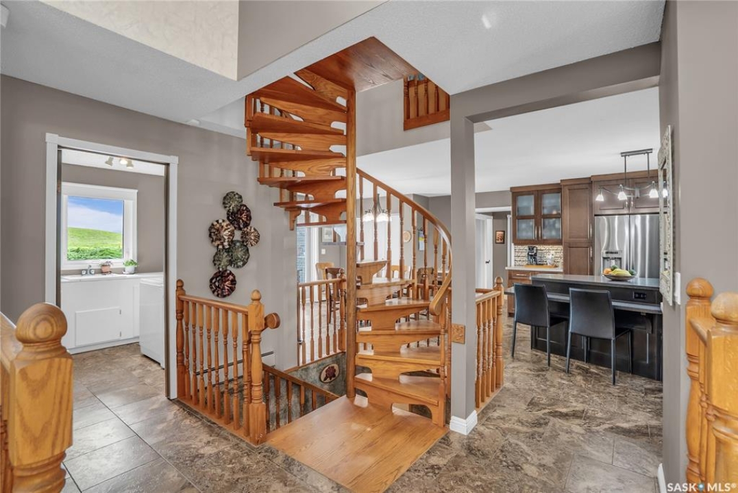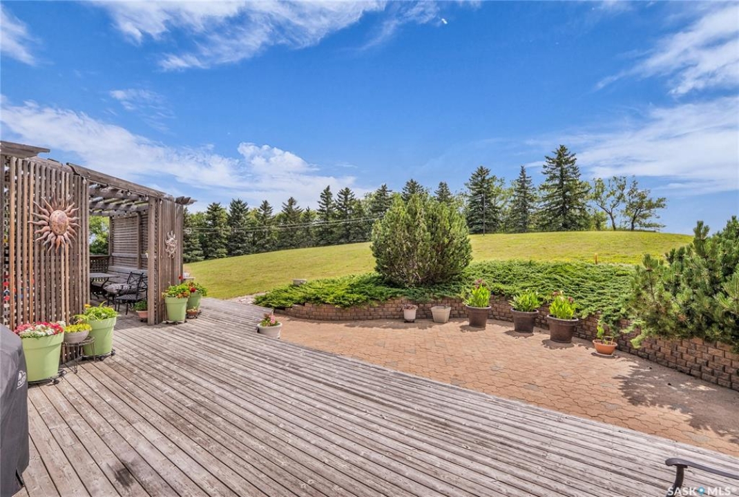 Discover this uniquely designed acreage home, nestled in the hills and thoughtfully crafted by the original owner. Offering nearly 3,000 sqft of total living space with approx 144 acres of pasture land, this home is ideal for families, home-based businesses, or anyone seeking space, privacy, and character. The main floor boasts a spacious updated kitchen with abundant cabinetry, stainless steel appliances, and open layout perfect for entertaining. Hickory hardwood floors and vaulted ceilings create an inviting living space, complemented by built-in cabinetry and custom features throughout. There is an impressive 26' x 32' bonus room—ideal as a family room, studio, office, or could easily be converted into additional bedrooms. An additional bedroom/office is located on the main. The 4-piece bathroom features an air jet tub, and the generous mudroom/laundry area includes a convenient powder room and direct access to the insulated garage. A spiral staircase leads to the luxurious 600 sq ft primary suite with a 3-piece ensuite and extended vanity. A fully developed basement offers two more bedrooms, a full bathroom, and separate entry through the garage or the main house—great for extended family or guests. Outside, enjoy the 14'x48' cedar deck with pergola covering, perfect for relaxing or entertaining with scenic views and peaceful walking paths. Outbuildings are extensive and include a 25'x50' insulated and finished garage/shop combo, a 16'x30' heated barn/workshop with concrete floor and power, a massive 25'x110' storage shed with multiple garage doors (including a 12' door) and ample shelving, plus several other storage buildings and a 24'x8' garden shed. Additional features include a covered fire pit area, children's playhouse and swings, gravelled RV parking, and a fenced lagoon. Recent updates include new kitchen cabinets, backsplash, and main floor flooring (2013), and a new water heater (2025). Heating is provided by an efficient boiler furnace. View today!