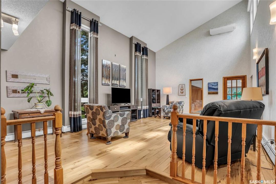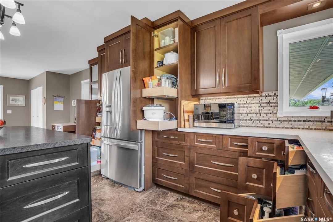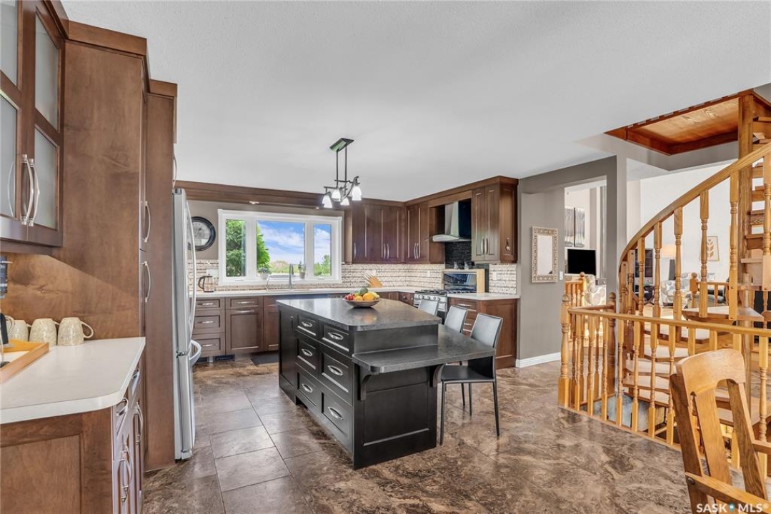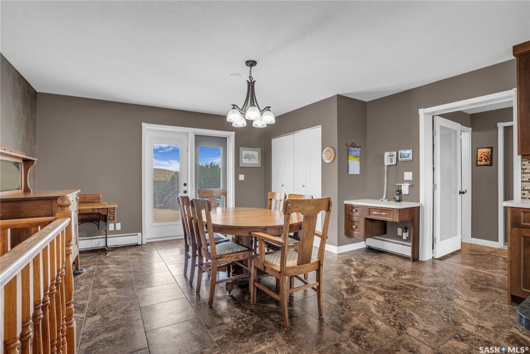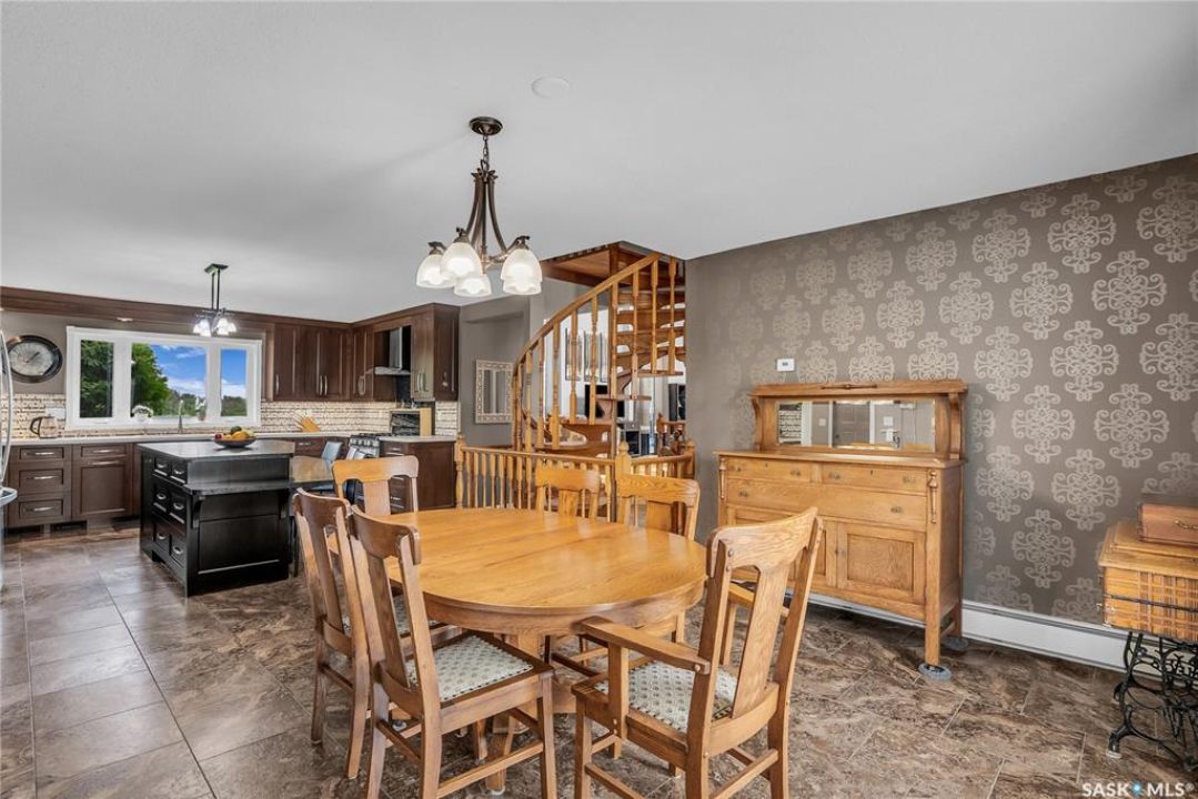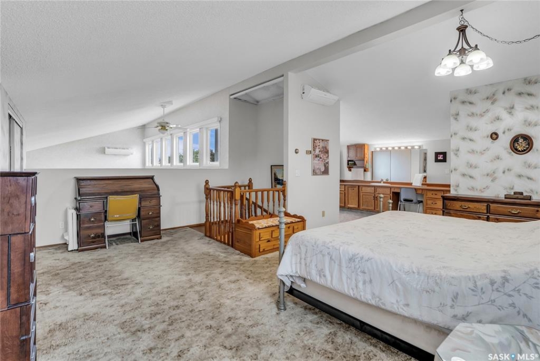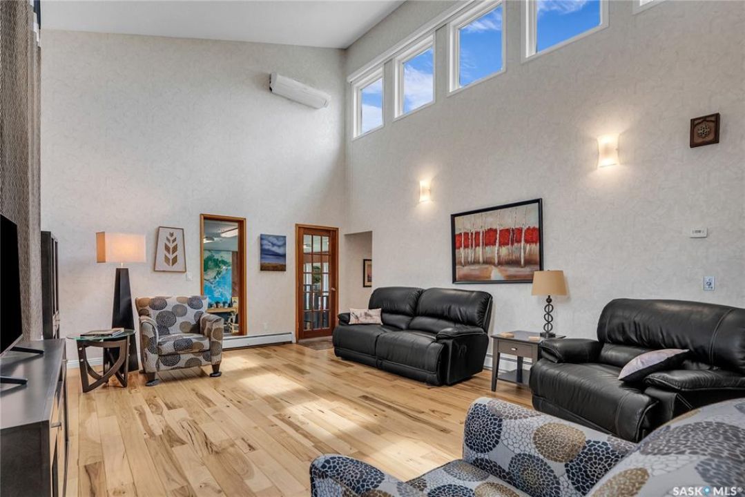 Discover this uniquely designed acreage home, nestled in the hills and thoughtfully crafted by the original owner. Offering nearly 3,000 sqft of total living space with approx 144 acres of pasture land, this home is ideal for families, home-based businesses, or anyone seeking space, privacy, and character. The main floor boasts a spacious updated kitchen with abundant cabinetry, stainless steel appliances, and open layout perfect for entertaining. Hickory hardwood floors and vaulted ceilings create an inviting living space, complemented by built-in cabinetry and custom features throughout. There is an impressive 26' x 32' bonus room—ideal as a family room, studio, office, or could easily be converted into additional bedrooms. An additional bedroom/office is located on the main. The 4-piece bathroom features an air jet tub, and the generous mudroom/laundry area includes a convenient powder room and direct access to the insulated garage. A spiral staircase leads to the luxurious 600 sq ft primary suite with a 3-piece ensuite and extended vanity. A fully developed basement offers two more bedrooms, a full bathroom, and separate entry through the garage or the main house—great for extended family or guests. Outside, enjoy the 14'x48' cedar deck with pergola covering, perfect for relaxing or entertaining with scenic views and peaceful walking paths. Outbuildings are extensive and include a 25'x50' insulated and finished garage/shop combo, a 16'x30' heated barn/workshop with concrete floor and power, a massive 25'x110' storage shed with multiple garage doors (including a 12' door) and ample shelving, plus several other storage buildings and a 24'x8' garden shed. Additional features include a covered fire pit area, children's playhouse and swings, gravelled RV parking, and a fenced lagoon. Recent updates include new kitchen cabinets, backsplash, and main floor flooring (2013), and a new water heater (2025). Heating is provided by an efficient boiler furnace. View today!