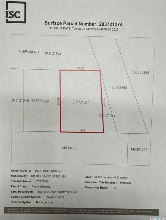 Enjoy lake living on this lot. The Seasonal lot is .11 acre. Culverts and driveways have been installed and trees planted. Lot has 100 amp power to property line. Buyer to sign Servicing Agreement with Pape Holdings Inc.. Buyer responsible for utility hookup costs. Buyer is responsible for septic holding tank cost and install. Buyers to consult with RM of Humboldt regarding building guidelines and approval. Minutes from the City of Humboldt and approx. 50 min from the BHP Jansen Potash Mine site. Call today for more information!
