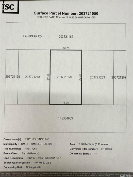 Enjoy lake living on this lot. The Seasonal lot is .11 acre. Culverts and driveways have been installed and trees planted. Lot has 100 amp power meter on property. Buyer to sign Servicing Agreement with Pape Holdings Inc.. Buyer responsible for utility hookup costs. Buyer is responsible for septic holding tank cost and install. Buyers to consult with RM of Humboldt regarding building guidelines and approval. Minutes from the City of Humboldt and approx. 50 min from the BHP Jansen Potash Mine site. Call today for more information!