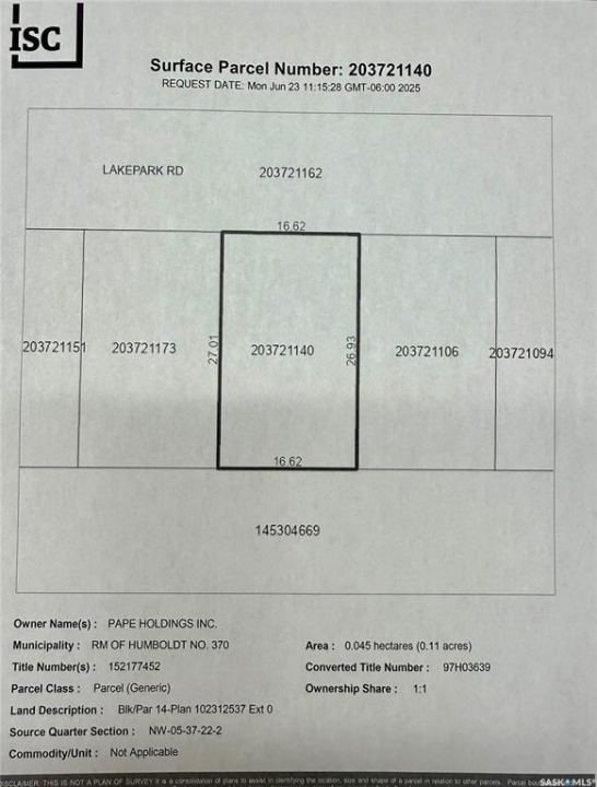 Enjoy lake living on this lot. The Seasonal lot is .11 acre. Culverts and driveways have been installed and trees planted. Lot has 100 amp power power box on property. Buyer to sign Servicing Agreement with Pape Holdings Inc.. Buyer responsible for utility hookup costs. Buyer is responsible for septic holding tank cost and install. Buyers to consult with RM of Humboldt regarding building guidelines and approval. Minutes from the City of Humboldt and approx. 50 min from the BHP Jansen Potash Mine site. Call today for more information!