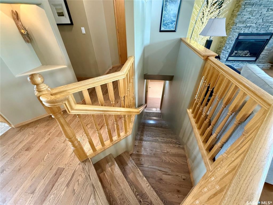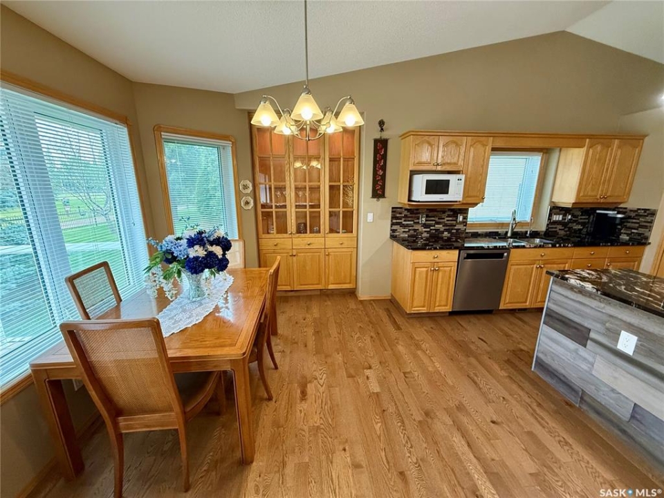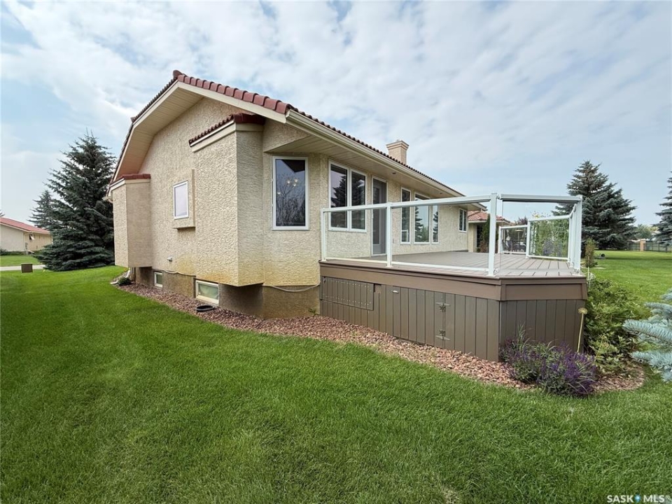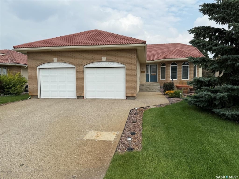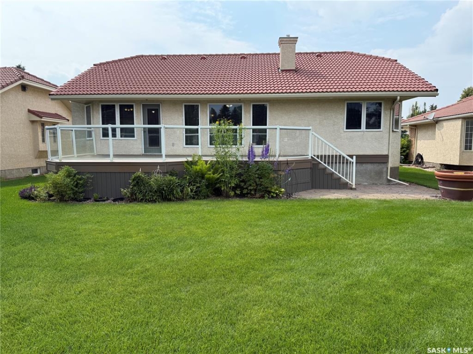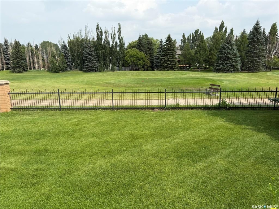 Excellent bungalow with a great location in Emerald Park, backing the 11th hole of the golf course and green space. This home has been very well kept with the main floor featuring nice open floor plan. Beautiful engineered hard wood floors run throughout the oak kitchen with center island, corner pantry, with granite counter tops, dining area, living room with gas fireplace, all bedrooms/den, and hallways. The large master bedroom has a huge ensuite with a walk-in shower, soaker tub, bathroom vanity, and a handy walk-in closet right in the ensuite. 2nd bedroom is a good size, and there is also a den, which does have a closet so could be used as a 3rd bedroom. The main floor does feature another 4-piece bath, a handy laundry room which leads to the double attached garage, and good-sized front foyer complete the main floor. The basement is finished with a large rec room, another bedroom, a 3-piece bath, and a large utility/storage area. Off the dining room, there is a garden door which leads to a large deck with extra storage bins under the deck, a patio area, and a great view of the golf course. The double attached 24'x24' garage has 2 over head doors, and is insulated and drywalled, could easily be heated. This property is not a condo, it does have a Home Owners Agreement in place for all lawn maintenance, underground sprinklers (sprinklers are on well water, so no cost to the home), and snow removal which costs $200.00 per month. Great location, close to all the amenities that Emerald park has to offer. Call your realtor today to schedule a showing.