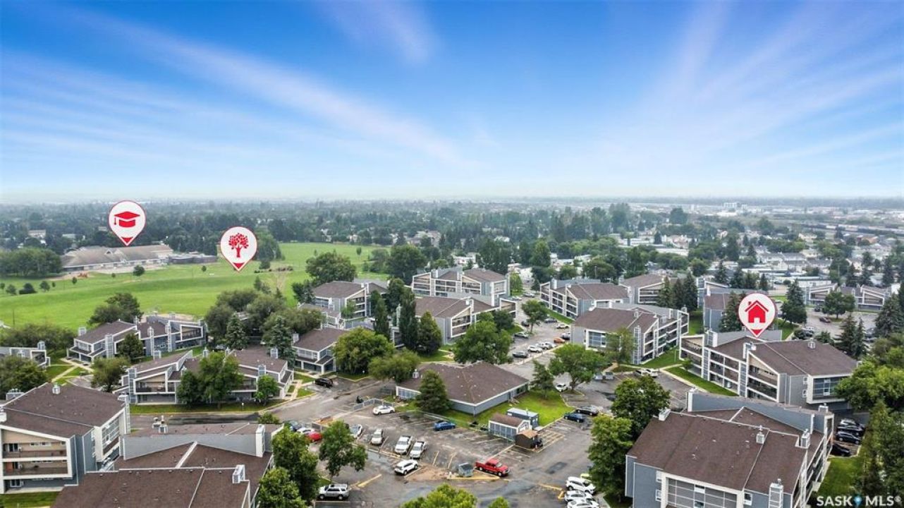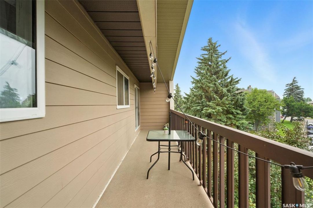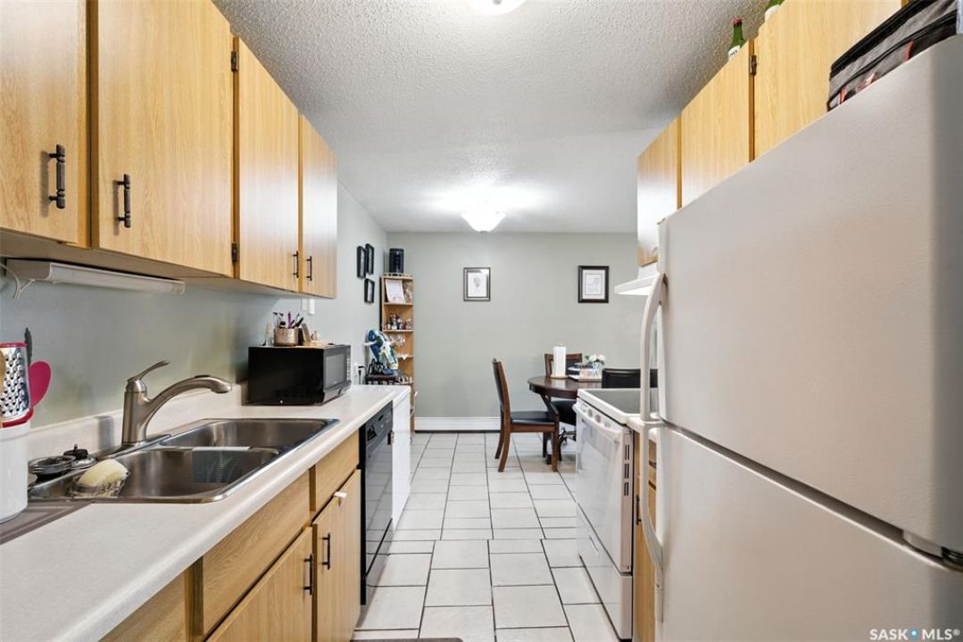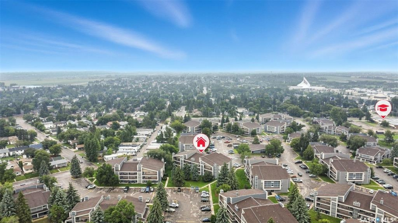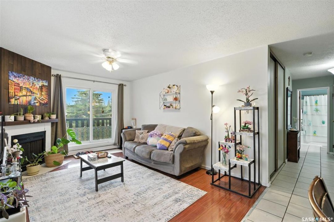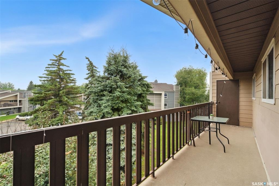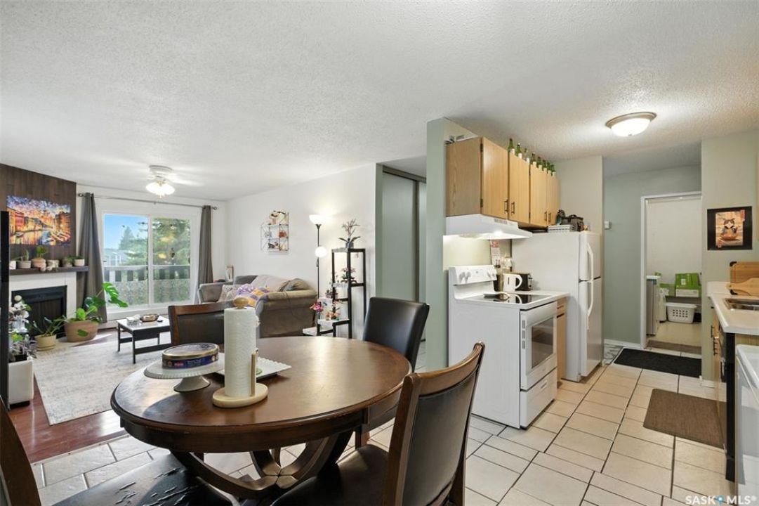 Fantastic top-floor corner unit condo in the well-maintained Forest Grove Village complex, located just 7 minutes from the University of Saskatchewan, right next to two elementary schools and within walking distance to University Heights shopping. This bright end unit is set apart with an extra side window for added natural light and features laminate flooring throughout the living room and bedrooms, with ceramic tile in the kitchen, dining area, and both bathrooms—no carpet throughout. The spacious layout includes a large in-suite storage room that can double as a small office or laundry room, and a patio door off the living room opens onto a good-sized balcony with a private storage shed. The unit is in excellent condition, includes in-suite laundry, and comes with all appliances, including a new stove (2025),washer & dryer (2022) and portable AC. One electrified parking stall is included, with ample street parking available. Residents also enjoy access to a recreation facility featuring a racquetball court, pool tables, shuffleboard, fitness/gym area, and amenities room. The complex has seen many recent upgrades, including new windows, shingles, and siding, giving buyers and investors confidence in the property's appearance and upkeep. This is a great opportunity for first-time buyers or investors—contact your REALTOR ® today for a private viewing!
