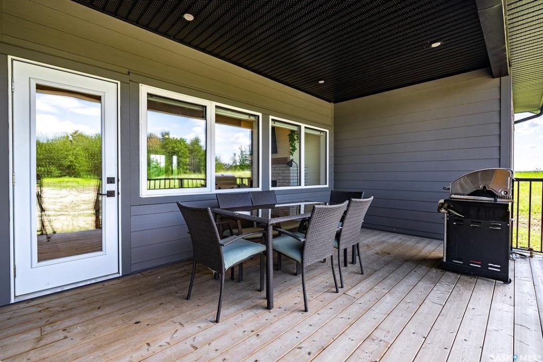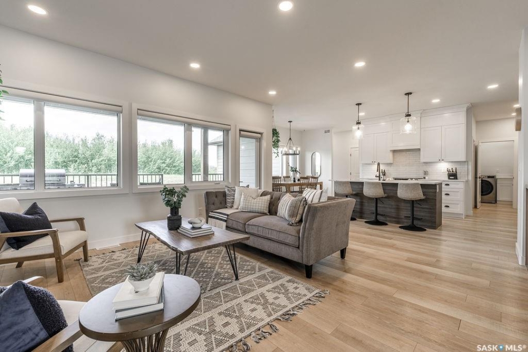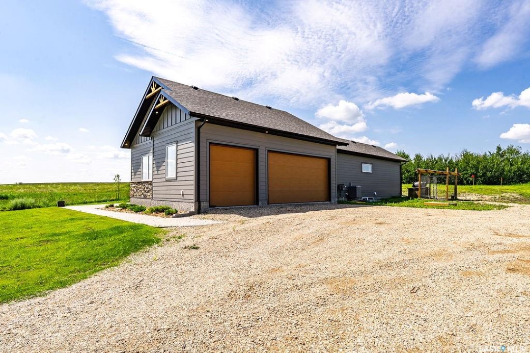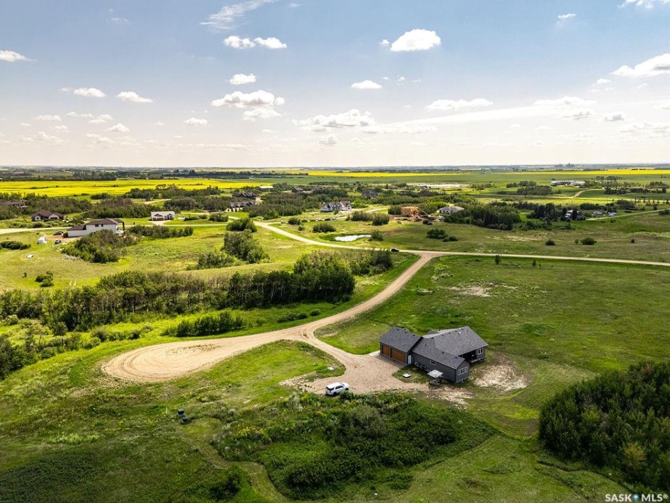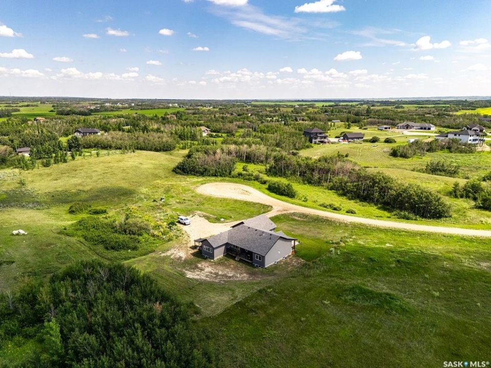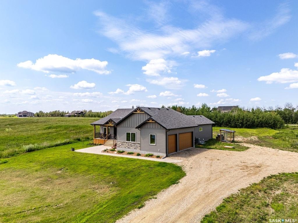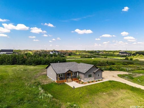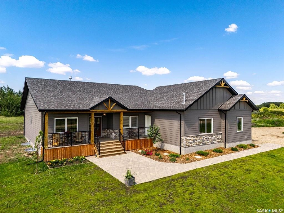 A gorgeous country oasis just 6 km from the city! This stunning 1,850 sq ft bungalow sits on 1.37 acres of treed land on a quiet cul-de-sac in desirable Applewood Estates. With quality craftsmanship, thoughtful design, and beautiful custom touches throughout, this home blends modern luxury with country charm. The exterior features natural wood beams, stone accents, and a covered front veranda with a landscaped front yard and stone path leading to the entrance. Inside, large windows fill the space with natural light, and custom blinds are installed throughout. At the front is a spacious office, followed by an open-concept living area with a gas fireplace and rustic brick hearth. The main living area opens to a covered deck overlooking your private backyard filled with mature trees and Saskatoon berry bushes. The kitchen features custom cabinetry, quartz countertops, stainless steel appliances, a tile backsplash, open shelving, and a butler's pantry with extra cabinets and storage. Two large bedrooms and a full 4-piece bathroom sit on one side, while the other wing includes a mudroom, 2-piece powder room, and a laundry room with custom cabinets, a sink, and access to the triple attached garage. The private primary suite offers serene backyard views, a walk-in closet, and a luxurious 5-piece ensuite with double sinks, standalone tub, and tiled shower. The fully finished basement includes two additional bedrooms, a massive family room, and a games room—perfect for entertaining or relaxing. Enjoy sunsets, wildlife, and peace and quiet just minutes from city amenities. Applewood Estates is only 4 minutes from south Costco and everything you need.