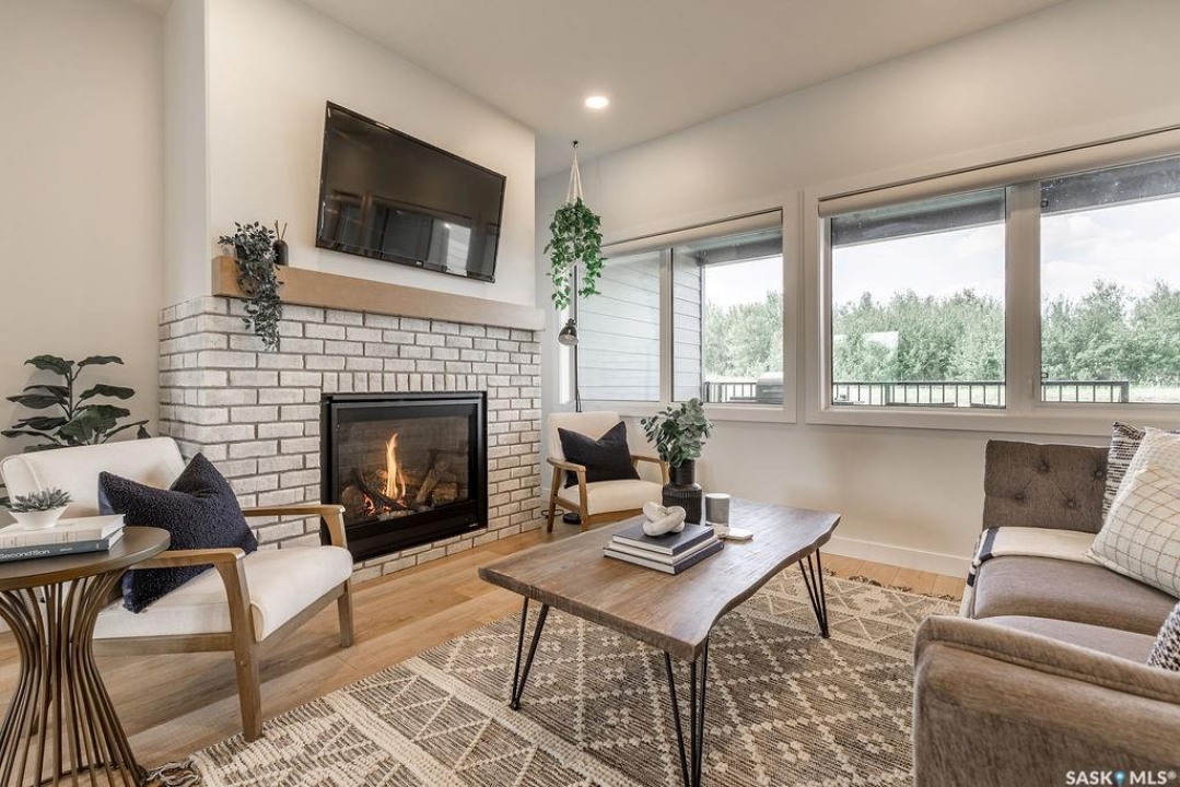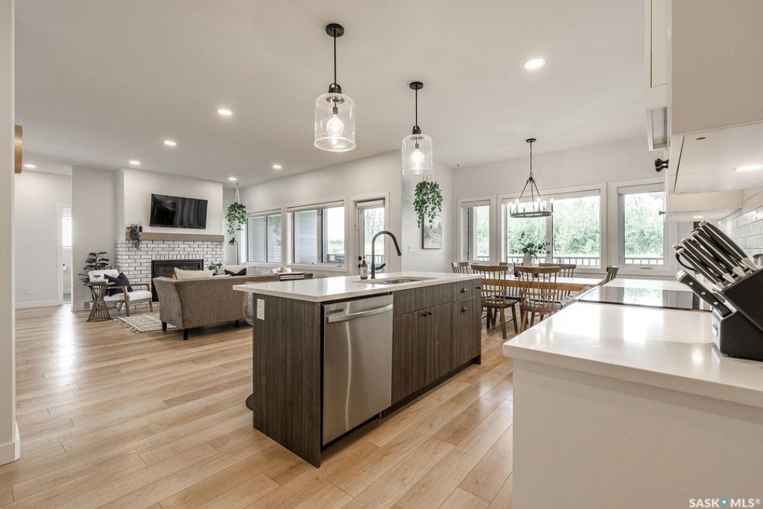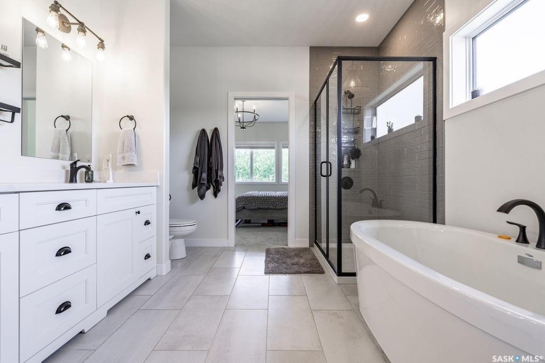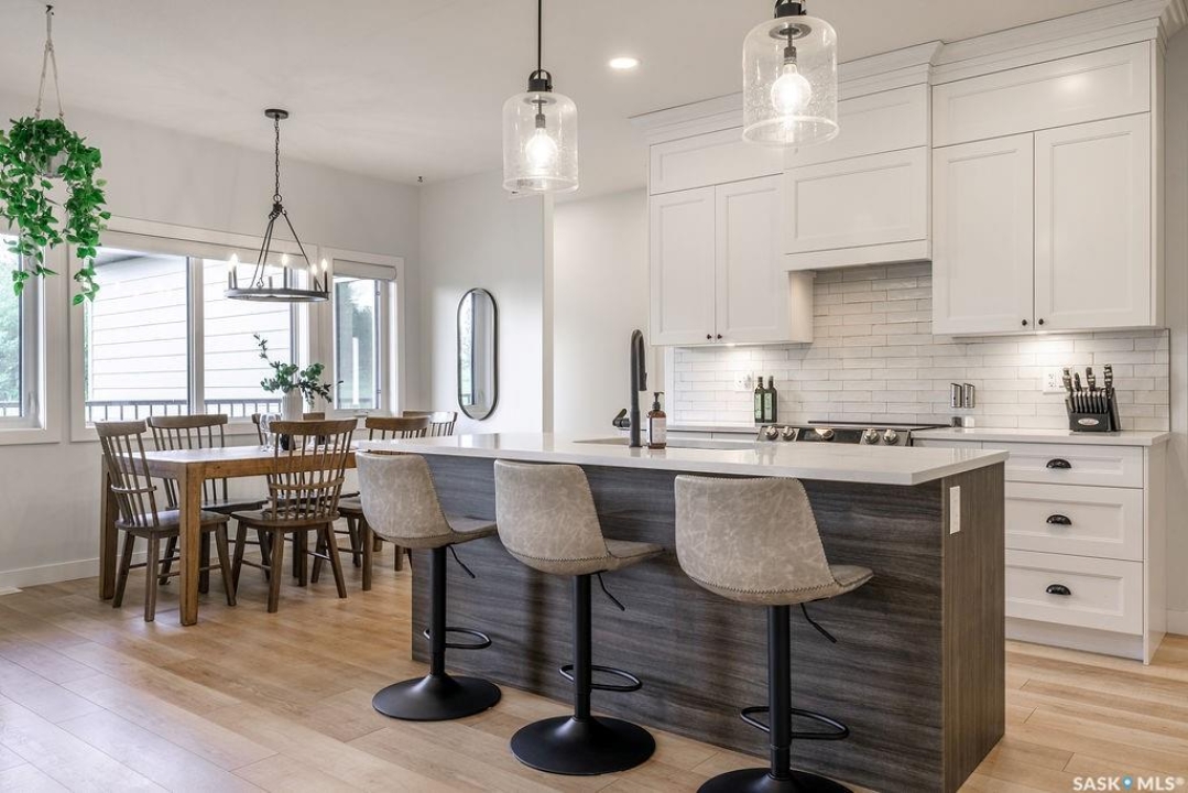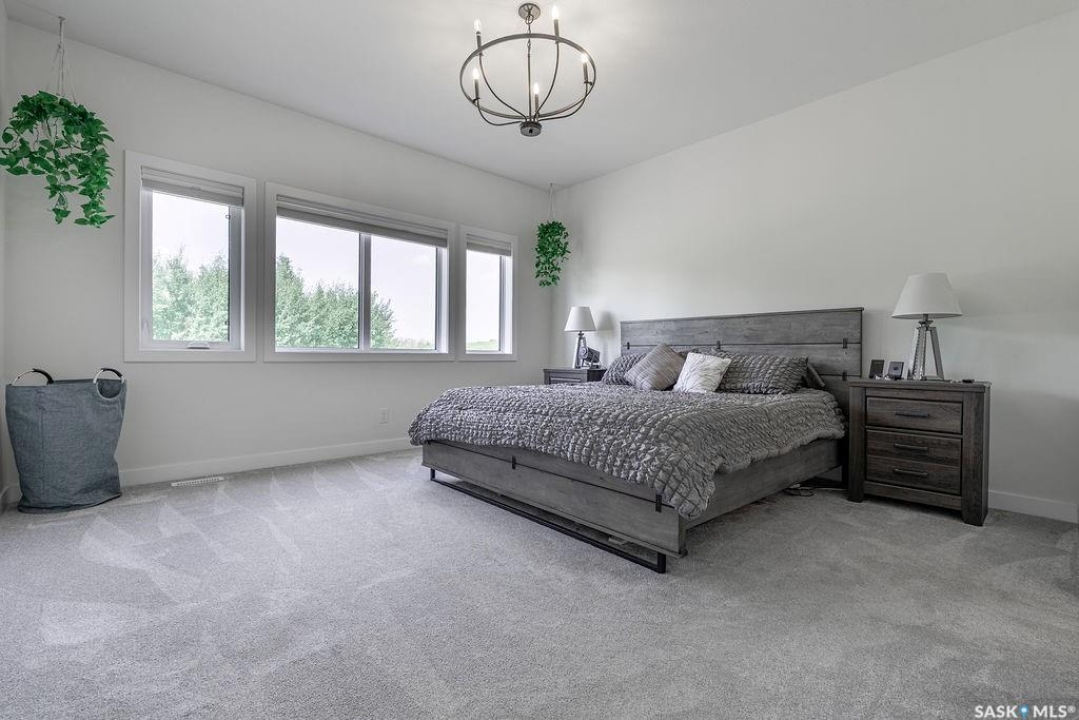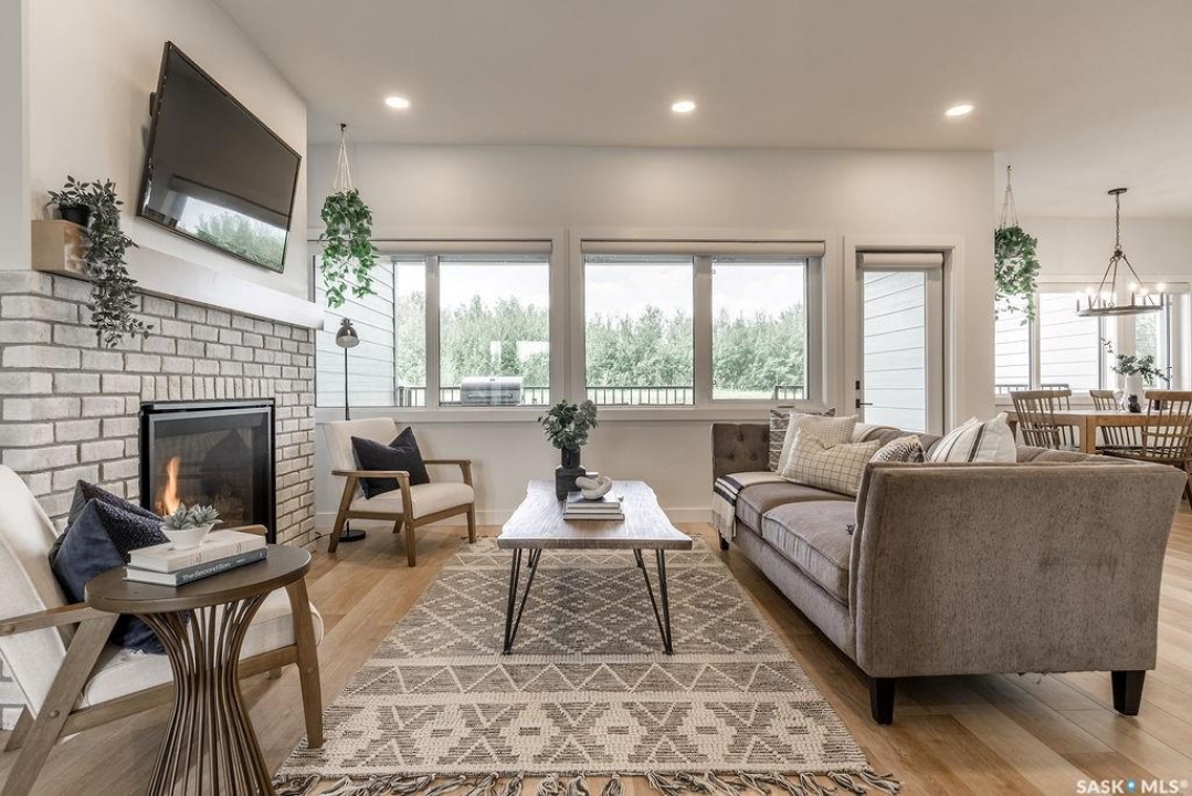 A gorgeous country oasis just 6 km from the city! This stunning 1,850 sq ft bungalow sits on 1.37 acres of treed land on a quiet cul-de-sac in desirable Applewood Estates. With quality craftsmanship, thoughtful design, and beautiful custom touches throughout, this home blends modern luxury with country charm. The exterior features natural wood beams, stone accents, and a covered front veranda with a landscaped front yard and stone path leading to the entrance. Inside, large windows fill the space with natural light, and custom blinds are installed throughout. At the front is a spacious office, followed by an open-concept living area with a gas fireplace and rustic brick hearth. The main living area opens to a covered deck overlooking your private backyard filled with mature trees and Saskatoon berry bushes. The kitchen features custom cabinetry, quartz countertops, stainless steel appliances, a tile backsplash, open shelving, and a butler's pantry with extra cabinets and storage. Two large bedrooms and a full 4-piece bathroom sit on one side, while the other wing includes a mudroom, 2-piece powder room, and a laundry room with custom cabinets, a sink, and access to the triple attached garage. The private primary suite offers serene backyard views, a walk-in closet, and a luxurious 5-piece ensuite with double sinks, standalone tub, and tiled shower. The fully finished basement includes two additional bedrooms, a massive family room, and a games room—perfect for entertaining or relaxing. Enjoy sunsets, wildlife, and peace and quiet just minutes from city amenities. Applewood Estates is only 4 minutes from south Costco and everything you need.