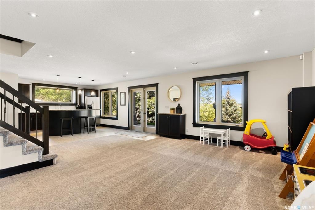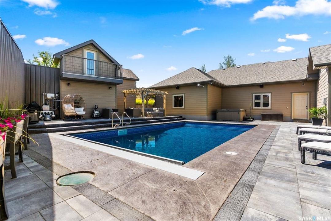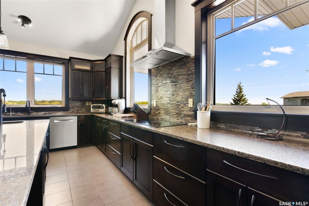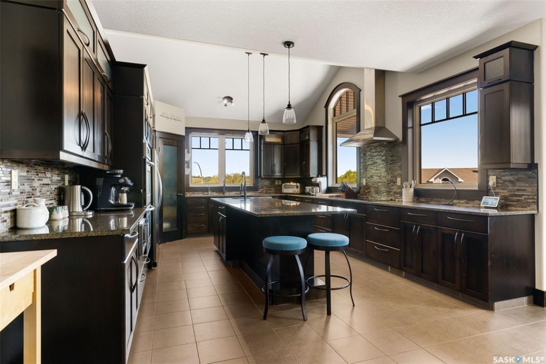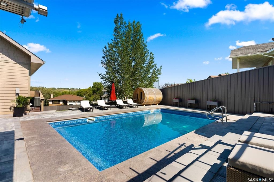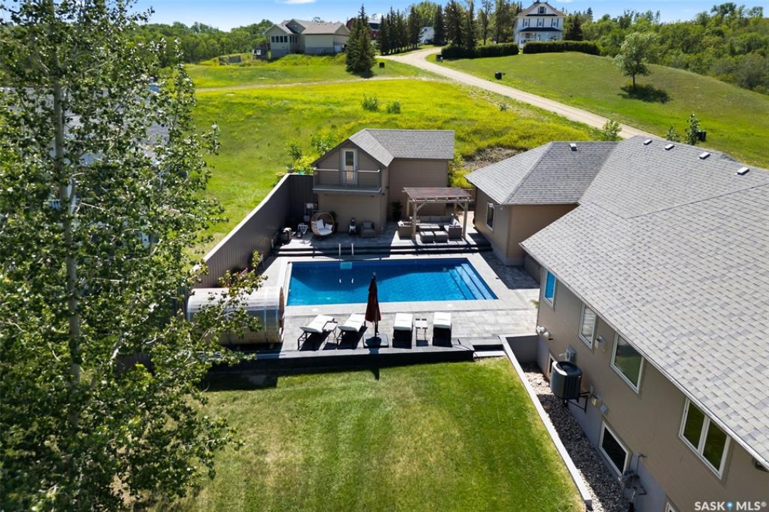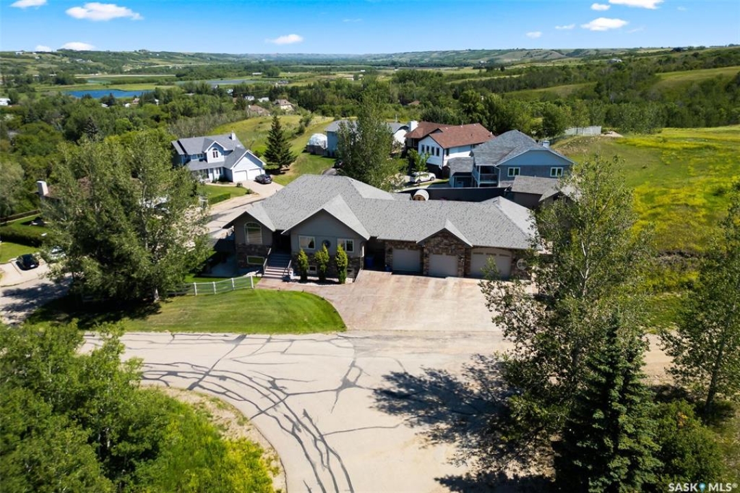 Discover this stunning 2007 sq ft custom-built walkout bungalow above Lumsden. Large windows flood the home with natural light and offer breathtaking views of the Lumsden Valley. The main floor features vaulted ceilings, solid maple doors and trim, and in-floor heating in the bathrooms, kitchen, dining area, and basement tiled spaces. The spacious kitchen boasts maple cabinets, granite countertops, a large island, built-in cooktop, double ovens, double fridge/freezer, and a corner pantry. The dining area opens to the upper deck via garden doors—perfect for entertaining. The master suite includes built-in dressers, his-and-hers walk-in closets, a double-sided fireplace, and a large ensuite with a double jetted tub and glass/tile shower. The fully developed basement has two bedrooms, a den, and a rec room with a built-in entertainment system. A wet bar, fridge, and dishwasher make hosting easy. Garden doors lead to a patio for outdoor fun. Enjoy the fully landscaped, fully fenced backyard with an in-ground pool, hot tub, and a custom two-story play structure/shed. The heated triple garage (44' x 24') plus additional rear bay (12' x 20') provides ample storage, along with extra space in the furnace room. For more info contact the listing agent.