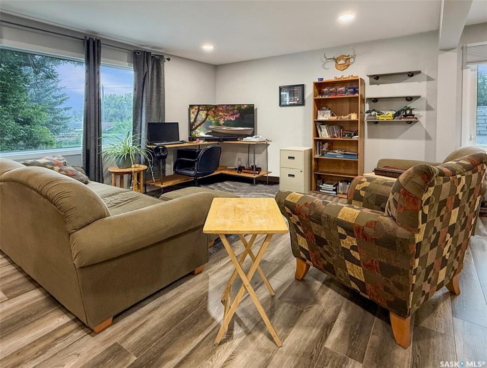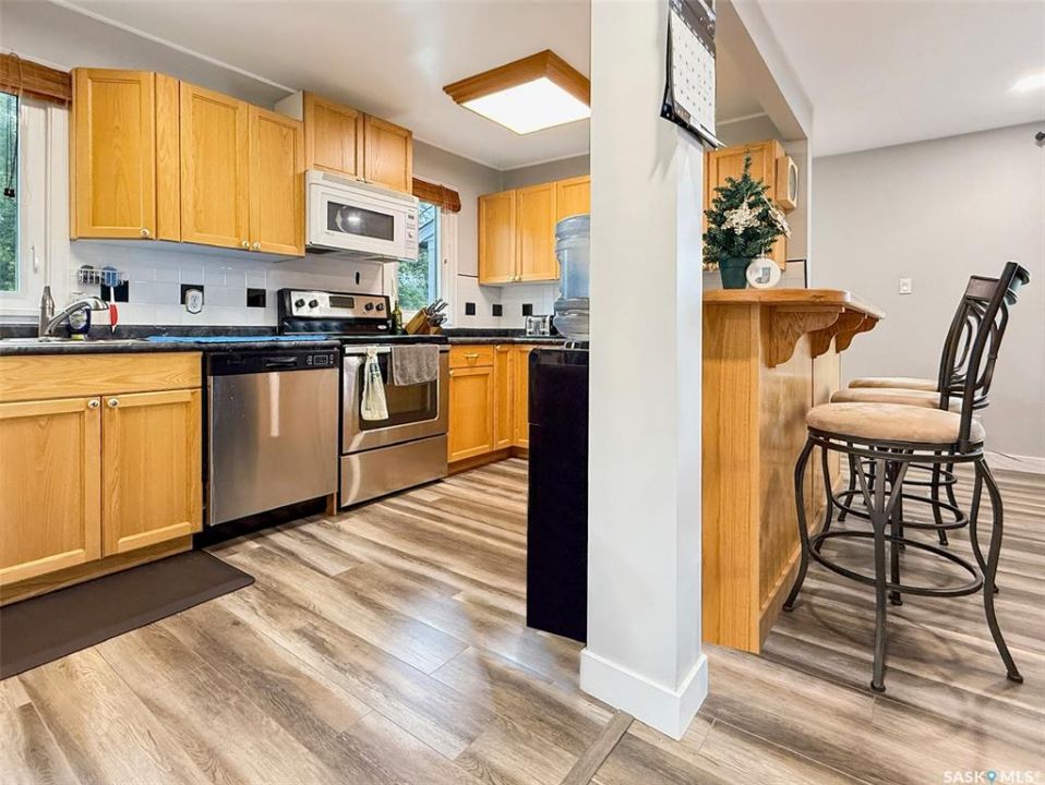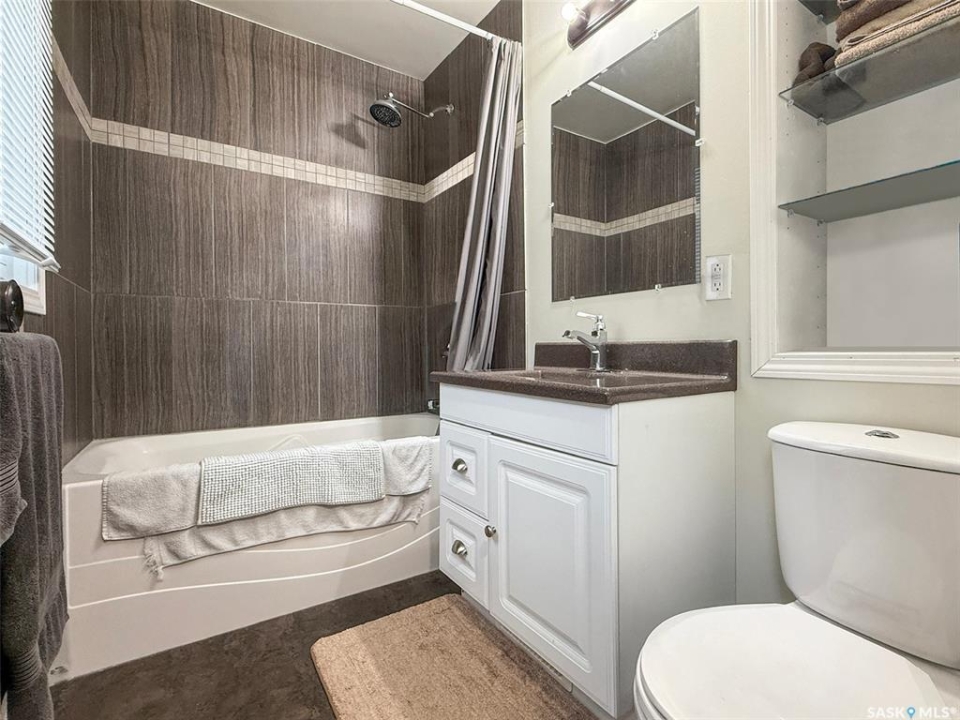 Welcome to this charming residence situated in a cozy northwest neighborhood. This home is move-in ready, allowing you to easily add your personal touch. Upon entering, you will be greeted by a spacious, open-concept living area with modern paint, updated baseboards, and trim, complemented by contemporary laminate flooring. The expansive kitchen, measuring 14 by 7 feet, is equipped with modern cabinetry and an island that seamlessly connects to the airy living room. It features a stainless steel appliance package, including a dishwasher, a tiled backsplash, and a double sink overlooking the yard. Enjoy the inviting front deck that overlooks the mature neighbourhood. On the main floor, you will find a fully renovated bathroom designed for relaxation, complete with a deep soaker tub surrounded by elegant tiles, along with an updated vanity, toilet, and vinyl tile flooring. The second floor boasts two spacious bedrooms, with the primary offering the convenience of two closets for his and hers. The partially finished basement includes a family room, ample storage spaces, a finished three-piece bathroom, and an updated utility room. In the utility room, you will discover a new PEX piping manifold, an energy-efficient furnace, and a central air conditioning system. This home features numerous PVC windows, updated pot lights, and trendy dark vinyl siding on the exterior, enhancing its curb appeal. The back of the property showcases a large porch, ideal for removing your boots after a day outdoors. The double-wide asphalt driveway provides ample off-street parking, complemented by adjacent green space that is perfect for outdoor activities for both pets and family members. Additionally, multiple sheds are included for extra storage. This residence offers a wonderful opportunity to experience comfortable living in a desirable location.