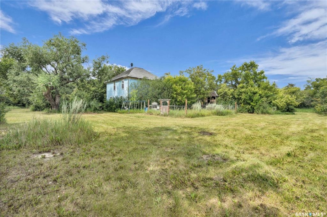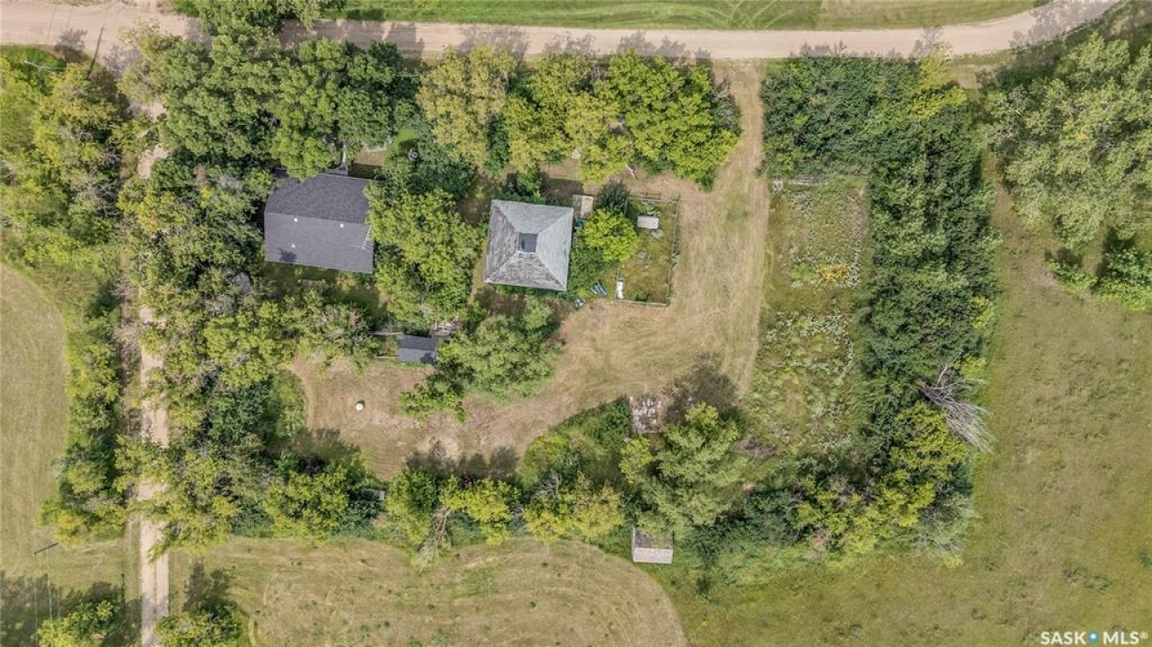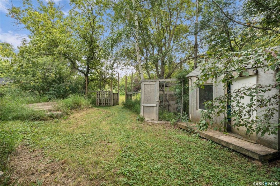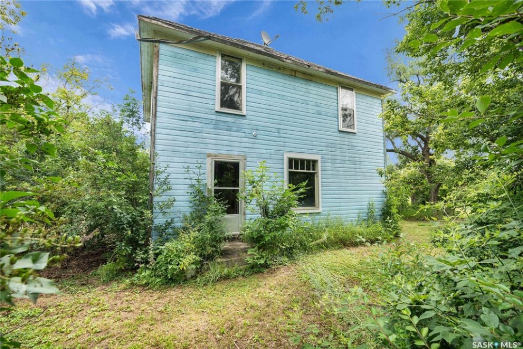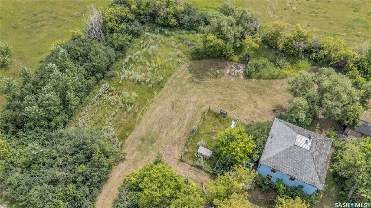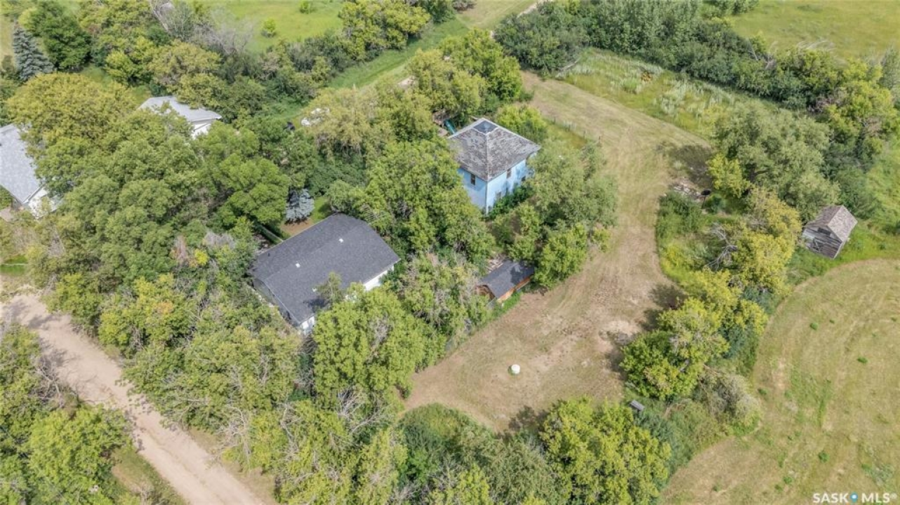 Situated on a generous double lot surrounded by mature trees and privacy hedges, this charming property offers a peaceful setting with loads of potential. The main bungalow has seen thoughtful updates over the years and includes 2 bedrooms, 1 full bathroom, and a dedicated laundry room. In 2023, many updates were professionally completed, including new drywall and trim throughout, plus drywall replaced under the bedroom and bathroom windows. The kitchen windows were updated around 10 years ago, and an old electrical panel was removed from the kitchen, leaving a perfect nook for shelving or a coffee bar. A 200-amp panel in the utility/laundry room was upgraded about 10 years ago. There is electric baseboard throughout, and existing ductwork and natural gas service to the house—making furnace installation straightforward if the buyer prefers. There's also wiring for both an electric fireplace in the living room and power to the fishpond (currently shut off at the breaker). The crawlspace provides utility access and houses the water pump. A private well, drilled approximately 7 years ago and 14 feet deep, includes heat tape to prevent freezing. The septic system sits on the southwest side of the yard and is marked with wood covering. Outside, enjoy a bricked patio, waterfall-fed pond, chokeberry bushes, and four ornamental trees that attract birds and add seasonal color. There's also a treehouse with slide, a fenced animal pen, and multiple sheds, including a chicken and goat pen—YES! You can have goats or chickens! A large open area is ready for planting a garden and preserving to your heart's content. At the back of the property sits a second dwelling—the "old blue house." This heritage-style two-storey is a fixer-upper full of character and possibility. It's currently used for storage (no interior photos available) but could be restored into something truly special with the right vision. Don't miss your chance to grab your slice of this peaceful small-town paradise!