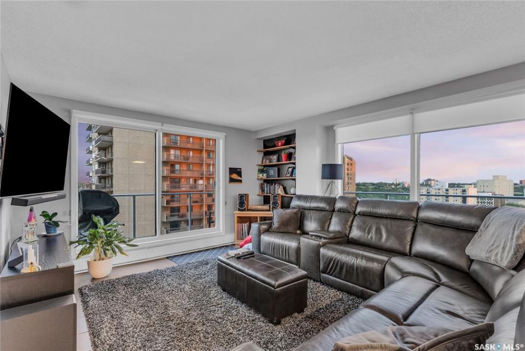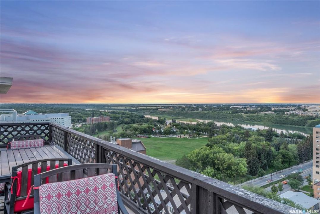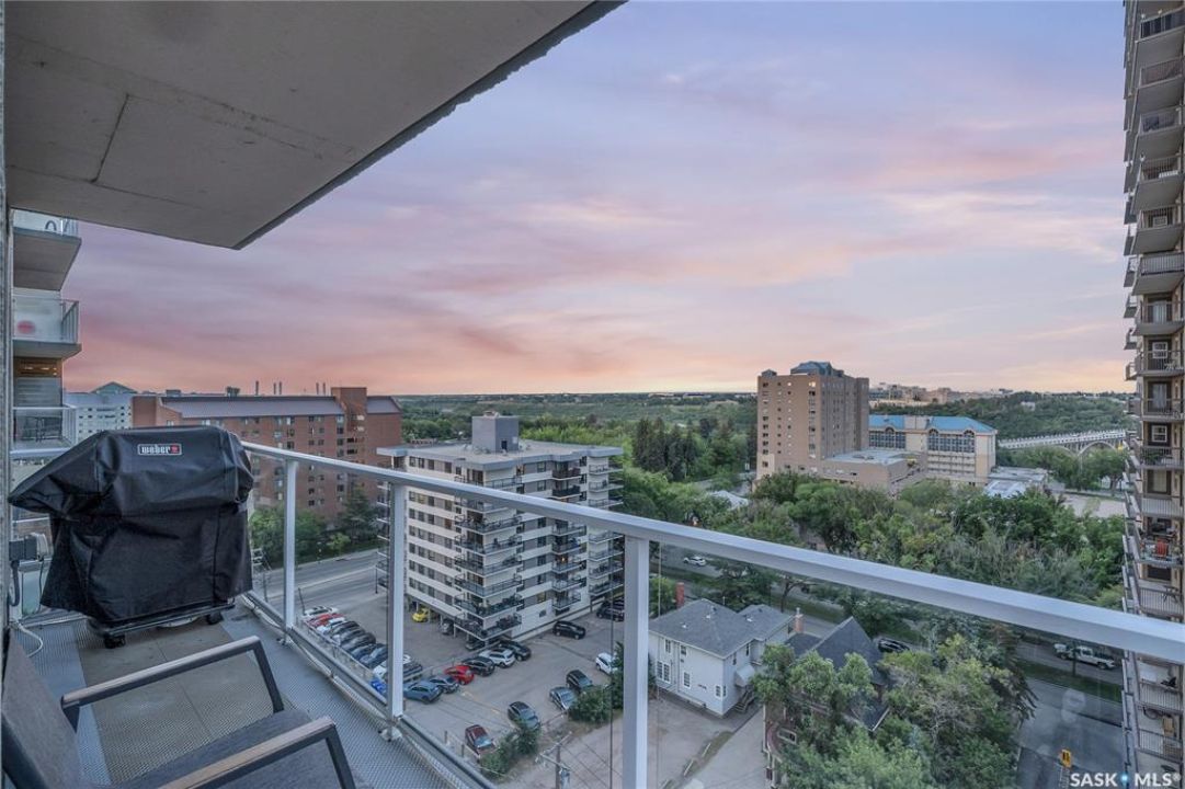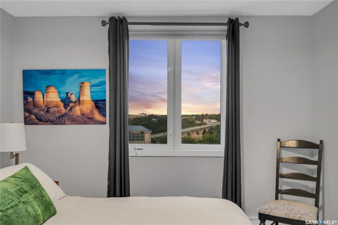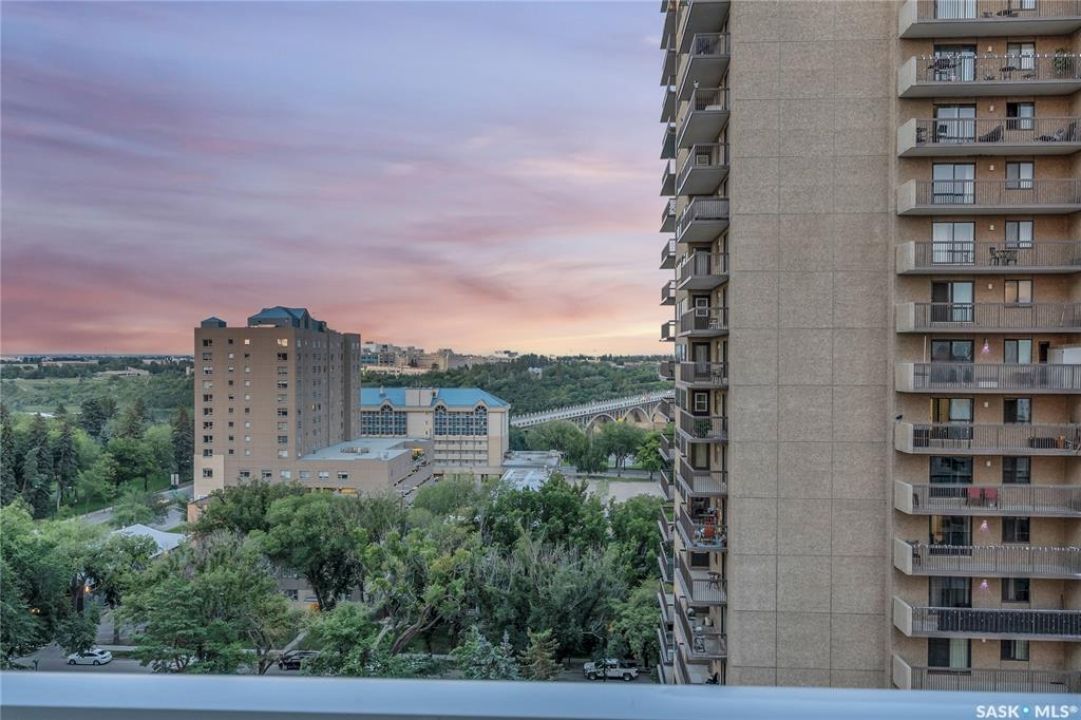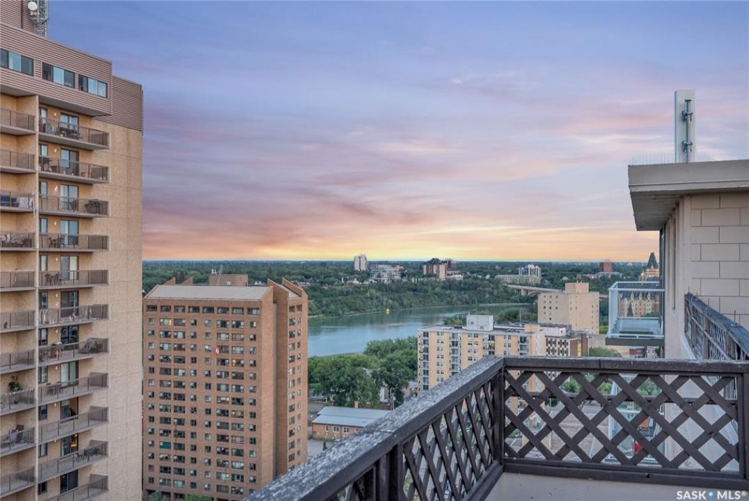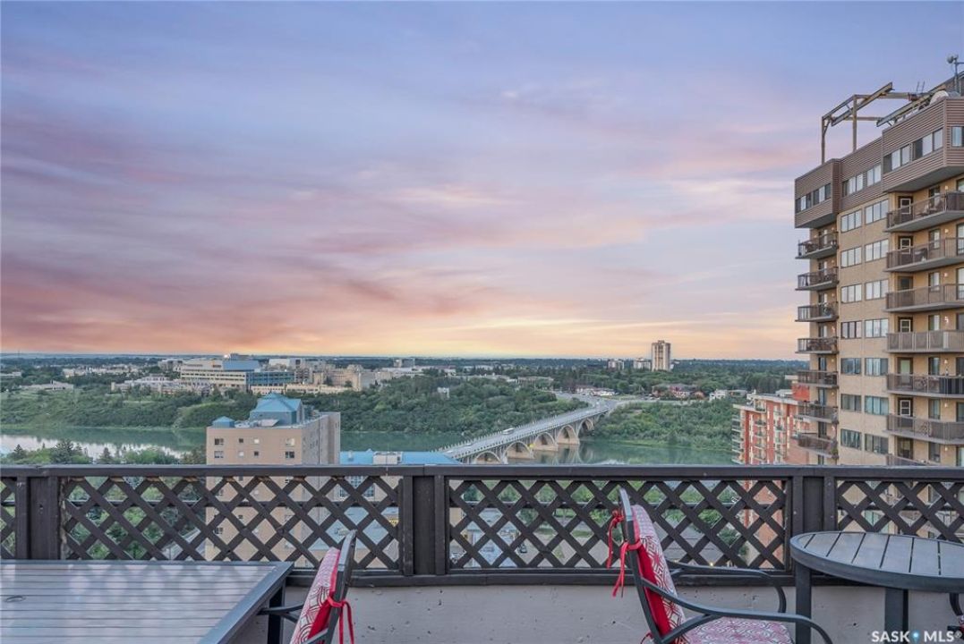 Corner Condo Unit with excellent River, Bessborough, and Saskatoon's city Skyline views from your 14th floor. Renovated Kitchen with quartz countertops & island, Stainless steel appliances included, spacious dining, open concept floor plan, 2-bedrooms, 4-piece bath & in-suite laundry. Floor-to-ceiling windows in the living room create a classy, bright corner unit with a balcony. Exclusive rooftop patio for residents, amenities and exercise room, close to downtown's best riverside paths, dining and entertainment and the UofS. Condo fees of $550/month include common area & exterior building maintenance, common insurance, heat, water, power, sewer, garbage, reserve fund, and snow removal. Don't miss your opportunity to experience some of the finest views in the city. Just listed MLS ONLY $314,900. Call your favourite realtor for a private viewing today!!! Quick Possession Available.