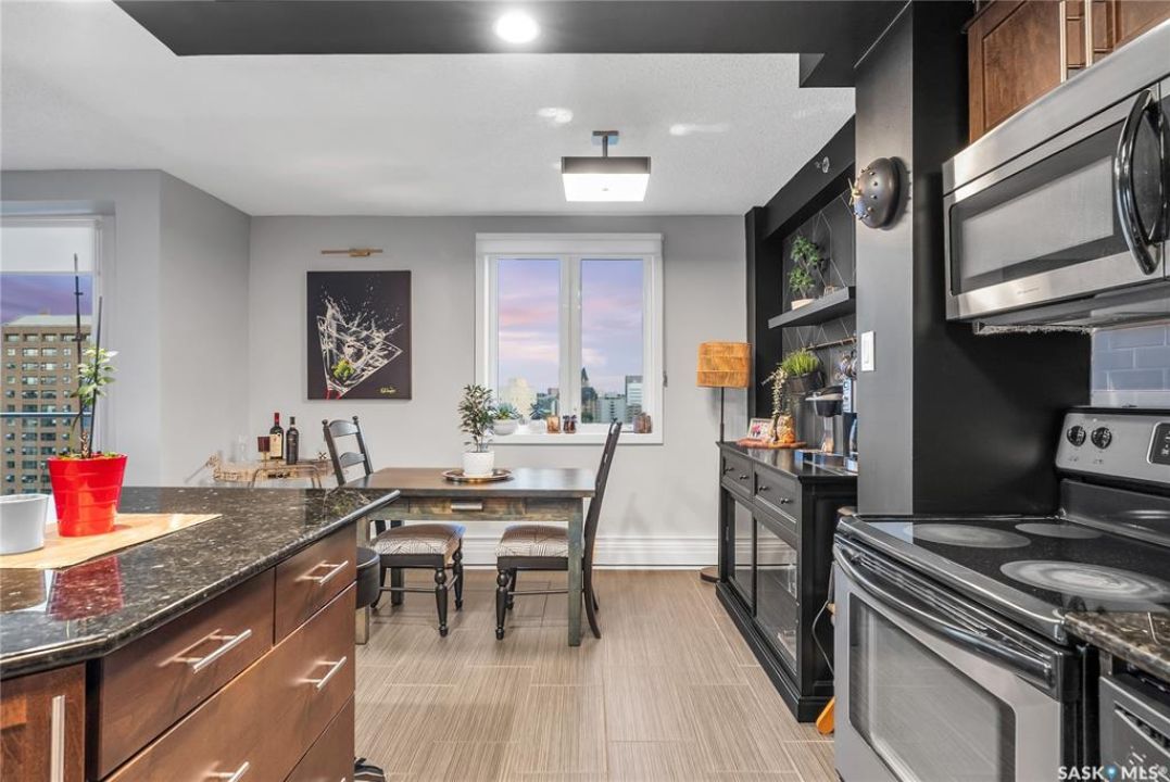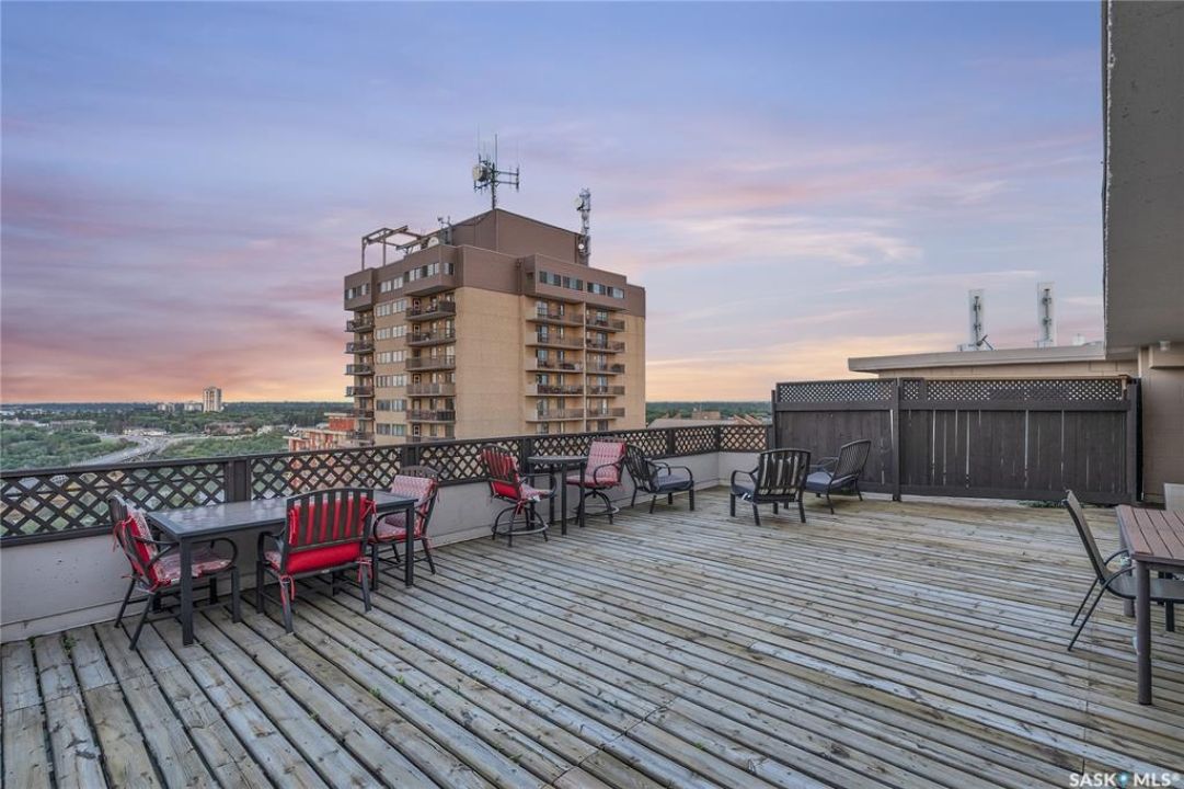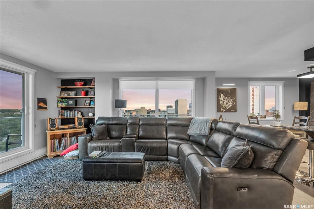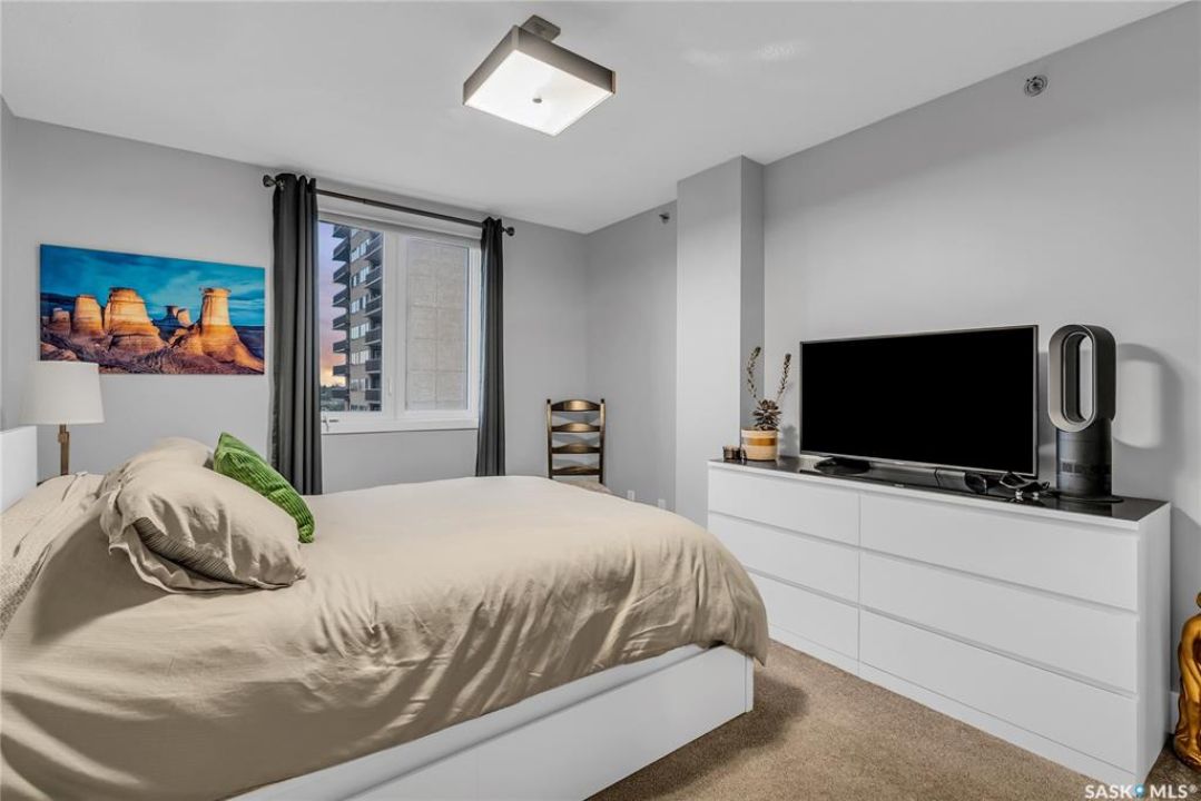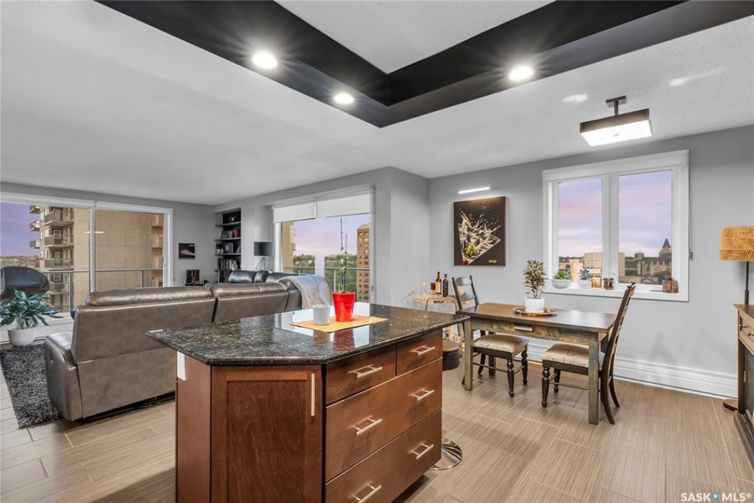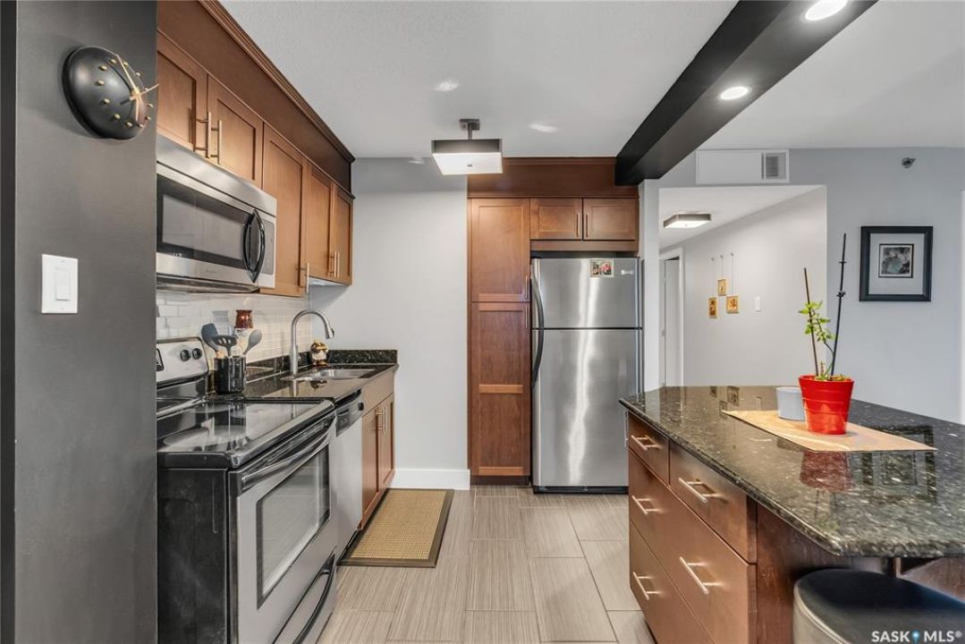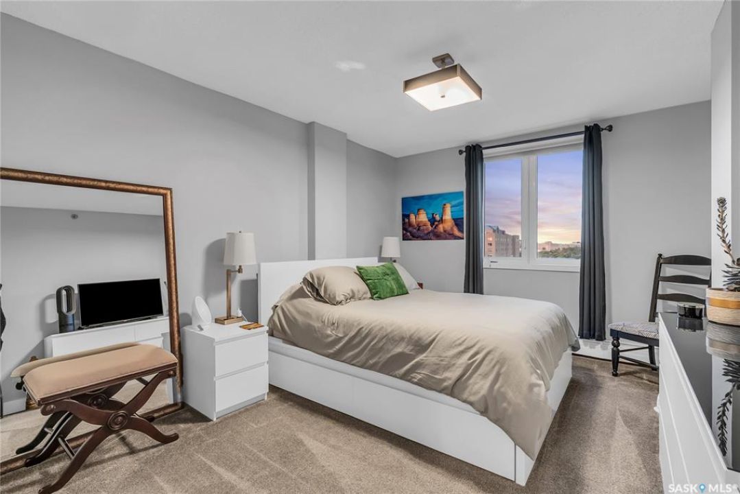 Corner Condo Unit with excellent River, Bessborough, and Saskatoon's city Skyline views from your 14th floor. Renovated Kitchen with quartz countertops & island, Stainless steel appliances included, spacious dining, open concept floor plan, 2-bedrooms, 4-piece bath & in-suite laundry. Floor-to-ceiling windows in the living room create a classy, bright corner unit with a balcony. Exclusive rooftop patio for residents, amenities and exercise room, close to downtown's best riverside paths, dining and entertainment and the UofS. Condo fees of $550/month include common area & exterior building maintenance, common insurance, heat, water, power, sewer, garbage, reserve fund, and snow removal. Don't miss your opportunity to experience some of the finest views in the city. Just listed MLS ONLY $314,900. Call your favourite realtor for a private viewing today!!! Quick Possession Available.