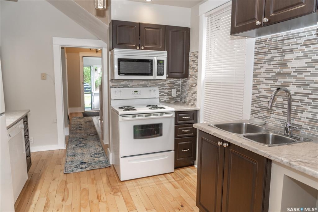 This beautifully maintained home blends character with thoughtful upgrades. Recent improvements include a high-efficiency water heater, newer heat exchanger in furnace and a steel back entrance door (2021), two brand-new windows (2025), and an updated kitchen with freshly refinished countertops and a stylish new backsplash (2025). Approximately 10 years ago, the windows, hardwood flooring, kitchen cabinetry, and shingles were updated. Desk in back sunroom and floor rug included. Situated on a fully landscaped lot, this property offers an unbeatable location—nestled between downtown and the vibrant 33rd Street business district, with quick access to Idylwyld Drive and all city amenities. Inside, the main floor features a bright sunroom, a welcoming living room with gorgeous hardwood floors, and a well-appointed kitchen with ample cupboard and counter space. All kitchen appliances are included. The second floor offers three generously sized bedrooms and a full bathroom, while the third floor provides two additional bedrooms—perfect for a growing family, home office, or guest space. The basement is framed and ready for finishing, with a completed three-piece bathroom, laundry area, and plenty of potential to make it your own. This home is move-in ready and waiting for its next chapter! Great income potential. Owner was getting between $3000-$3500 per month furnished over five years ago.