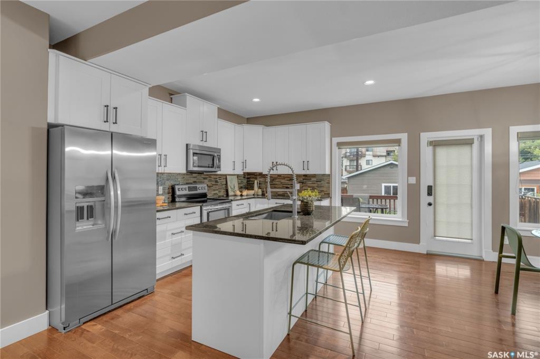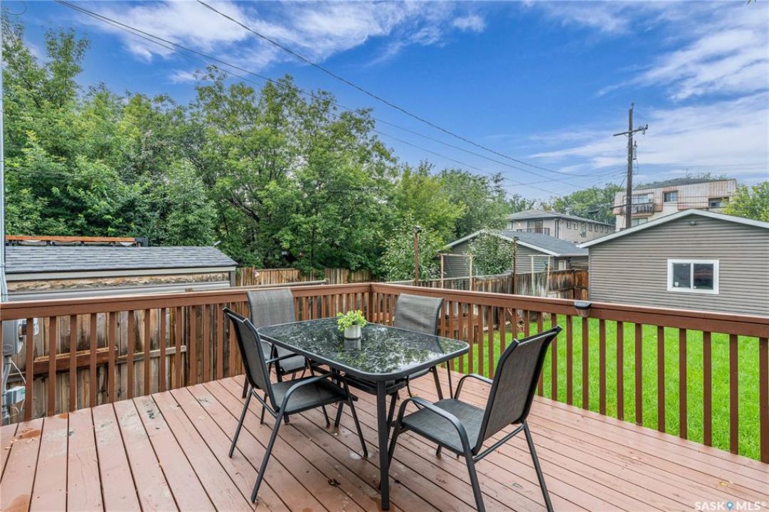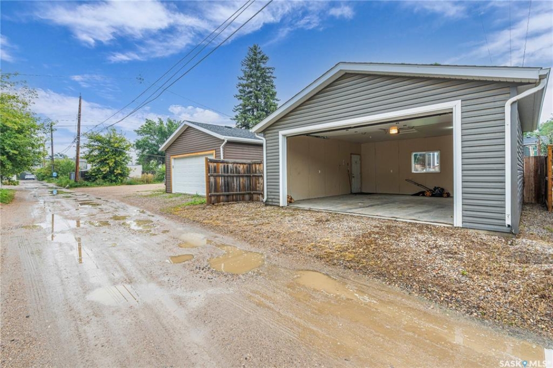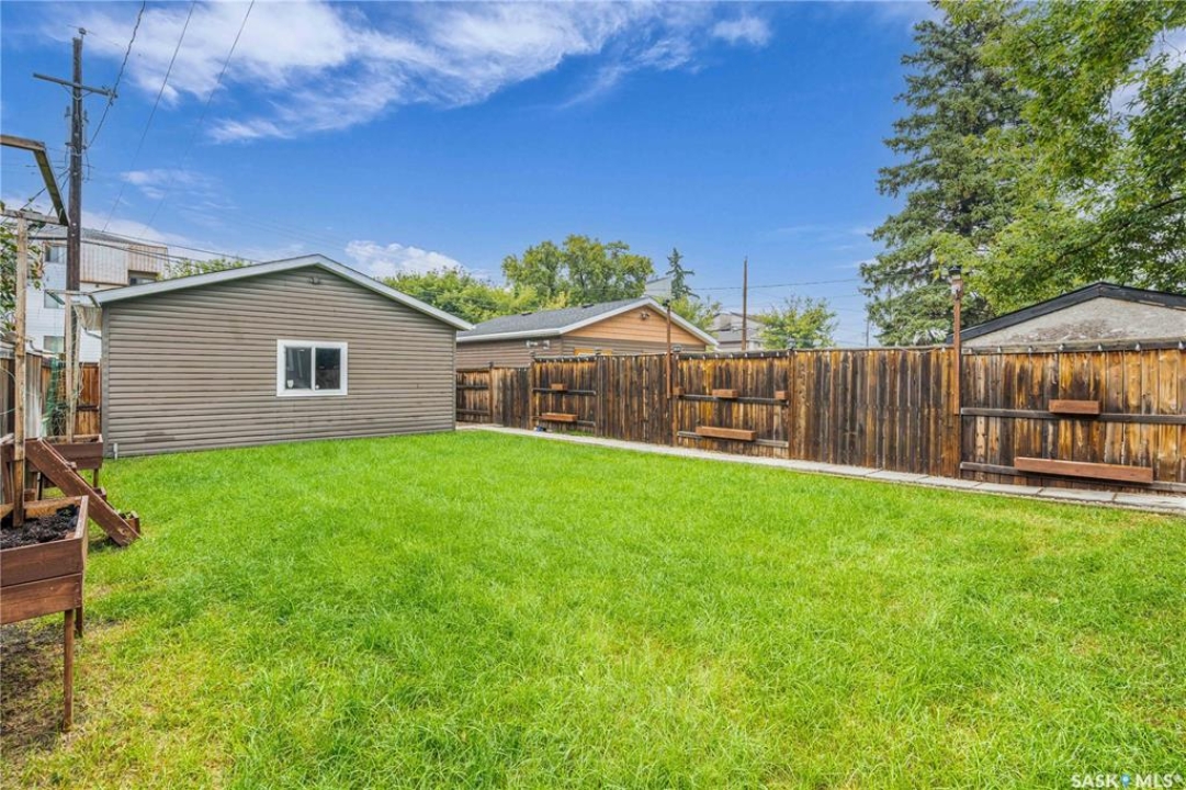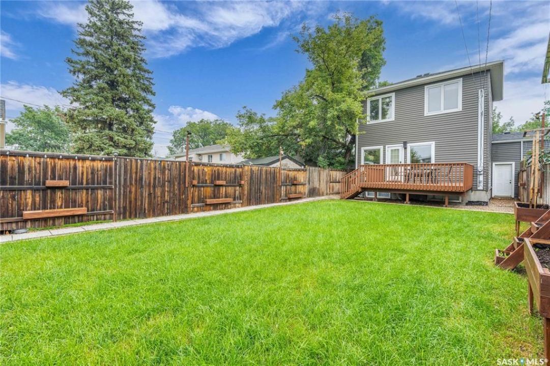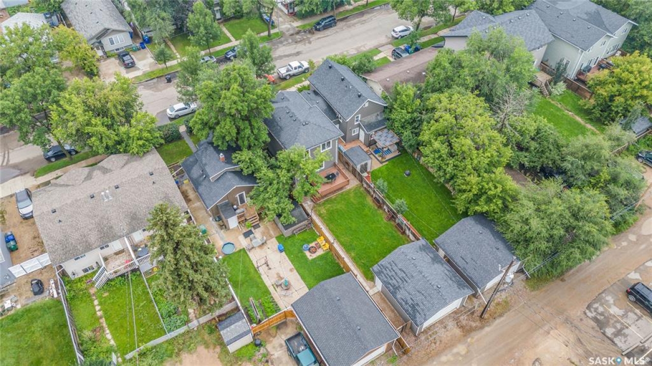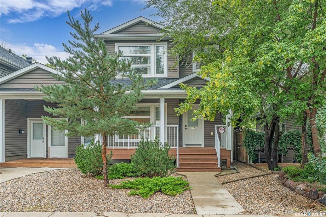 Tucked in the charming community of Sutherland near schools, restaurants, shopping & the best bakery in town, you'll find your next home. Whether you're a professional or student requiring easy access to the U of S or RUH, quick access to Circle Dr or would like to be a hop, skip & jump from an elementary school, you will find all you need in this home with the access you are looking for. Upon arrival you are greeted by xeriscape landscaping & mature trees providing privacy for the covered front porch. The spacious home welcomes you with an open floor plan, with natural light beaming through large windows, bounding off the main floors 9' ceilings. All windows have custom Hunter Douglas blinds for ample privacy when needed. A 2 piece bathroom is also conveniently located as you enter the home. Making your way through the living room, a large kitchen is at the heart of the home. The tasteful kitchen features stone countertops, an eat up island and a pantry that will provide ample storage. The spacious dining room can comfortably host a 6 person table for your entertaining needs. Upstairs you will find a primary bedroom with vaulted ceilings and large windows that flood the room with natural light. A walk in closet and 4 piece ensuite round out this space, perfect for unwinding after a long day or starting your morning. A 4 piece main bathroom and laundry room separate the other two bedrooms on this level. The basement has large windows allowing for exceptional natural light and is open for your future development. Off the dining room you will find a large deck overlooking a large back yard, complete with a lawn and underground sprinklers. An attached storage shed creates privacy between your home and the attached neighbouring property-no direct shared wall. A double detached garage accessible through the lane rounds out this inviting and practical home. Prompt possession is possible so if you are looking for an affordable home in Saskatoon, you need to check it out!