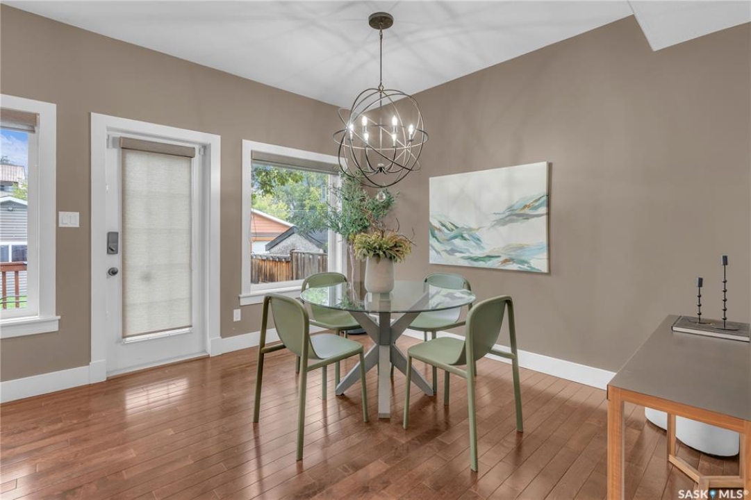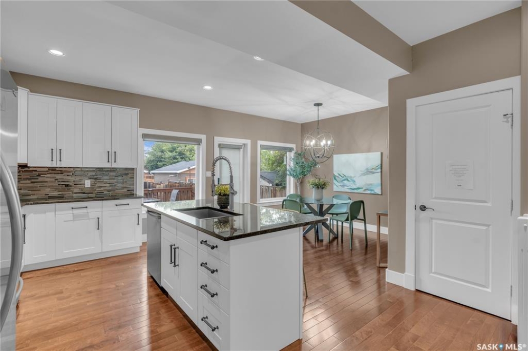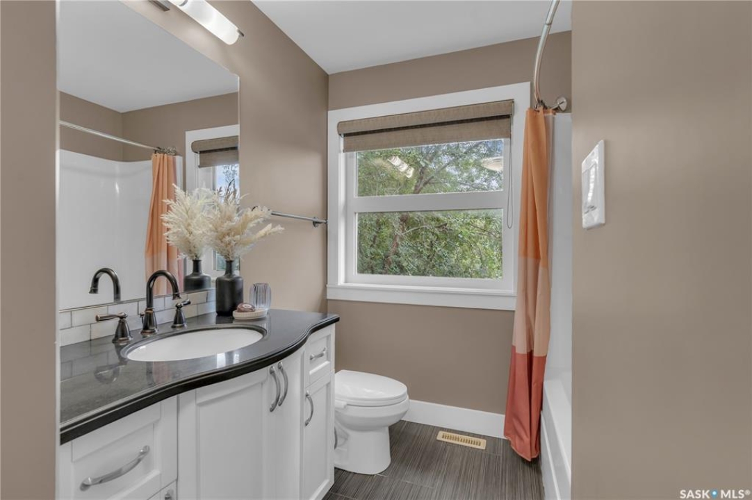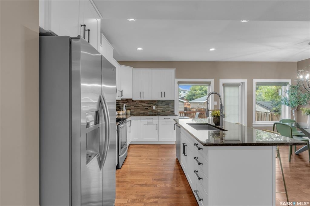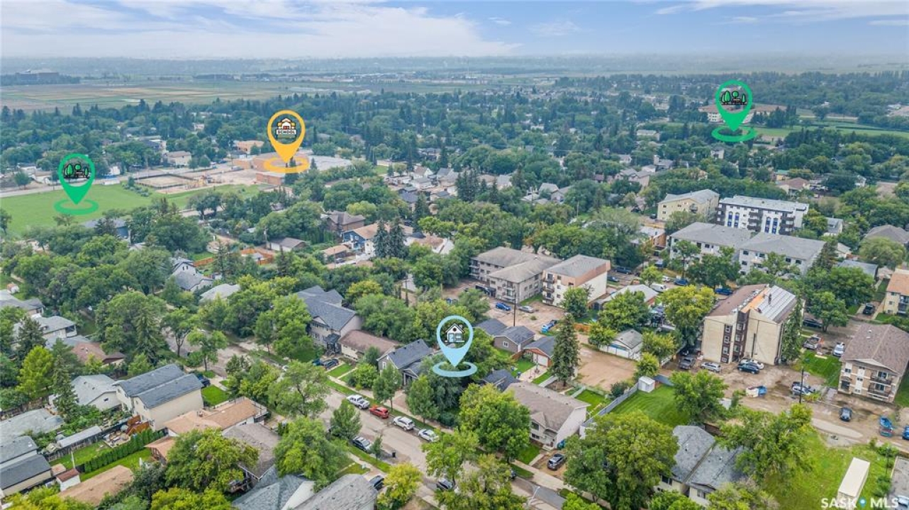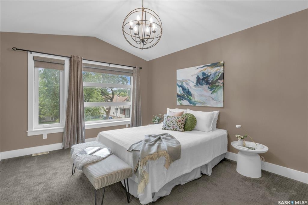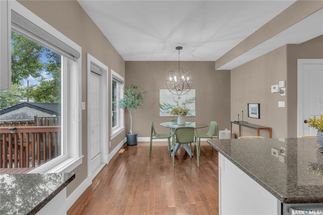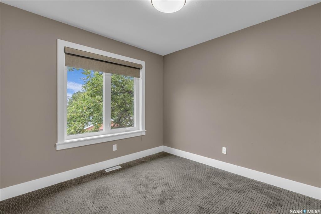 Tucked in the charming community of Sutherland near schools, restaurants, shopping & the best bakery in town, you'll find your next home. Whether you're a professional or student requiring easy access to the U of S or RUH, quick access to Circle Dr or would like to be a hop, skip & jump from an elementary school, you will find all you need in this home with the access you are looking for. Upon arrival you are greeted by xeriscape landscaping & mature trees providing privacy for the covered front porch. The spacious home welcomes you with an open floor plan, with natural light beaming through large windows, bounding off the main floors 9' ceilings. All windows have custom Hunter Douglas blinds for ample privacy when needed. A 2 piece bathroom is also conveniently located as you enter the home. Making your way through the living room, a large kitchen is at the heart of the home. The tasteful kitchen features stone countertops, an eat up island and a pantry that will provide ample storage. The spacious dining room can comfortably host a 6 person table for your entertaining needs. Upstairs you will find a primary bedroom with vaulted ceilings and large windows that flood the room with natural light. A walk in closet and 4 piece ensuite round out this space, perfect for unwinding after a long day or starting your morning. A 4 piece main bathroom and laundry room separate the other two bedrooms on this level. The basement has large windows allowing for exceptional natural light and is open for your future development. Off the dining room you will find a large deck overlooking a large back yard, complete with a lawn and underground sprinklers. An attached storage shed creates privacy between your home and the attached neighbouring property-no direct shared wall. A double detached garage accessible through the lane rounds out this inviting and practical home. Prompt possession is possible so if you are looking for an affordable home in Saskatoon, you need to check it out!