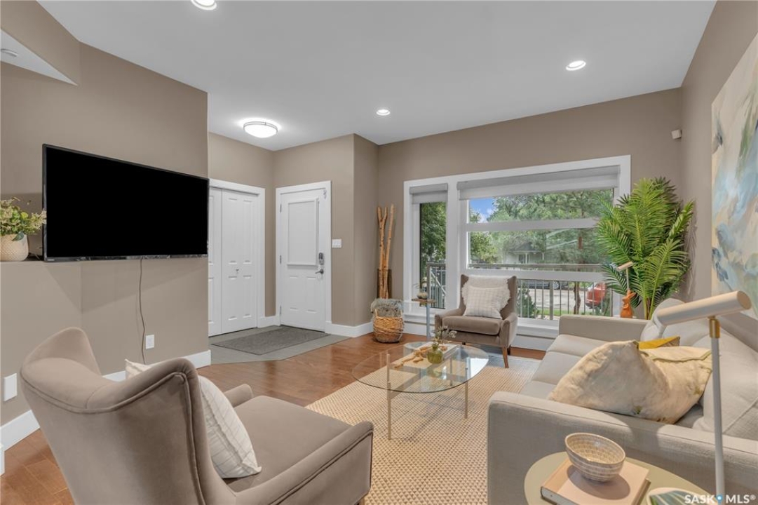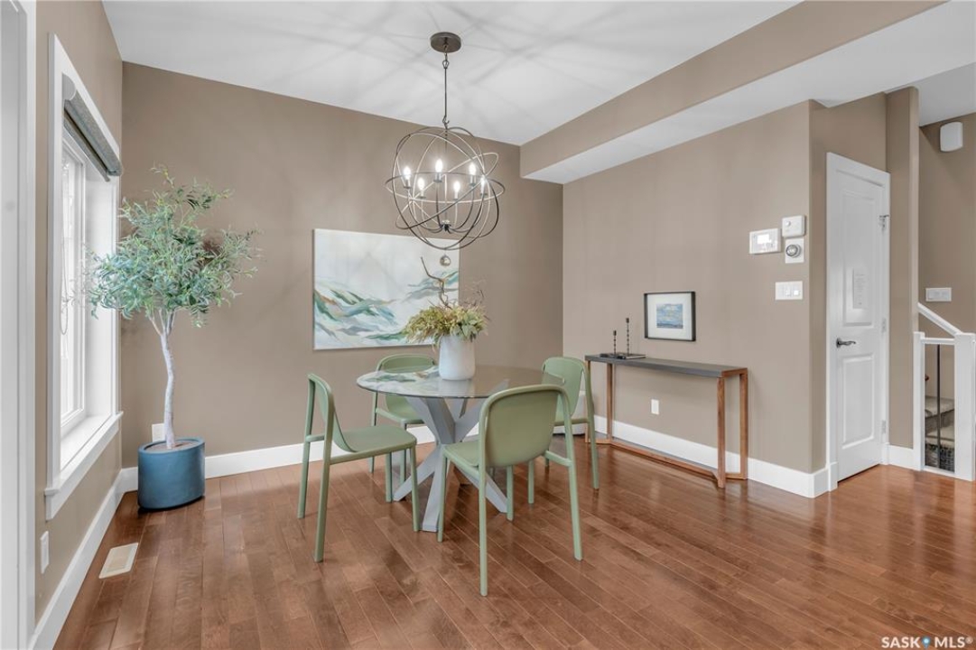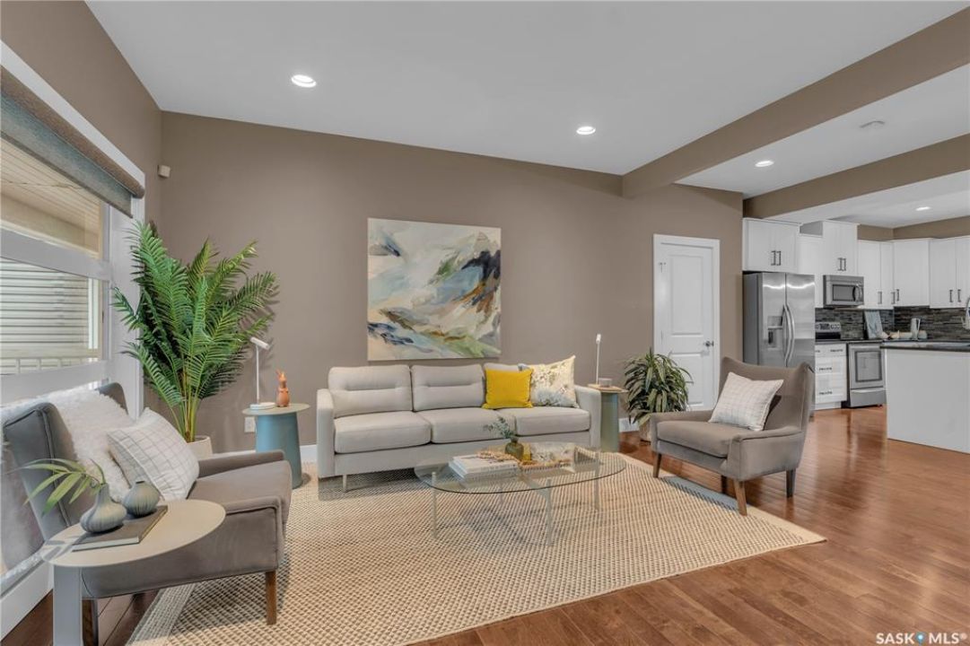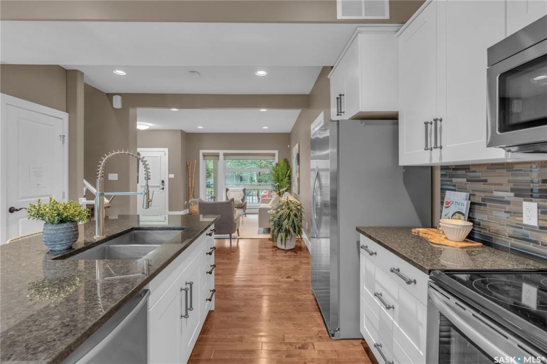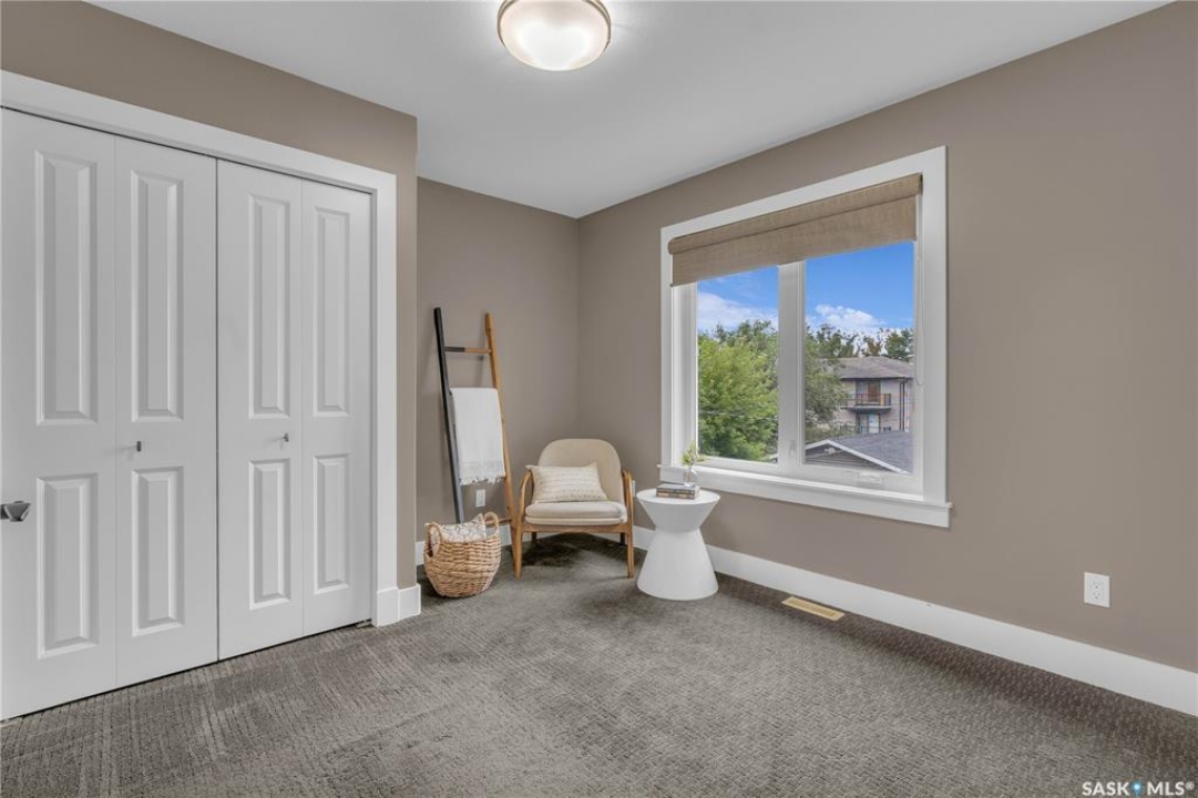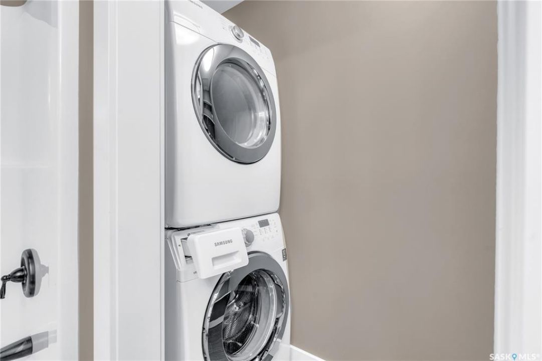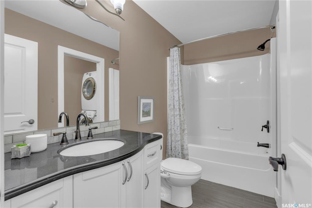 Tucked in the charming community of Sutherland near schools, restaurants, shopping & the best bakery in town, you'll find your next home. Whether you're a professional or student requiring easy access to the U of S or RUH, quick access to Circle Dr or would like to be a hop, skip & jump from an elementary school, you will find all you need in this home with the access you are looking for. Upon arrival you are greeted by xeriscape landscaping & mature trees providing privacy for the covered front porch. The spacious home welcomes you with an open floor plan, with natural light beaming through large windows, bounding off the main floors 9' ceilings. All windows have custom Hunter Douglas blinds for ample privacy when needed. A 2 piece bathroom is also conveniently located as you enter the home. Making your way through the living room, a large kitchen is at the heart of the home. The tasteful kitchen features stone countertops, an eat up island and a pantry that will provide ample storage. The spacious dining room can comfortably host a 6 person table for your entertaining needs. Upstairs you will find a primary bedroom with vaulted ceilings and large windows that flood the room with natural light. A walk in closet and 4 piece ensuite round out this space, perfect for unwinding after a long day or starting your morning. A 4 piece main bathroom and laundry room separate the other two bedrooms on this level. The basement has large windows allowing for exceptional natural light and is open for your future development. Off the dining room you will find a large deck overlooking a large back yard, complete with a lawn and underground sprinklers. An attached storage shed creates privacy between your home and the attached neighbouring property-no direct shared wall. A double detached garage accessible through the lane rounds out this inviting and practical home. Prompt possession is possible so if you are looking for an affordable home in Saskatoon, you need to check it out!