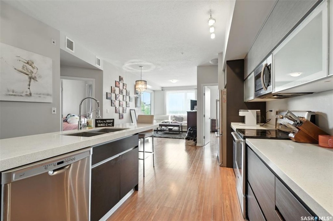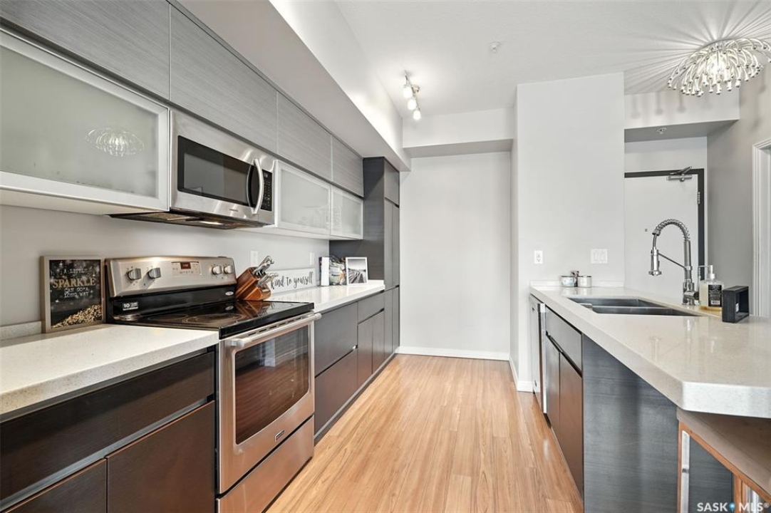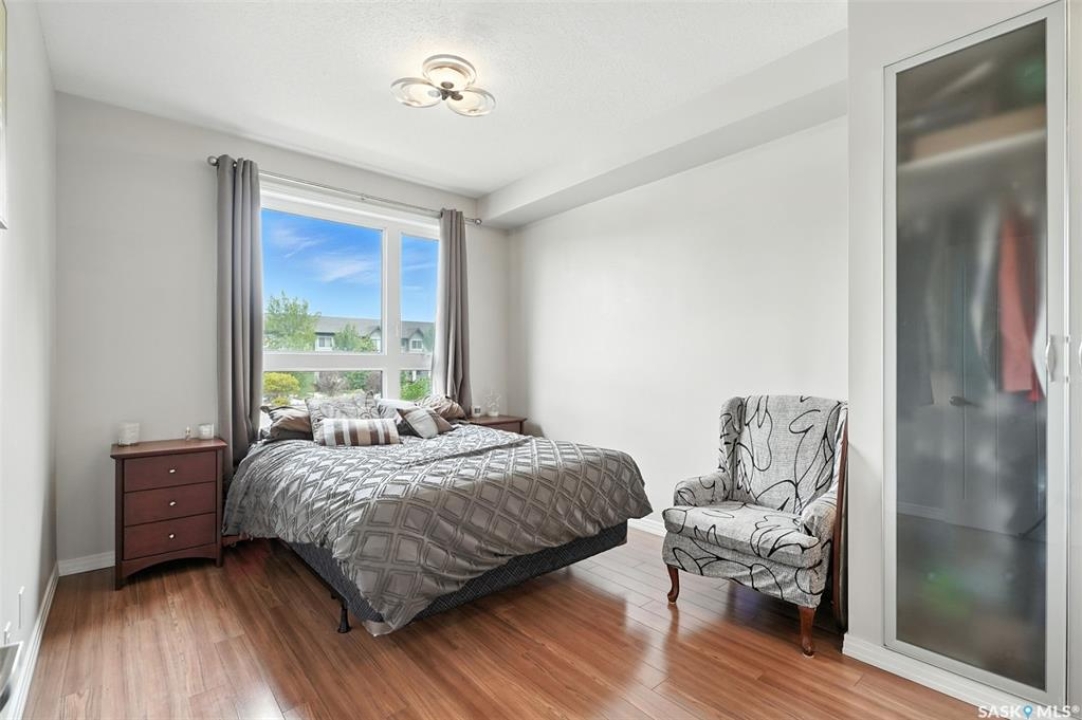 This lovely two bedroom, 2 bathroom condo is located in the Evergreen area and is minutes away to many amenities! . The kitchen features quartz countertops, tile backsplash, massive island, and stainless-steel appliances. The living room has large windows and access to your spacious balcony! The master bedroom is massive in size with custom organizers and shelving, as well as a 3-pc ensuite featuring dual vanity with quartz counter, and tile flooring. There also is a good-sized bedroom, 4-pc bath and in-suite laundry. This condo includes one underground parking stall and pet friendly with restrictions.