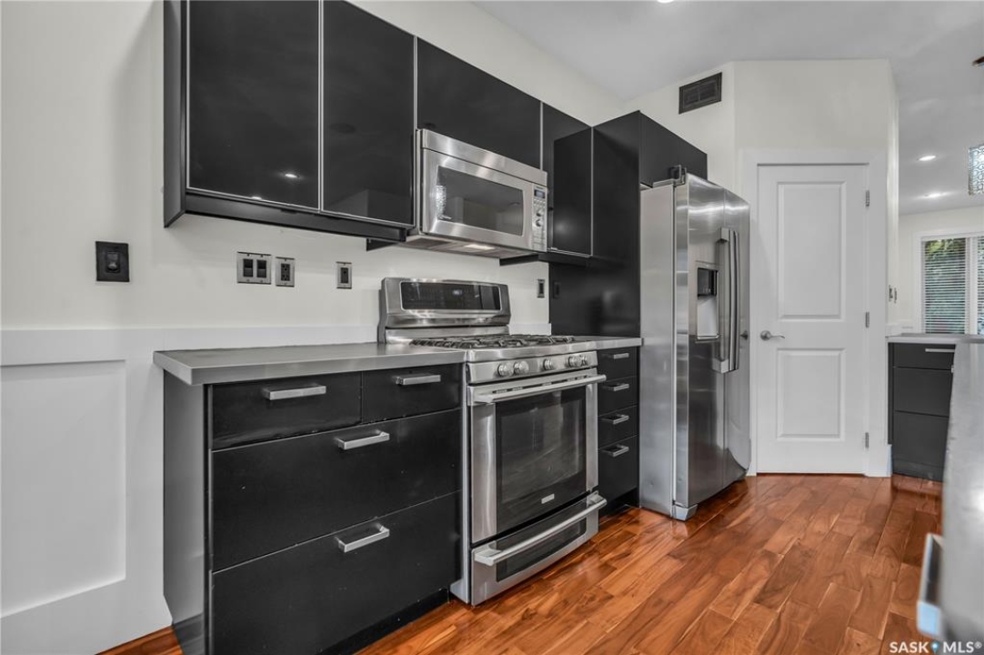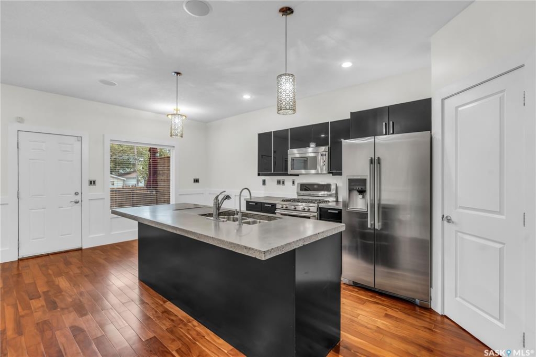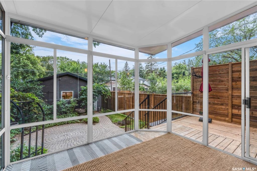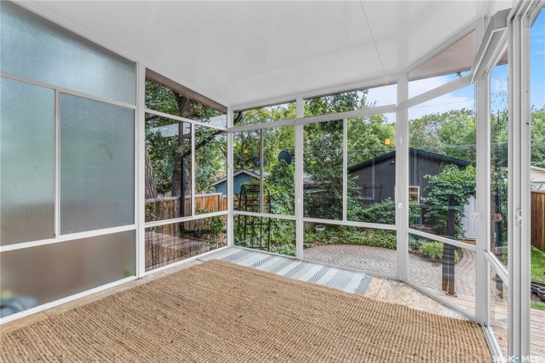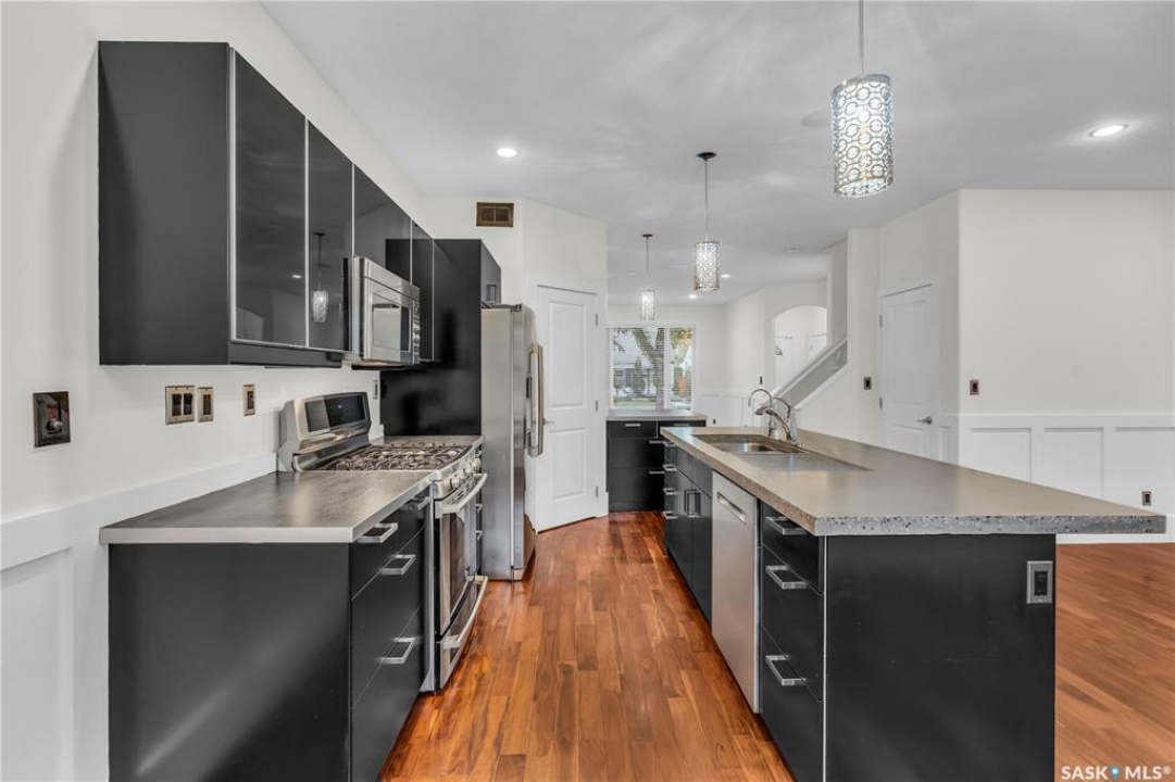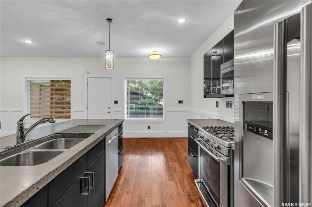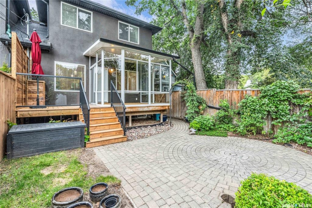 Welcome to your perfect Haultain home. Located just steps away from desirable Broadway. Inviting street appeal with stone/ stucco exterior surrounded by beautiful trees. You are welcomed with spacious front entry and arch walkway leading you into main living space. Beautiful Walnut hardwood floors complimented by fresh crisp walls (professionally painted with scuffx). Exceptionally spacious dining area (perfect for entertaining) along with extra kitchen living space for whatever you desire. Modern kitchen with walk in pantry giving open concept but still lots of storage. Large windows throughout showcasing all the mature trees around. Second floor has lovely primary bedroom with vaulted ceilings, large walk in closet and spacious ensuite. Two additional bedrooms on this level with another full bath. Laundry room/hookup also located on 2nd level. Down to the basement level where you will find plenty of open space. Feature stone natural gas fireplace make for cozy evenings. Wide open area perfect for gym, play area, office or can be easily converted to additional bedrooms. Excellent laundry room with plenty of storage completely (separate from utility room) along with 4th bath. Outside you will love the sun room making for plenty of use in the shoulder seasons. Enjoy backyard ease with brand new glass railing, brand new fence and mature courtyard. Double detached garage with plenty of back ally space. Separate side entry giving option for suite. Furnace and air conditioner (5years old), newer Bosch washer/dryer and dishwasher, reverse osmosis, built in sound system with speakers throughout, smart thermostat, rubberized front walkway/steps and attic exhaust fan. Move in with no hassle in this fully finished infill home in the location you have always wanted. All amenities very close. *NOTE Corner homes beside are both being demolished and brand large single dwelling home being built :) View Today!