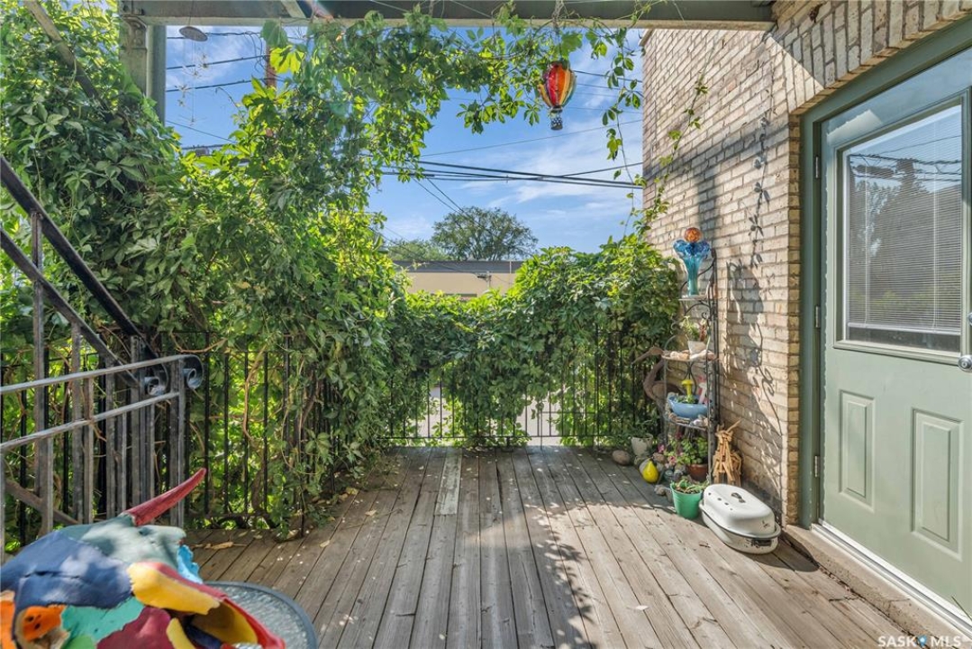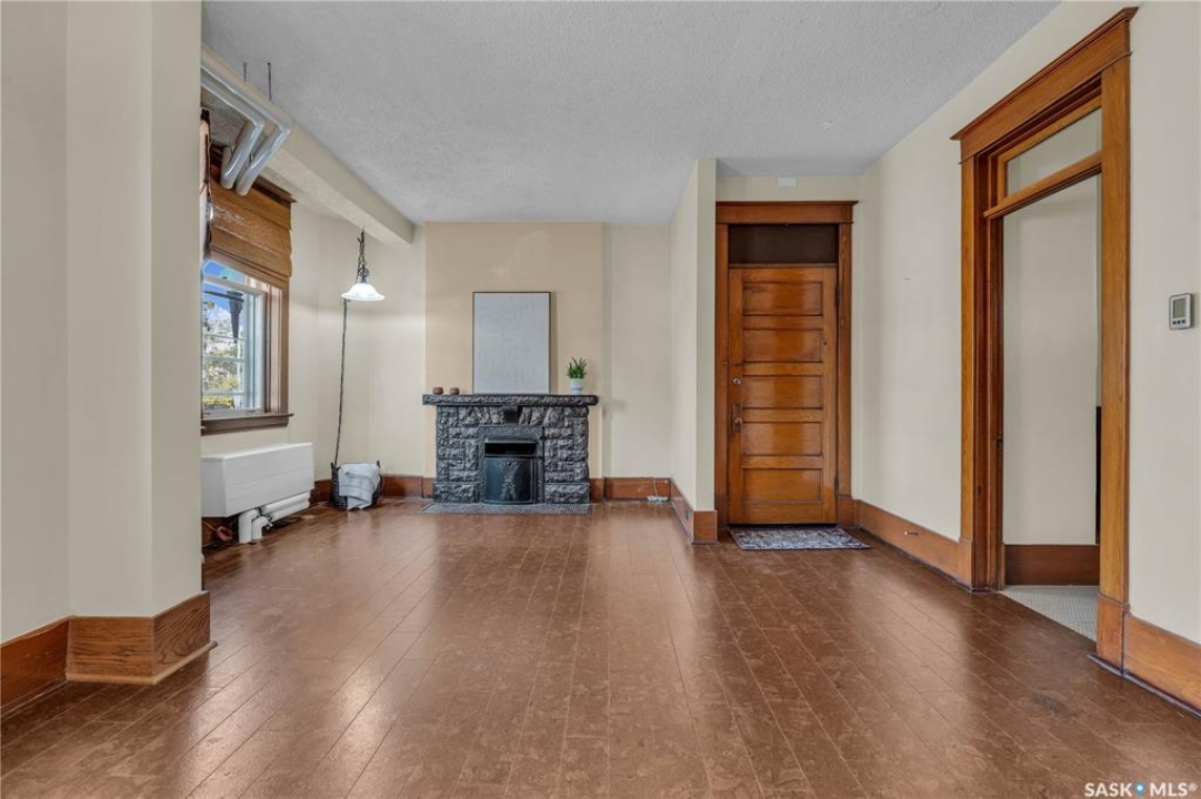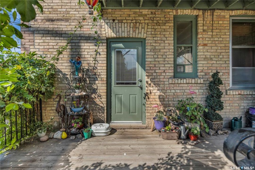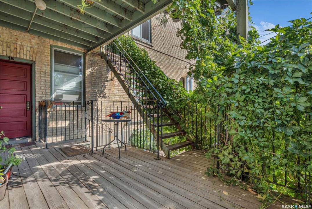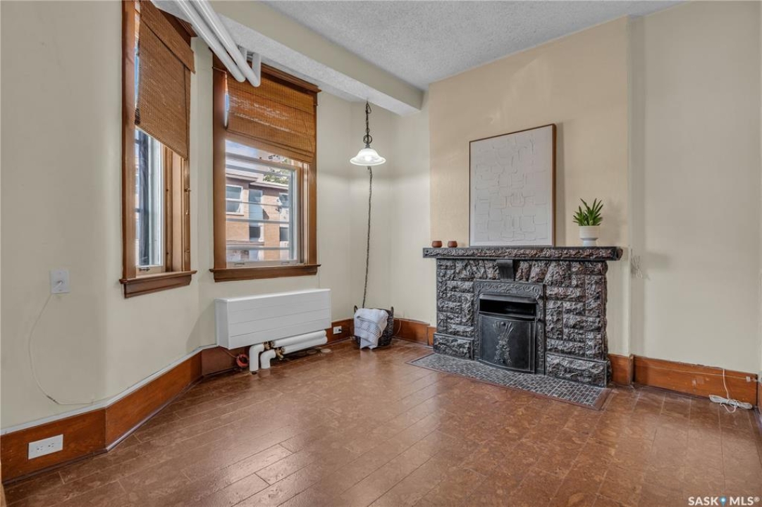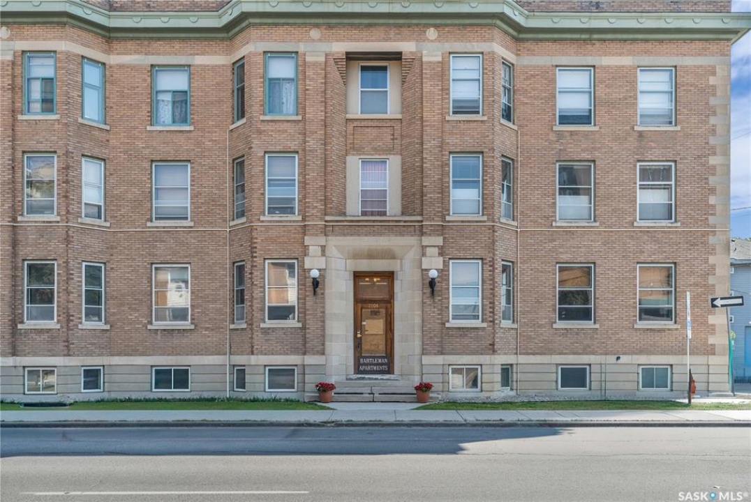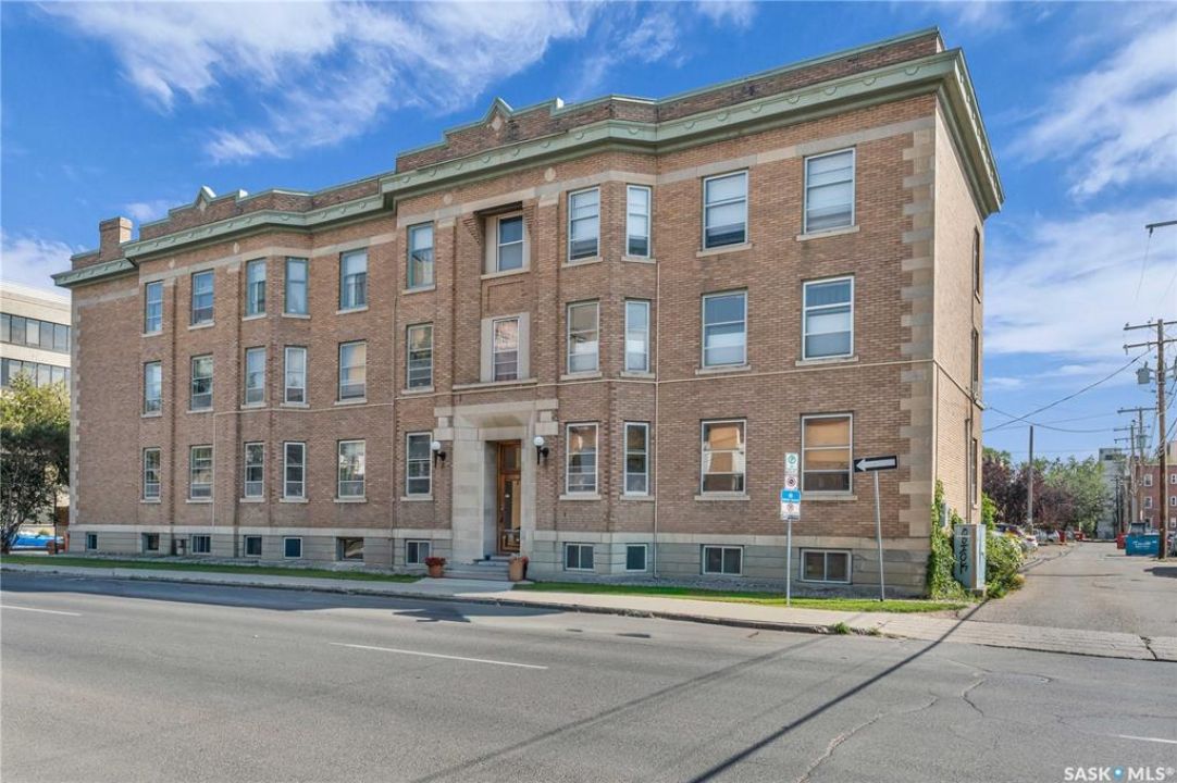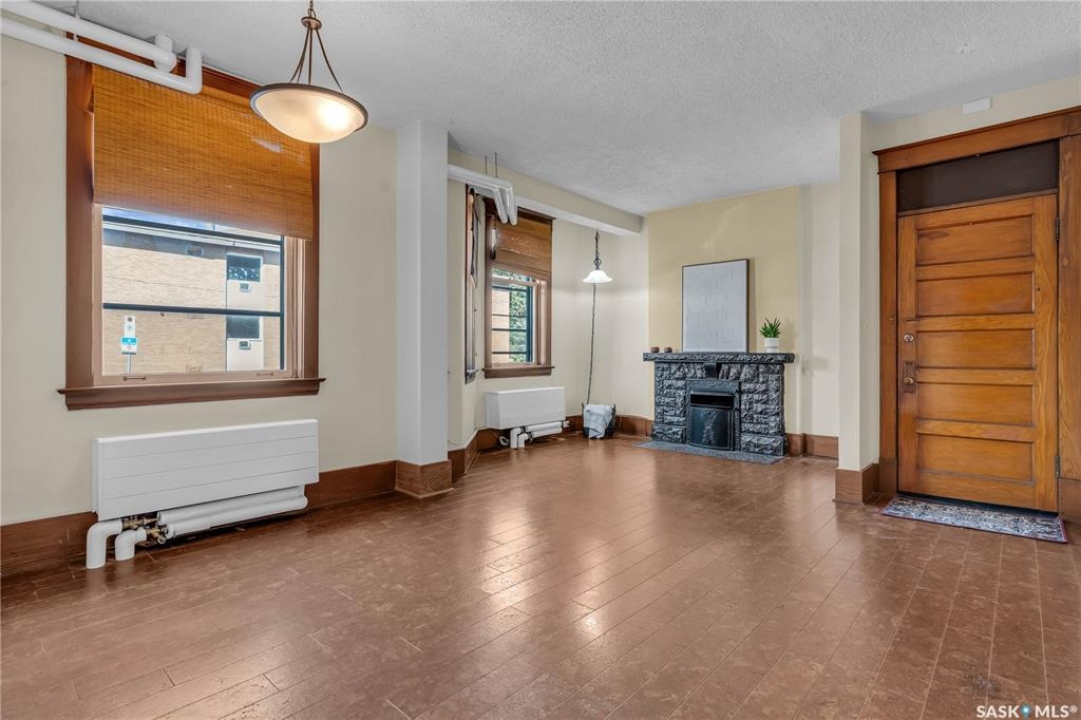 Welcome to this charming corner-unit condo located in the historic Bartleman Apartments, right in the heart of Regina's downtown. Step inside to an open-concept living and dining area where extra windows unique to the corner location fill the space with natural light, highlighting high ceilings and timeless details like original trim, tall baseboards, and classic doors. The space is anchored by a decorative fireplace and finished with cork flooring, adding both warmth and character. An archway leads to the kitchen and secondary bedroom, creating a beautiful flow between rooms. The bright white kitchen is tucked just off the main living space and offers plenty of cabinetry, counter space, and tiled flooring with room to add a coffee bar or buffet if desired, making it both functional and inviting. A garden door extends the living space outdoors to a patio surrounded by greenery, an ideal spot to enjoy your morning coffee or unwind at the end of the day. The primary bedroom offers plenty of room for a king-sized bedroom set and sits adjacent to the 4-piece bathroom. The bathroom features tiled flooring, a tiled shower/tub combo, a storage unit, and a convenient second entry from the main living area. A secondary bedroom off the main living area is complete with a beautiful chandelier and can serve as a home office, reading nook, or guest bedroom with the addition of a wardrobe. Parking is simple with one dedicated stall steps from the back entrance, plus plenty of street parking for guests. What makes this condo especially appealing is the lifestyle it offers. For downtown professionals, the location means you can walk to the office, stop at your favourite café, or head out to dinner without ever needing to drive. Wascana Park, The Museum, local favourites like Tangerine, Fireside Bistro, Niche Yoga & Therapy, and Leo's OG, plus the many shops along 13th Avenue, are all within walking distance. Move-in ready with quick possession available.