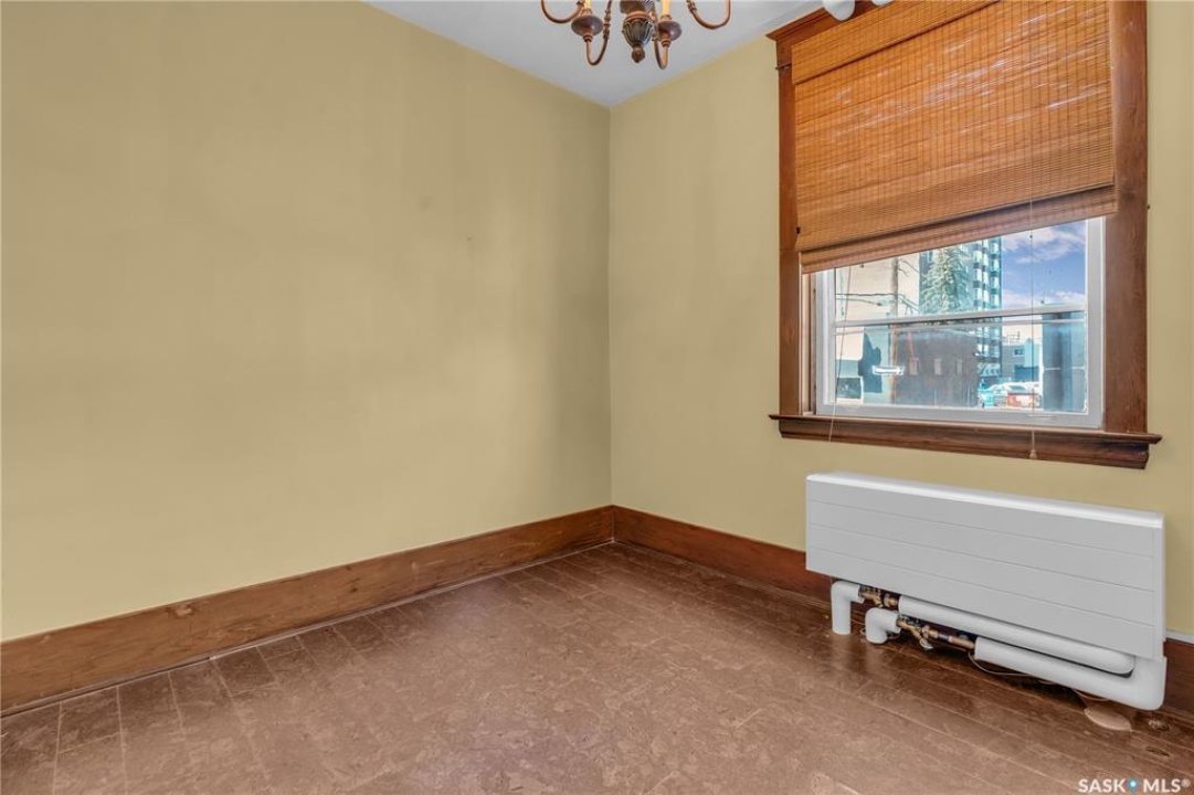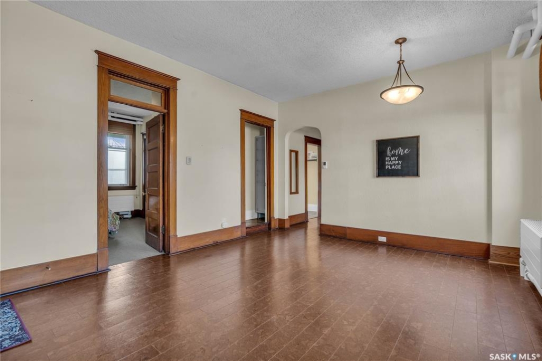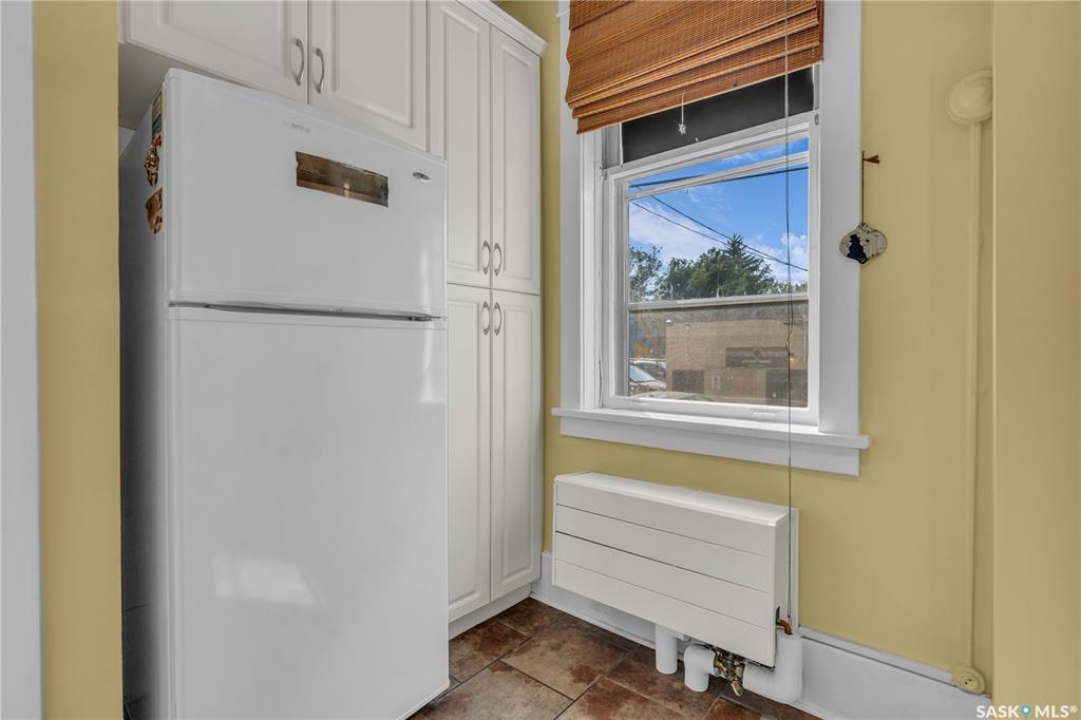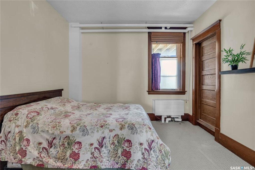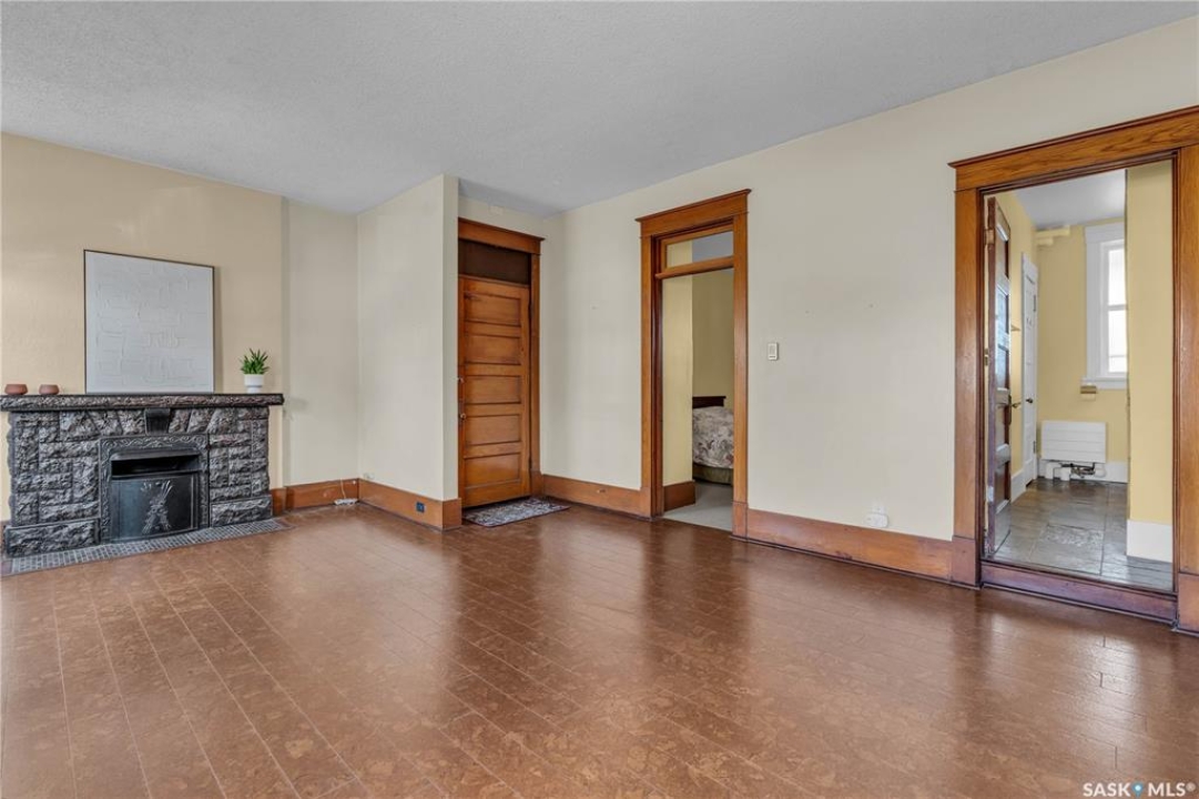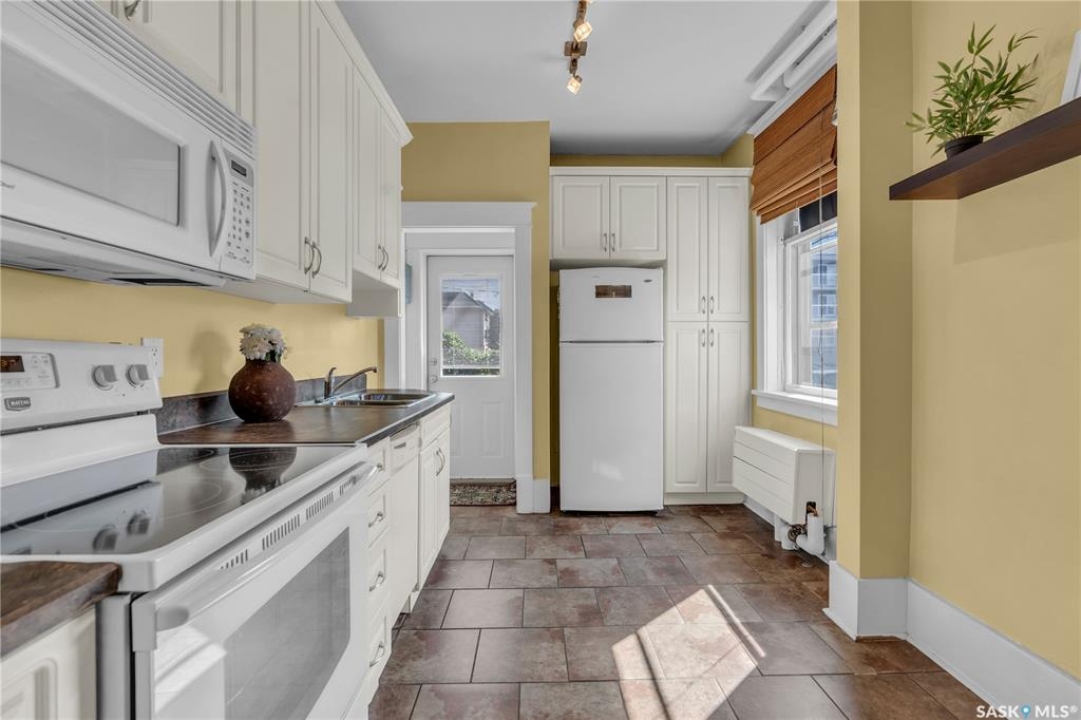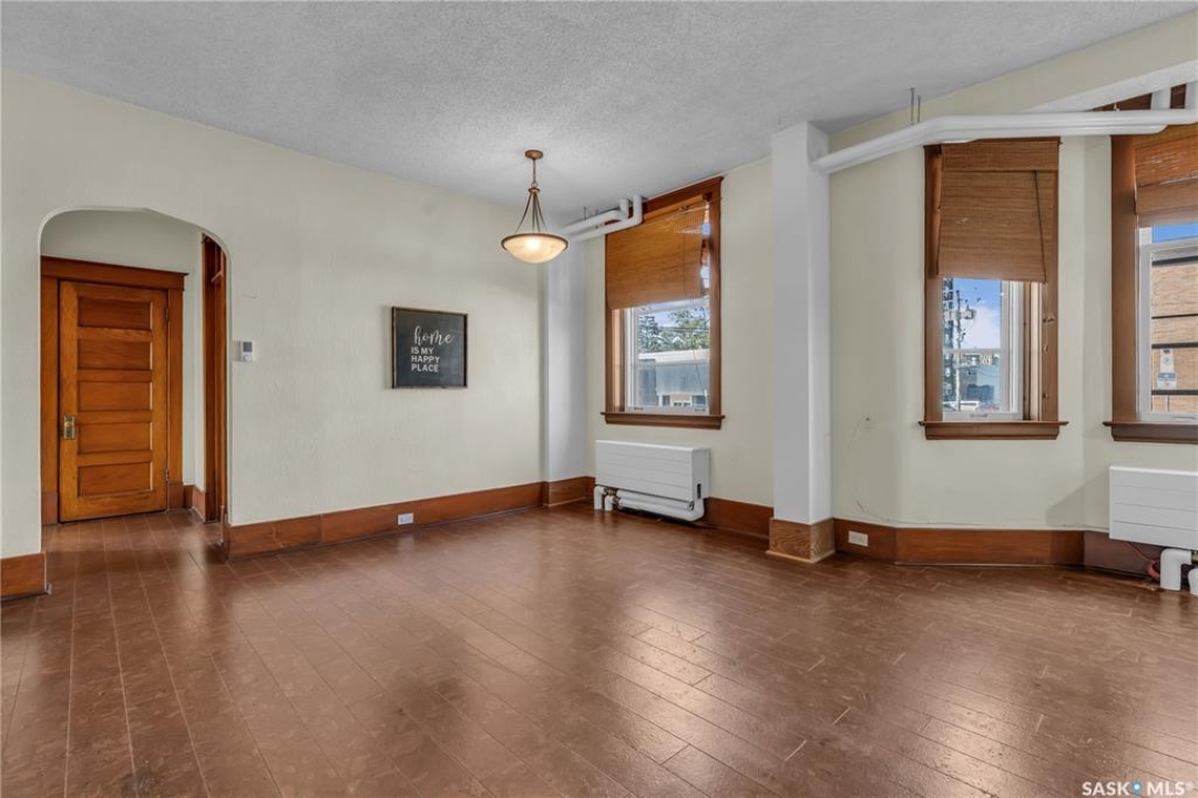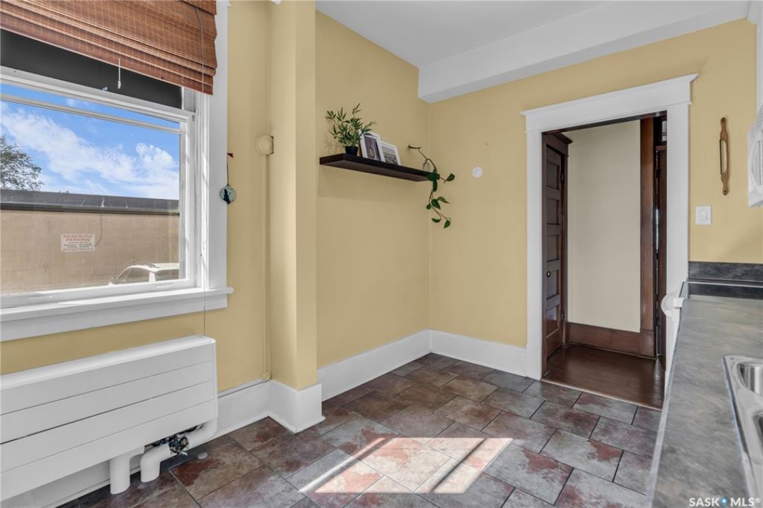 Welcome to this charming corner-unit condo located in the historic Bartleman Apartments, right in the heart of Regina's downtown. Step inside to an open-concept living and dining area where extra windows unique to the corner location fill the space with natural light, highlighting high ceilings and timeless details like original trim, tall baseboards, and classic doors. The space is anchored by a decorative fireplace and finished with cork flooring, adding both warmth and character. An archway leads to the kitchen and secondary bedroom, creating a beautiful flow between rooms. The bright white kitchen is tucked just off the main living space and offers plenty of cabinetry, counter space, and tiled flooring with room to add a coffee bar or buffet if desired, making it both functional and inviting. A garden door extends the living space outdoors to a patio surrounded by greenery, an ideal spot to enjoy your morning coffee or unwind at the end of the day. The primary bedroom offers plenty of room for a king-sized bedroom set and sits adjacent to the 4-piece bathroom. The bathroom features tiled flooring, a tiled shower/tub combo, a storage unit, and a convenient second entry from the main living area. A secondary bedroom off the main living area is complete with a beautiful chandelier and can serve as a home office, reading nook, or guest bedroom with the addition of a wardrobe. Parking is simple with one dedicated stall steps from the back entrance, plus plenty of street parking for guests. What makes this condo especially appealing is the lifestyle it offers. For downtown professionals, the location means you can walk to the office, stop at your favourite café, or head out to dinner without ever needing to drive. Wascana Park, The Museum, local favourites like Tangerine, Fireside Bistro, Niche Yoga & Therapy, and Leo's OG, plus the many shops along 13th Avenue, are all within walking distance. Move-in ready with quick possession available.