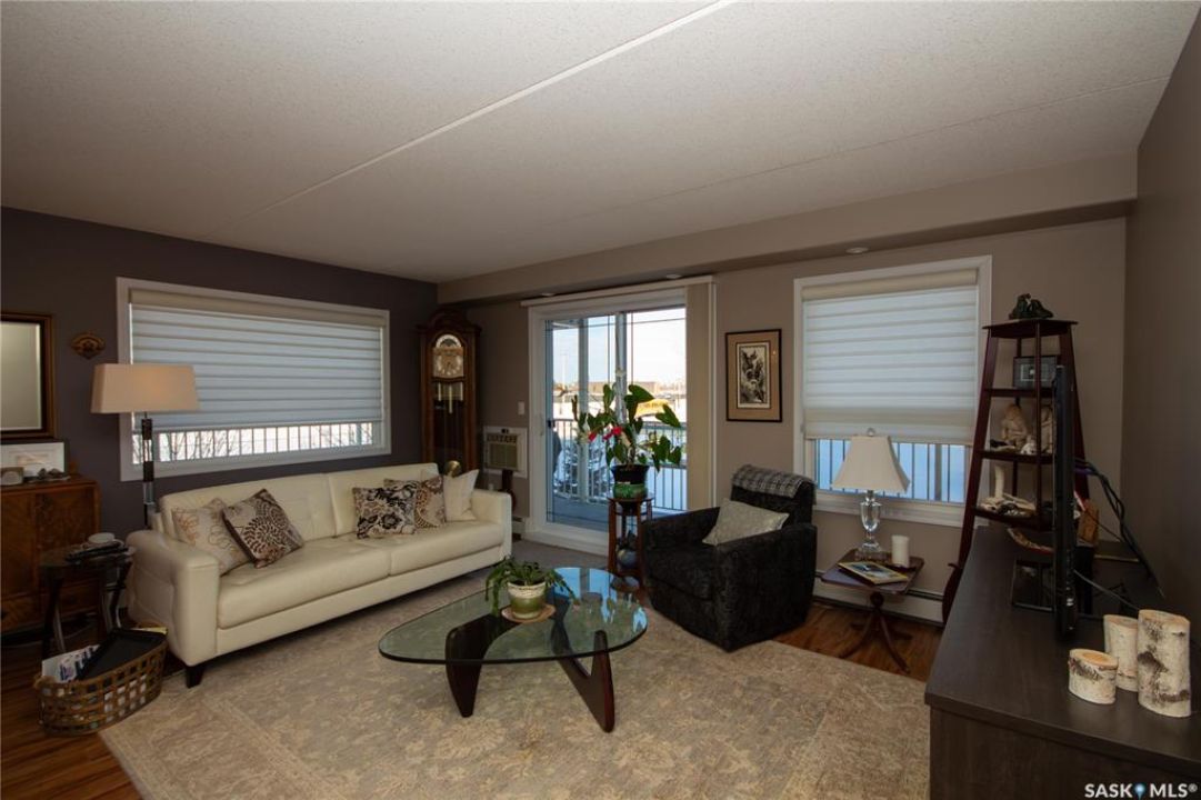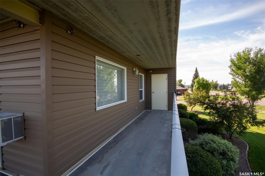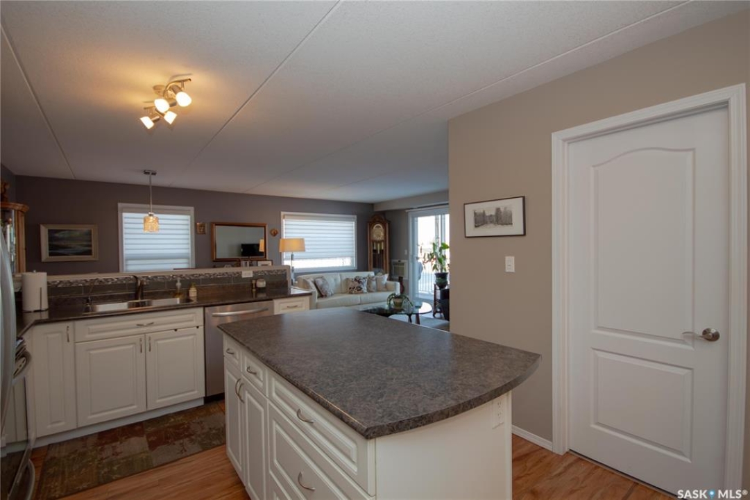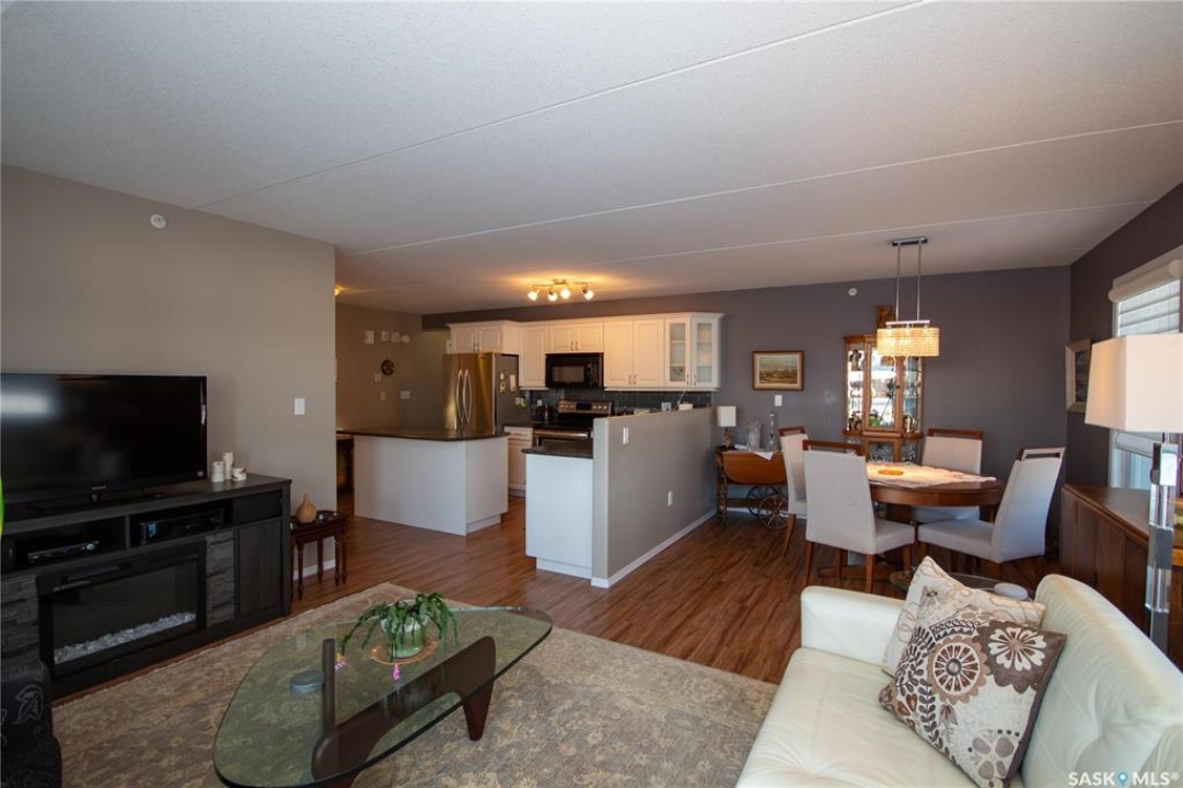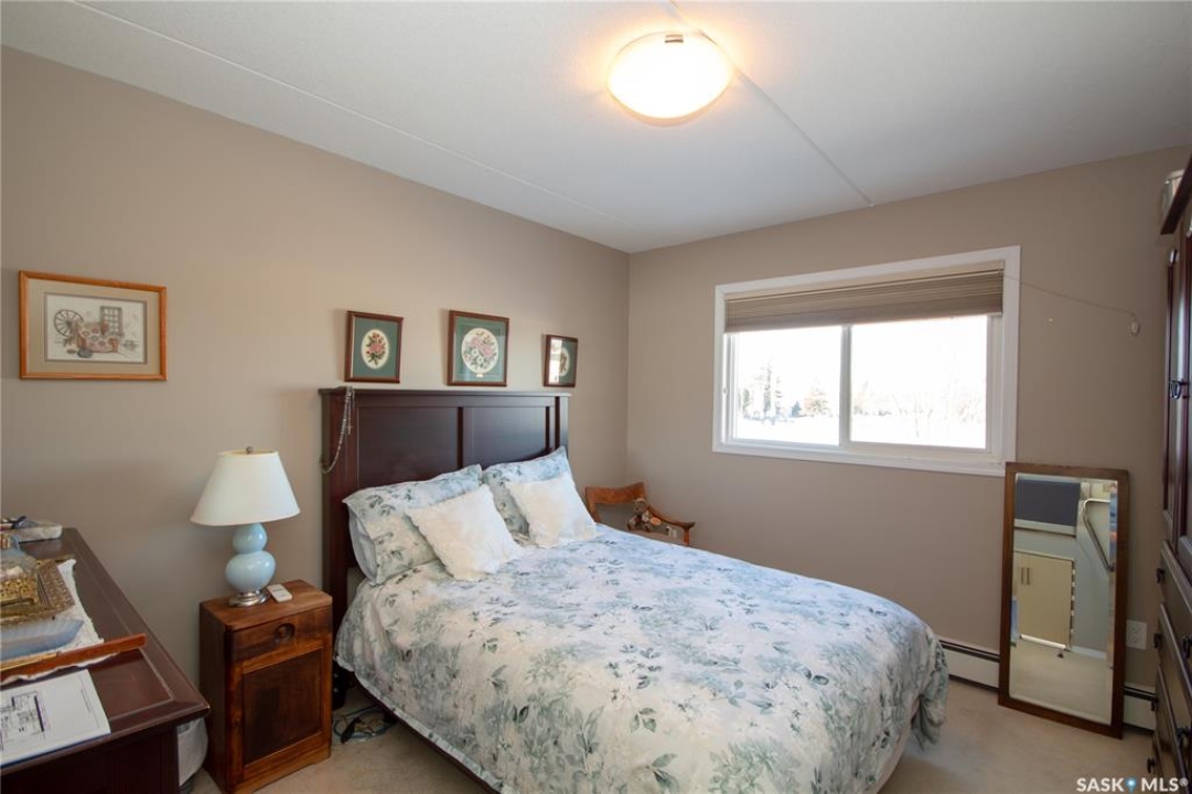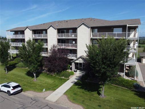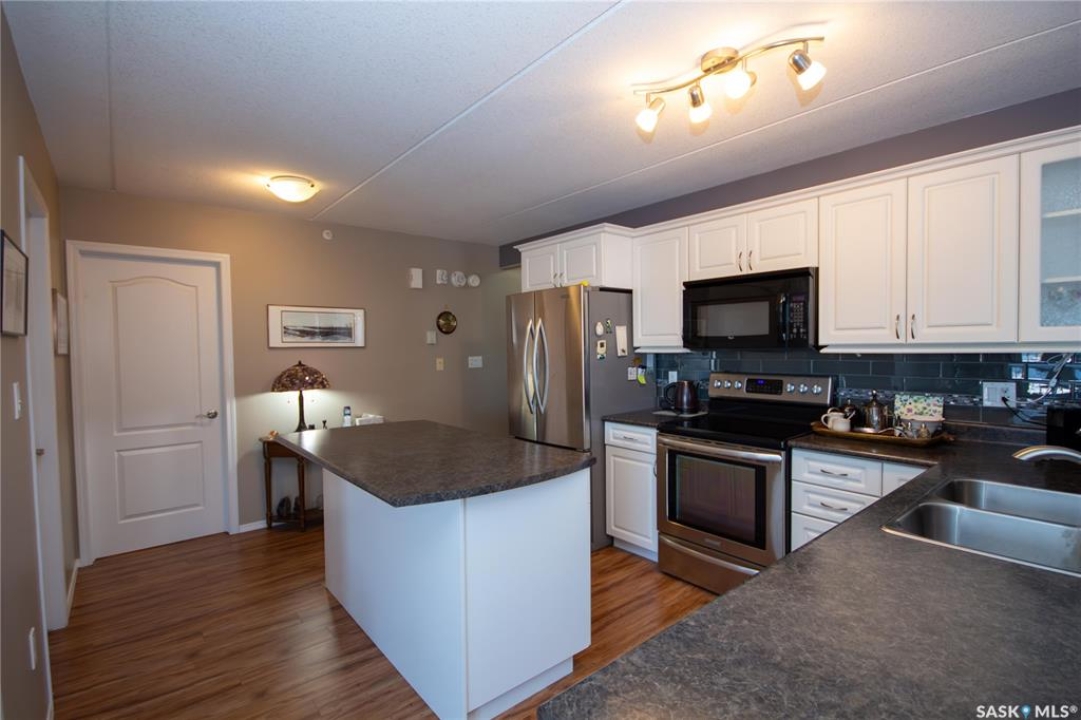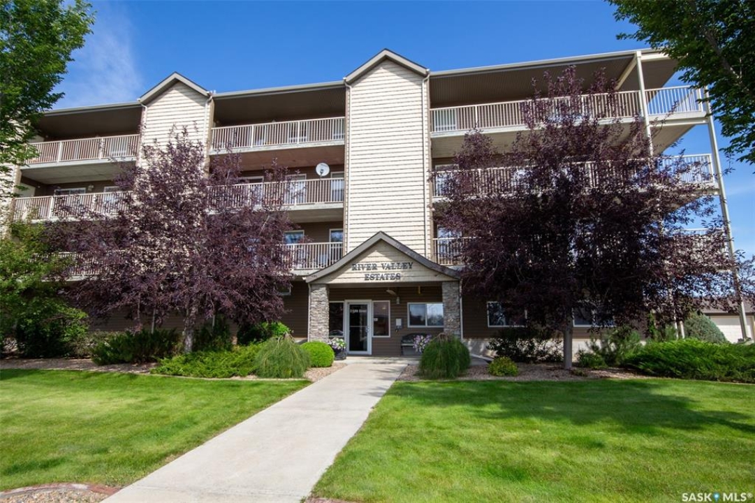 You'll experience comfortable living in this beautiful condo located on the 2nd floor of River Valley Estates in the Town of Battleford. This bright and cheery 1090sqft unit is located on the Northwest corner and has plenty of windows letting in natural light in every room. A spacious entrance way with a large closet welcomes you as you enter. The main living area is open concept and caters to the kitchen with an island, living room with patio doors to the balcony and a dining area with plenty of room for family & friends. A wrap around balcony is a lovely way to spend summer evening as you gaze at the evening sunsets. You'll appreciate the amazing amount of storage with 2 storage units at each end of the balcony. The large master bedroom is complete with an generous amount of closet space, a linen closet, and a 3pc en-suite for added privacy. The 2nd bedroom functions as a guest room or office space and there is also a 4pc main bathroom. The separate en-suite laundry with some storage is a convenient addition. All the appliances and window coverings will remain. The building has an elevator which makes it easy for anyone to have access. There is also an amenities room and exercise room to use. You'll love the heated indoor parking spot so you'll never have to brave the winter elements again! There's visitors parking as well. If you're ready for the carefree condo life call today to book your showing!