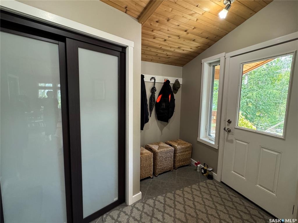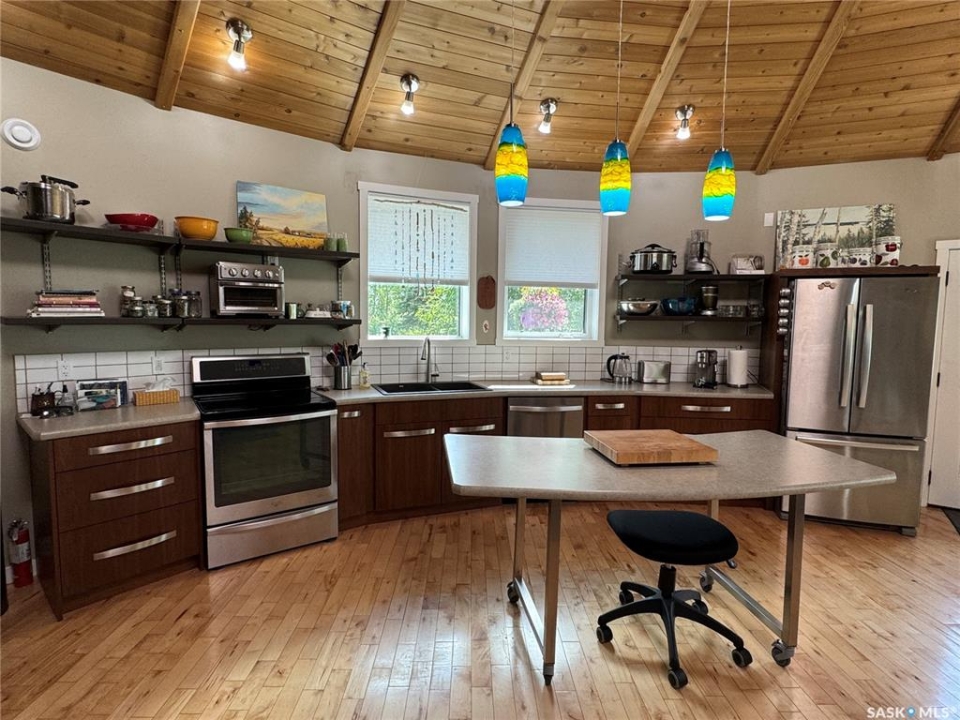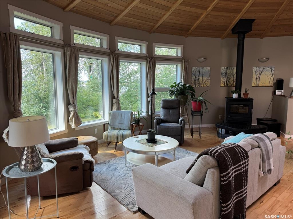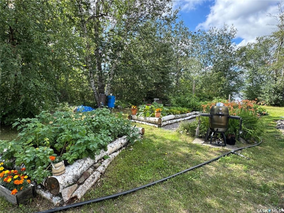 Must see LAKEFRONT house on a small lake just north of La Ronge!! This is your chance to purchase a truly one-of-a-kind home that was lovingly designed and constructed with so much care and attention to detail. Inspired by tipis and yurts, this is a gorgeous custom-design round home with a central skylight and south windows to benefit from passive solar heat, and cedar siding to stay in tune with its natural surroundings. The main level features an open concept living space with hardwood floors, a beautiful wood burning fireplace, a large kitchen with a large moveable island. This flows to the master bedroom, main bathroom with beautiful tile shower, and laundry room and office combo. The entire lower level benefits from in-floor heating in the polished concrete slab to keep your toes warm all winter long. The walk-out basement includes a large family room, two more spacious bedrooms, another full bathroom with a tub/shower, and plenty of storage. The utility room is carefully planned with a 750 G water holding tank, water heater, air exchanger, boiler for the in-floor heat, and a work bench. With spray foam insulation throughout the entire house and the passive solar design, your heating bills are quite reasonable, even in cold years. Outside, you will find the most gorgeous green spaces possible: a private sitting area down by the water, mature forest surrounding the property, beautiful vegetable and flower gardens, a fire pit, an outdoor shower, a guest house, and a workshop. This is your own little lakefront paradise in the north - and it is drive-in access only minutes from town - the best of both worlds!