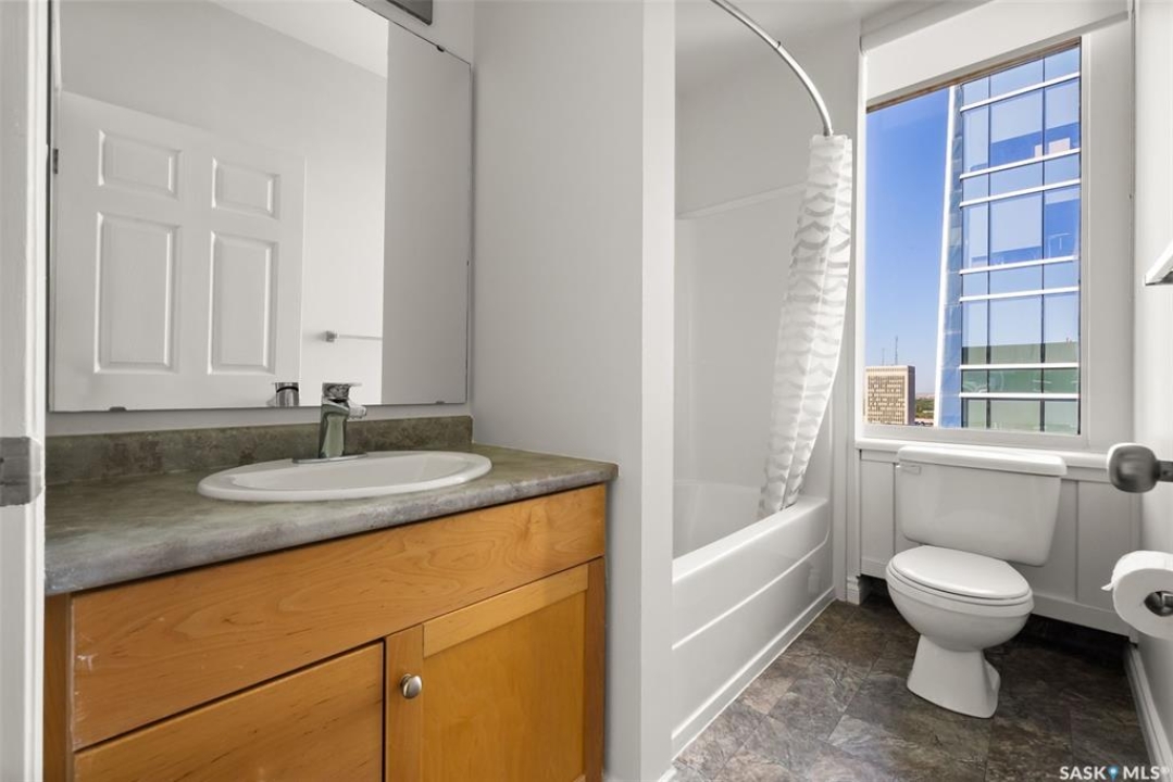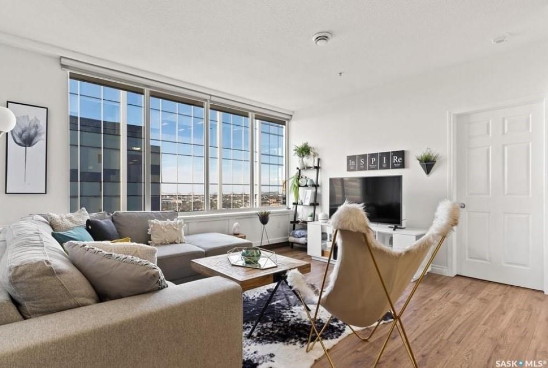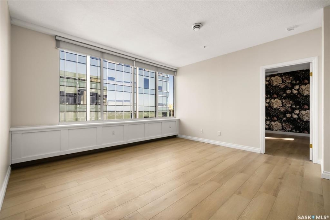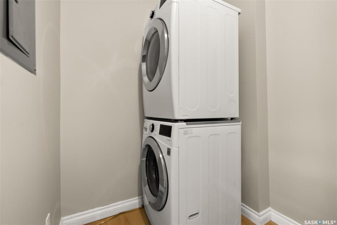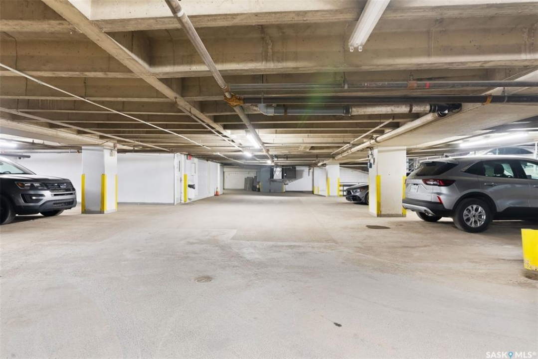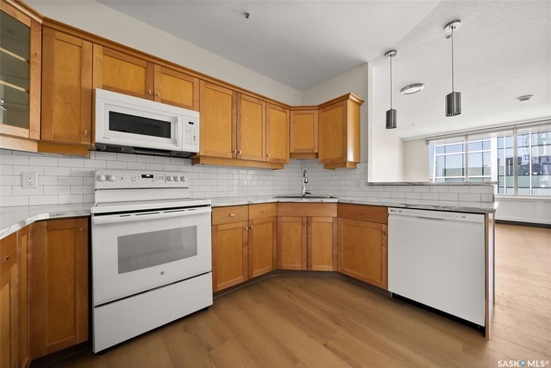 Enjoy city living at its best! This gorgeous upgraded 2 bed condo is move in ready and boasts awesome city views! Situated in the Hamilton building in the heart of downtown, this condo development has much to offer including concierge, a full gym, large amenities room, and outdoor patio with bbq area and hot tub for entertaining your guests or enjoying yourself. Upon entry, you are greeted with a bright and airy open plan living space. The nice sized kitchen features maple cabinetry with under cabinet lighting, updated hardware and new marble look laminate counters with new modern sink & taps (2019). There is also a new microwave hood fan (2020), dishwasher(2019) and stove (2020). Handy laundry/utility room off the kitchen with full size stackable washer and dryer (3 yrs old). There is a 2 seater eating bar between the kitchen and the spacious living room. High quality luxury waterproof laminate flooring flows throughout the condo. The living room features a wall of windows with stunning city views and there is a good sized dining area. Master bedroom is a nice size and boasts a gorgeous custom wall papered feature wall and a 2 pce ensuite with new hardware and tap plus double closet. On the opposite side of the condo is the 4 pce main bath and a 2nd bedroom with corner floor to ceiling windows boasting new blinds (2025) and fabulous views! 9 ft ceilings throughout the condo and new custom blinds to living room, master bedroom and 4 pce bath. Entire unit was professionally repainted in modern neutral tones in 2025. The building is concrete and this home is super quiet and soundproof! If you work downtown, no need to pay for parking as this unit comes with its own u/ground parking stall #42. There is also an on-floor garbage shoot and a place to store your bike! Move in and enjoy!