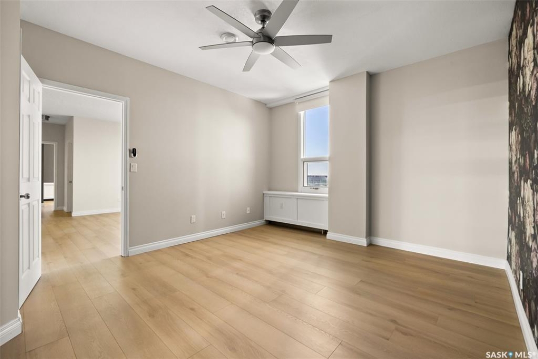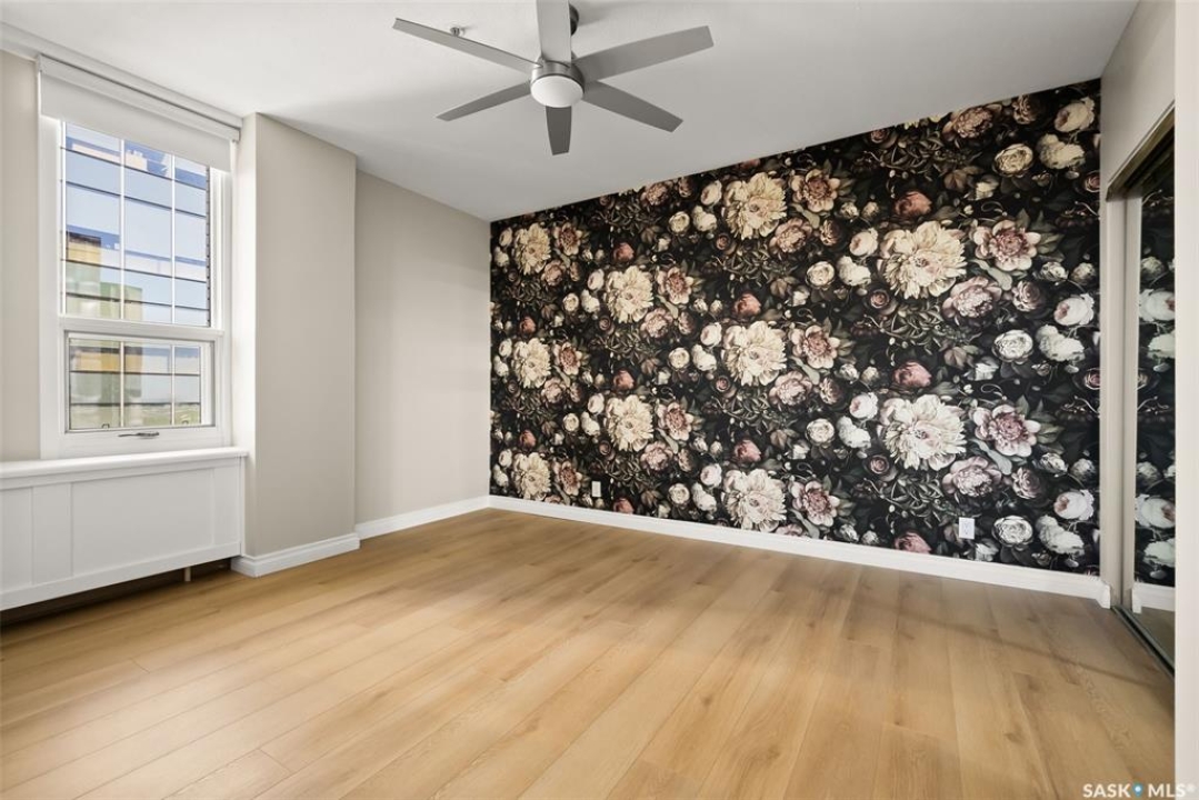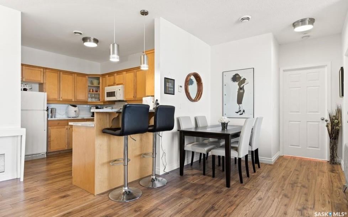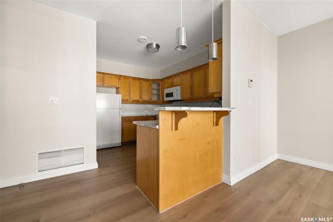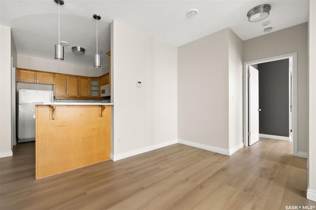 Enjoy city living at its best! This gorgeous upgraded 2 bed condo is move in ready and boasts awesome city views! Situated in the Hamilton building in the heart of downtown, this condo development has much to offer including concierge, a full gym, large amenities room, and outdoor patio with bbq area and hot tub for entertaining your guests or enjoying yourself. Upon entry, you are greeted with a bright and airy open plan living space. The nice sized kitchen features maple cabinetry with under cabinet lighting, updated hardware and new marble look laminate counters with new modern sink & taps (2019). There is also a new microwave hood fan (2020), dishwasher(2019) and stove (2020). Handy laundry/utility room off the kitchen with full size stackable washer and dryer (3 yrs old). There is a 2 seater eating bar between the kitchen and the spacious living room. High quality luxury waterproof laminate flooring flows throughout the condo. The living room features a wall of windows with stunning city views and there is a good sized dining area. Master bedroom is a nice size and boasts a gorgeous custom wall papered feature wall and a 2 pce ensuite with new hardware and tap plus double closet. On the opposite side of the condo is the 4 pce main bath and a 2nd bedroom with corner floor to ceiling windows boasting new blinds (2025) and fabulous views! 9 ft ceilings throughout the condo and new custom blinds to living room, master bedroom and 4 pce bath. Entire unit was professionally repainted in modern neutral tones in 2025. The building is concrete and this home is super quiet and soundproof! If you work downtown, no need to pay for parking as this unit comes with its own u/ground parking stall #42. There is also an on-floor garbage shoot and a place to store your bike! Move in and enjoy!