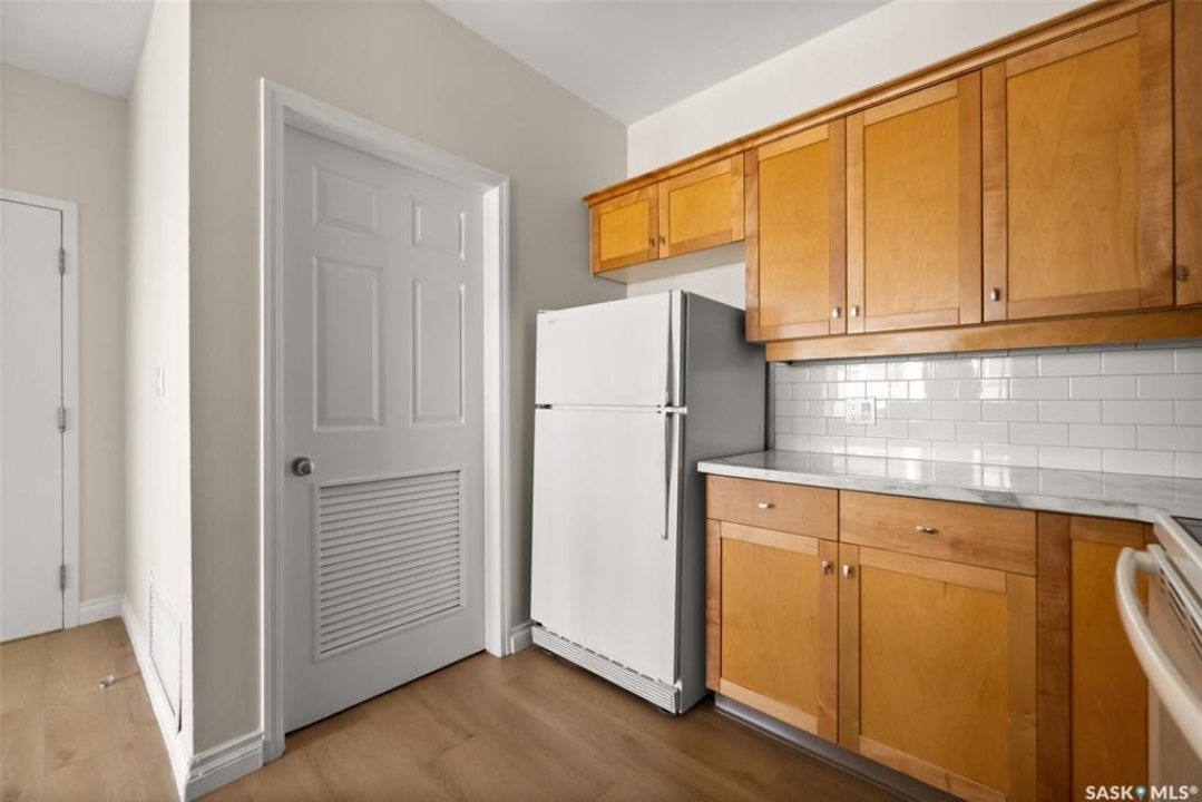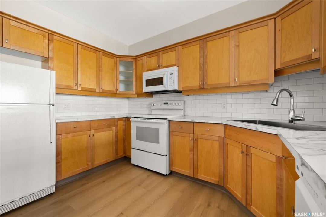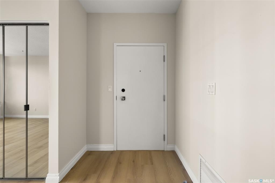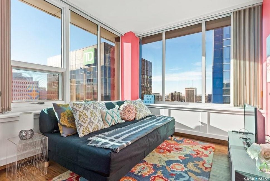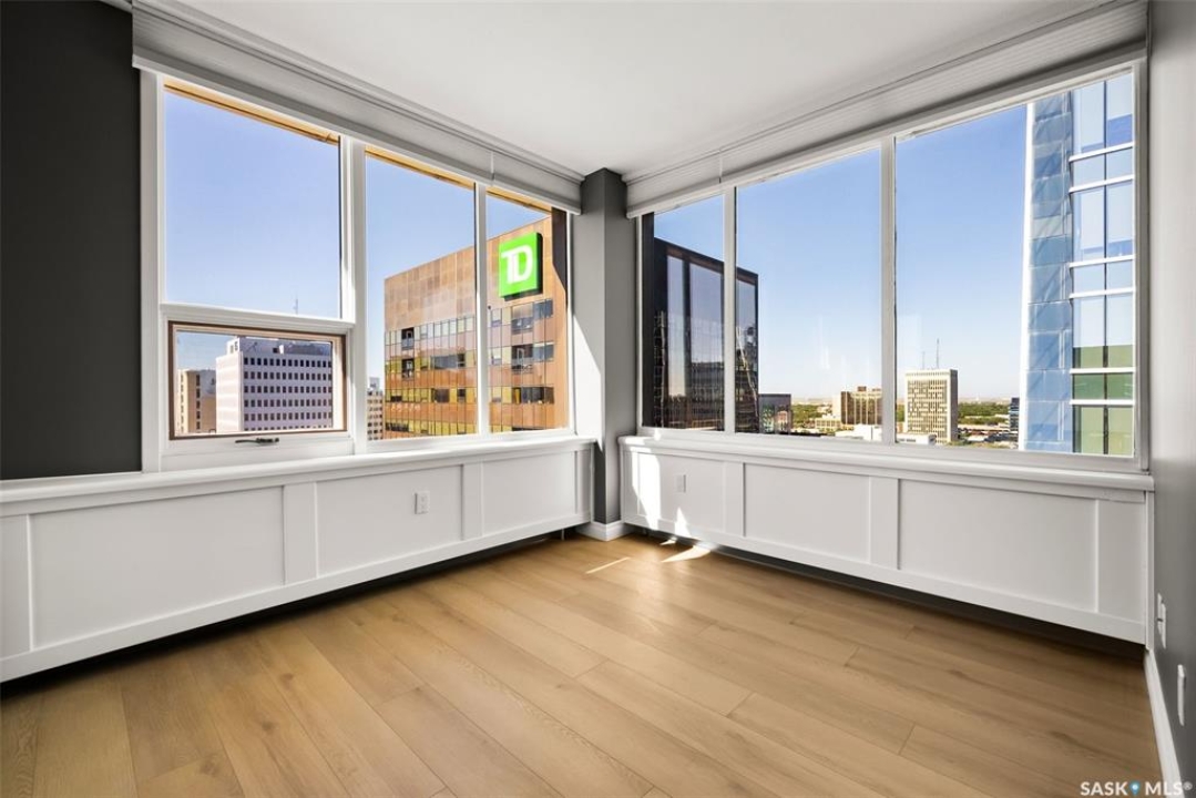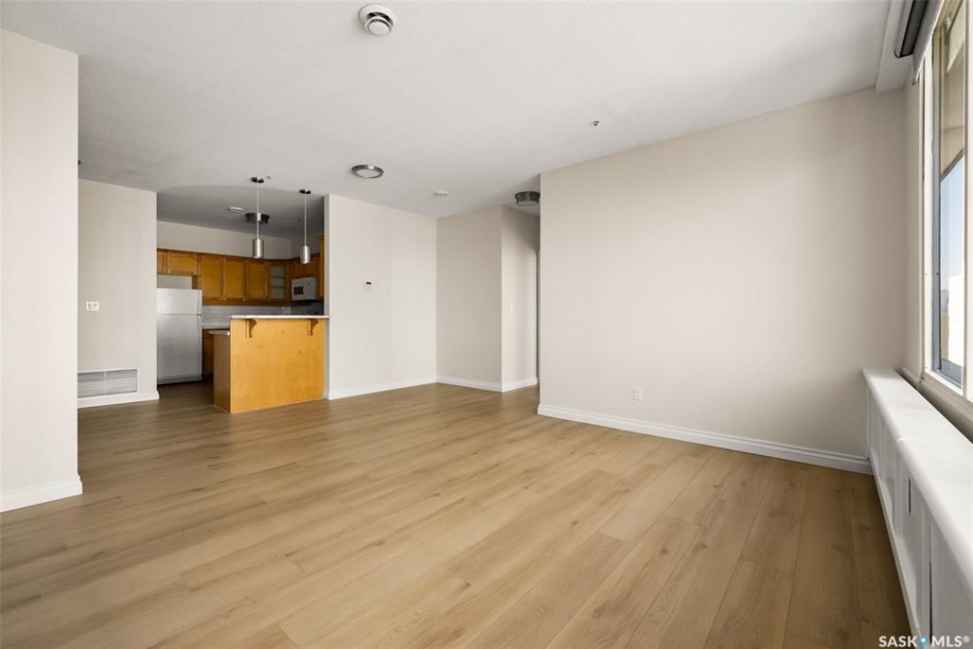 Enjoy city living at its best! This gorgeous upgraded 2 bed condo is move in ready and boasts awesome city views! Situated in the Hamilton building in the heart of downtown, this condo development has much to offer including concierge, a full gym, large amenities room, and outdoor patio with bbq area and hot tub for entertaining your guests or enjoying yourself. Upon entry, you are greeted with a bright and airy open plan living space. The nice sized kitchen features maple cabinetry with under cabinet lighting, updated hardware and new marble look laminate counters with new modern sink & taps (2019). There is also a new microwave hood fan (2020), dishwasher(2019) and stove (2020). Handy laundry/utility room off the kitchen with full size stackable washer and dryer (3 yrs old). There is a 2 seater eating bar between the kitchen and the spacious living room. High quality luxury waterproof laminate flooring flows throughout the condo. The living room features a wall of windows with stunning city views and there is a good sized dining area. Master bedroom is a nice size and boasts a gorgeous custom wall papered feature wall and a 2 pce ensuite with new hardware and tap plus double closet. On the opposite side of the condo is the 4 pce main bath and a 2nd bedroom with corner floor to ceiling windows boasting new blinds (2025) and fabulous views! 9 ft ceilings throughout the condo and new custom blinds to living room, master bedroom and 4 pce bath. Entire unit was professionally repainted in modern neutral tones in 2025. The building is concrete and this home is super quiet and soundproof! If you work downtown, no need to pay for parking as this unit comes with its own u/ground parking stall #42. There is also an on-floor garbage shoot and a place to store your bike! Move in and enjoy!
