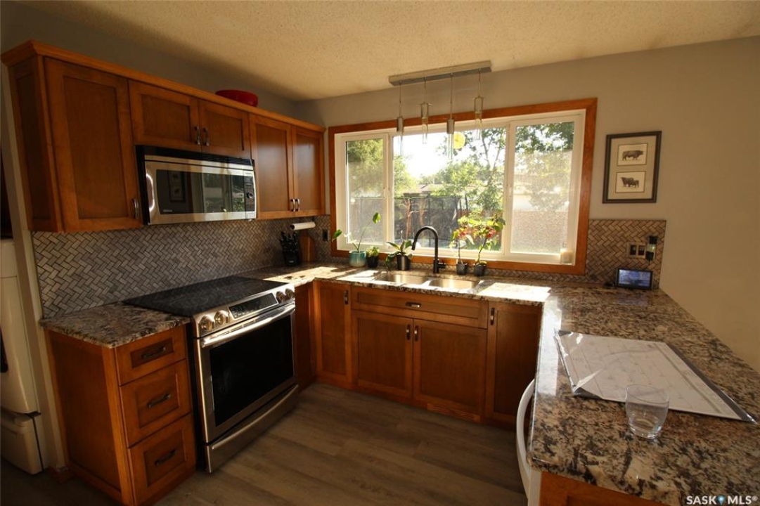 The Ultimate Family Home Awaits! This isn't just a house—it's the family home you've been dreaming of! This expansive 1,500 sq. ft. bungalow is perfectly designed for comfort, entertaining, and everyday living. Step through the front door and you're greeted by entertainment central. The massive living room offers a unique conversation-pit style layout alongside a raised seating area—perfect for cozy movie nights or lively gatherings. At the heart of the home, the kitchen is warm and inviting with rich maple cabinetry, a herringbone backsplash, and countertops that tie it all together beautifully. A generous dining area opens to the back deck, while a large pantry and main-floor laundry (just steps away) make life even easier. Down the hall, you'll find spacious bedrooms, a refreshed guest bath, and a primary suite complete with its own 3-piece ensuite and large closet. The lower level? A kids' paradise. There's a sprawling family room with a gas fireplace, a huge toy room, a private bedroom for your teenager (with their own 3-piece bath), plus a bonus room to adapt however you choose—gym, office, craft space, you name it. From there, head through the oversized double garage (with workbench and extra storage) to the backyard—where the fun really begins. With lush, mature grass and a full fence, there's room for trampolines, games, and garden adventures. The veggie garden is ready to offer up fresh snacks, while the spacious patio is perfect for summer BBQs. Two storage sheds keep bikes and toys neatly tucked away. This home has been lovingly refreshed with new paint inside and out, updated light fixtures, and new kitchen flooring. Energy-efficient windows, central air, and central vac mean you can move in and simply enjoy. All that's left? You. Come for a visit—you may just decide to stay for a lifetime.