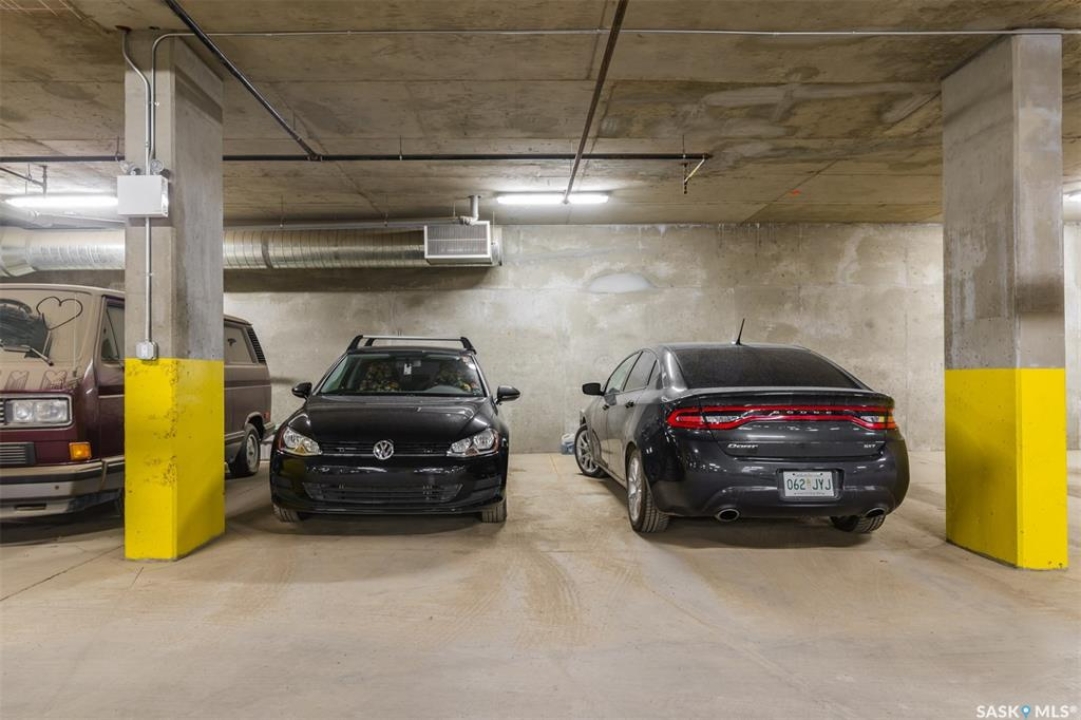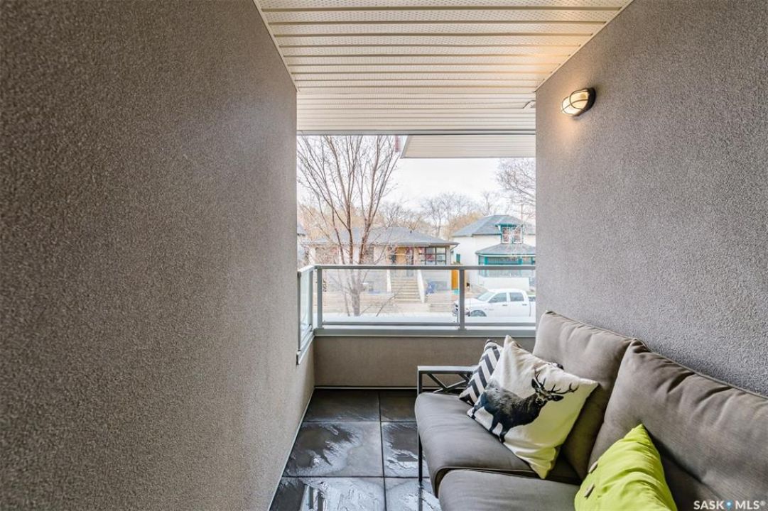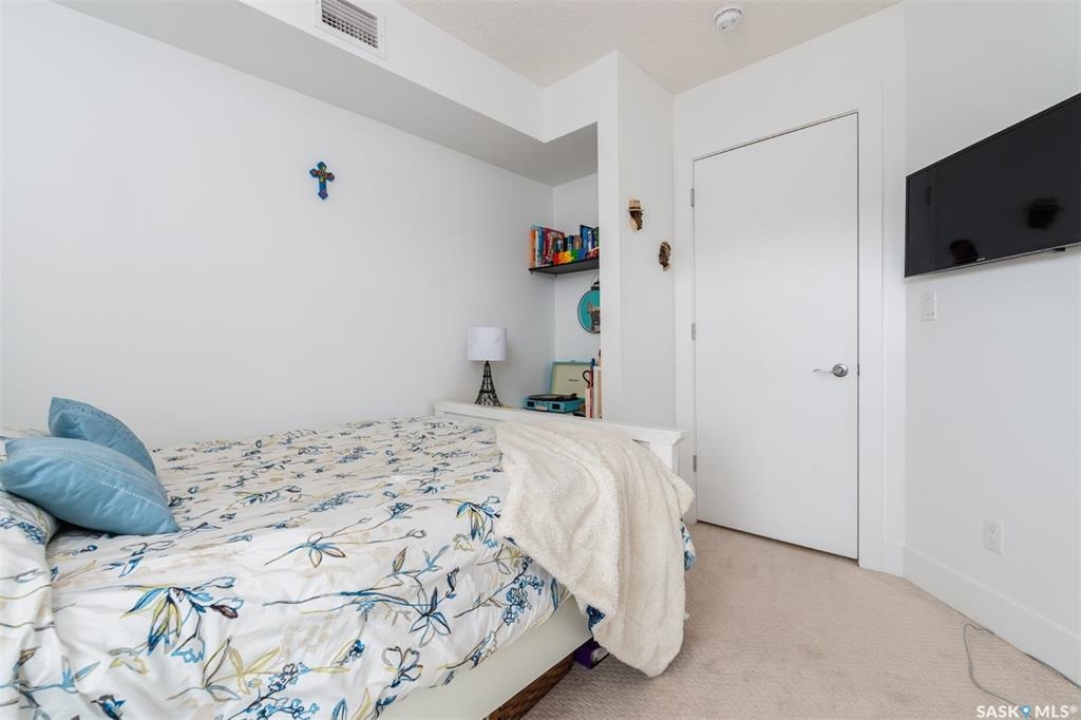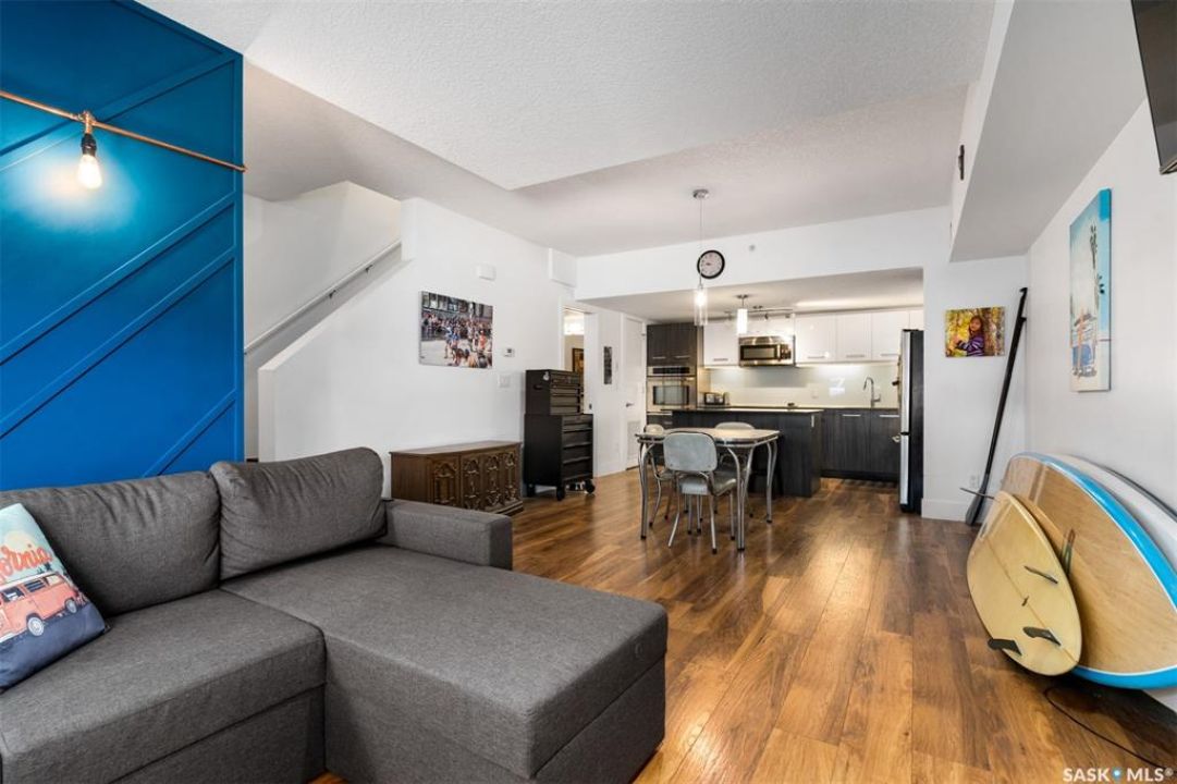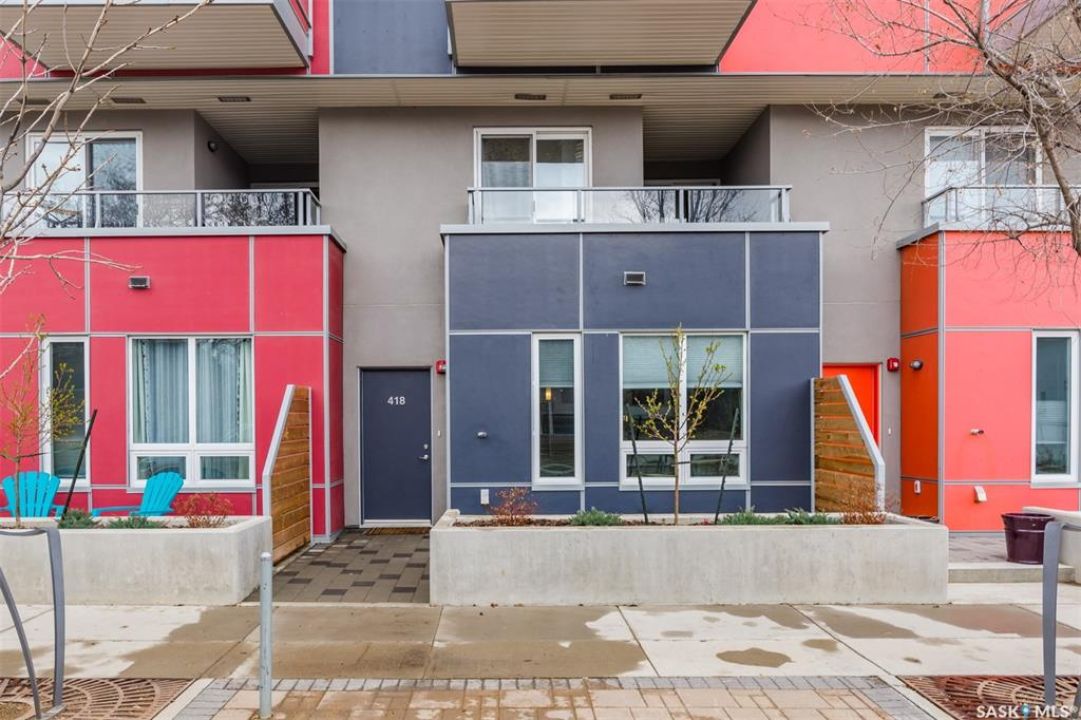 Enjoy downtown living in this newer, modern townhome located steps to the river. Well constructed and completed in 2017, this home is part of the popular Banks complex. Featuring 2 bedrooms, 3 bathrooms, an open concept layout on the main floor with lots of cabinetry and quartz countertops as well as stainless steel appliances, a Napoleon fireplace with new surround in the living room, a concrete feature wall and a two piece modern bath. Upstairs you will find a three piece bath with tiled shower and glass door, a Bosch washer and dryer, spacious primary bedroom with 4 piece en-suite and an additional bedroom both with balcony doors leading to a covered deck overlooking Avenue C. Brand new carpet throughout the upstairs and on the staircase. The townhome comes with TWO titled, heated underground side-by-side stalls and a storage unit. Other features include central air, natural gas hook-up for bbq, underground parking for your guests, rooftop deck and bike room. With only a few of these two-story style townhomes built, this is definitely a rare find. Enjoy the convenient location with many amenities close by including the newest restaurants, boutique shops and coffee spots.