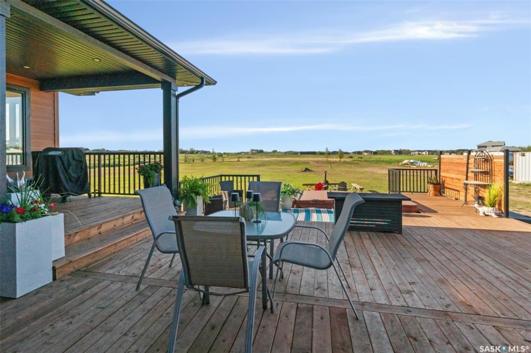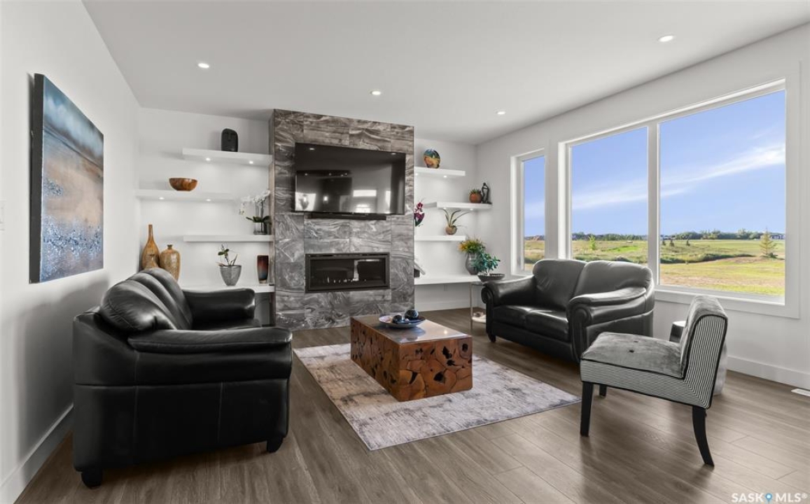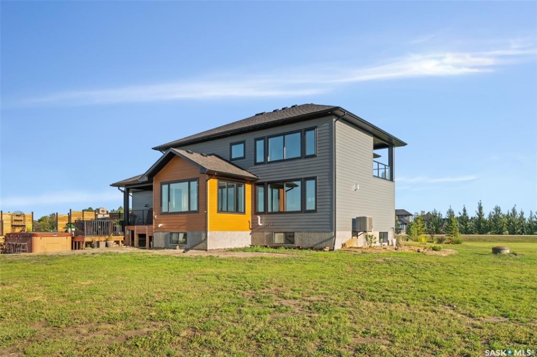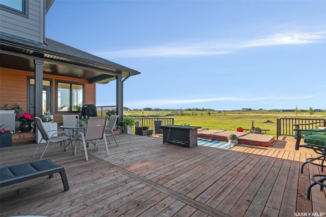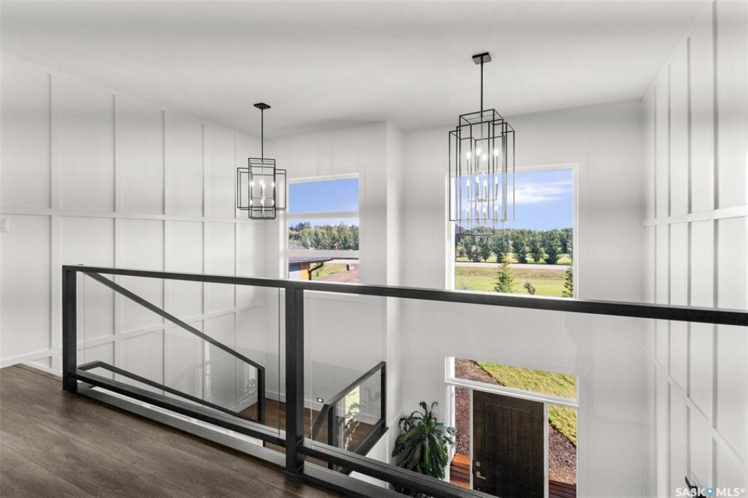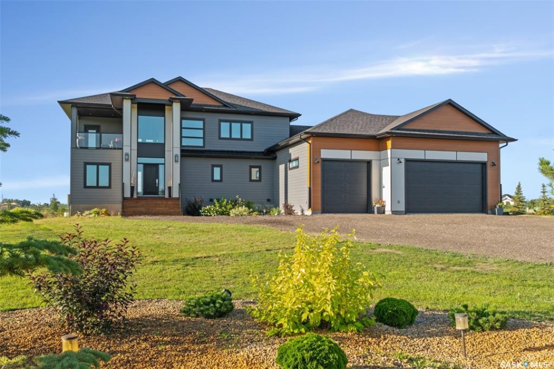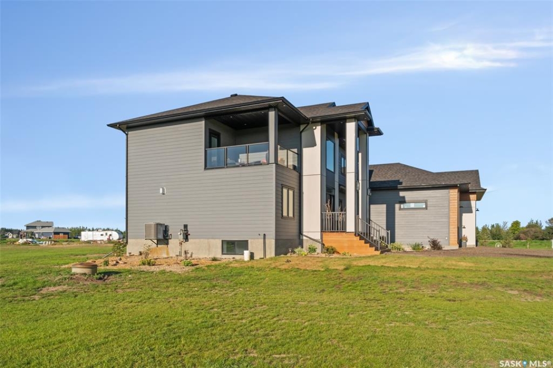 Welcome to 172 Grandview Trail, an exceptional residence in the prestigious Grasswood Estates. Set on three acres, this custom-built home combines modern design with functional elegance, offering four bedrooms, four bathrooms, and a spacious five-car attached garage. The interior is thoughtfully designed with high-end finishes throughout. The chef's kitchen is a true highlight, featuring acrylic cabinetry, quartz countertops, a built-in double oven, a gas stove with a pot filler, and a convenient butler pantry. Perfect for entertaining or everyday living, the open layout flows seamlessly into the living room, where a striking stone fireplace, custom built-ins, and expansive windows create a bright and welcoming atmosphere. The home itself is supplied with city water, ensuring convenience and reliability. The bedrooms are generously sized, designed with both comfort and style in mind. The bathrooms feature granite countertops and spa-inspired finishes, offering a retreat-like experience in your own home. The fully developed lower level provides even more living space, complete with a large family room, stylish bar area, private theatre, and a gym that can also serve as a versatile fourth bedroom. Step into the backyard made for both entertaining and unwinding. The three-tier deck with a built-in pizza oven provides multiple areas to host friends and family, while the meticulously landscaped grounds feature underground sprinklers and a drip irrigation system sourced from the well to keep everything vibrant and low-maintenance. Whether enjoying summer gatherings or quiet evenings under the prairie sky, this outdoor space is designed for every occasion. With its striking modern design, spacious five-car garage, and carefully crafted interior, this home perfectly balances luxury and functionality. Situated just minutes from Saskatoon, yet offering exceptional privacy and room to roam, this home provides the ideal combination of estate living and city convenience.