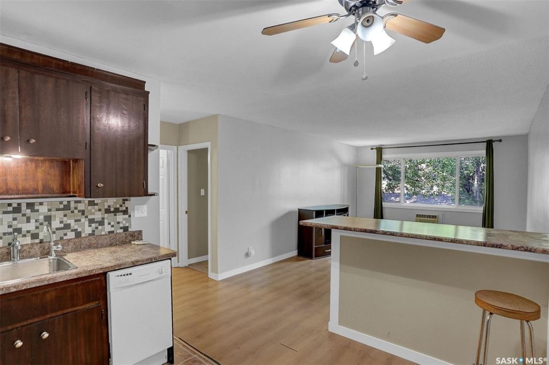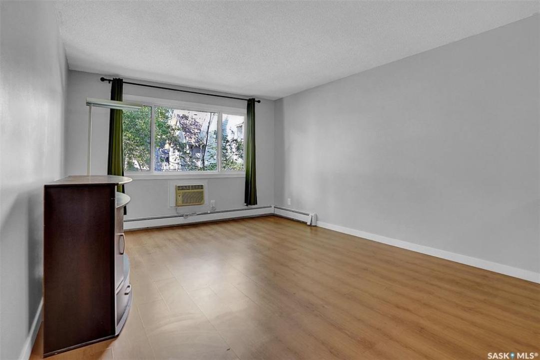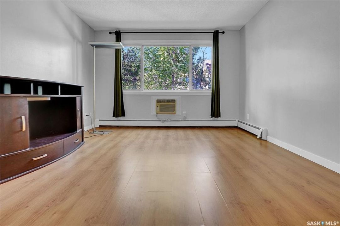 Ideal first time home ownership is possible in this affordable and move-in ready condo with a fantastic Cathedral location! Walking to downtown, Wascana Park and all of 13th Avenue shopping and culture. The comfortable living room has laminate flooring and is open to the kitchen and dining. Lots of cabinetry in the kitchen with fridge, stove, hood fan and built-in dishwasher included. There is one bedroom and a full bathroom. The storage room has the bonus of an added provision for in-suite laundry. There are upgraded windows and this condo has been refreshed with new paint and comes with one electrified parking. Condo fees include heat, water and sewer.
