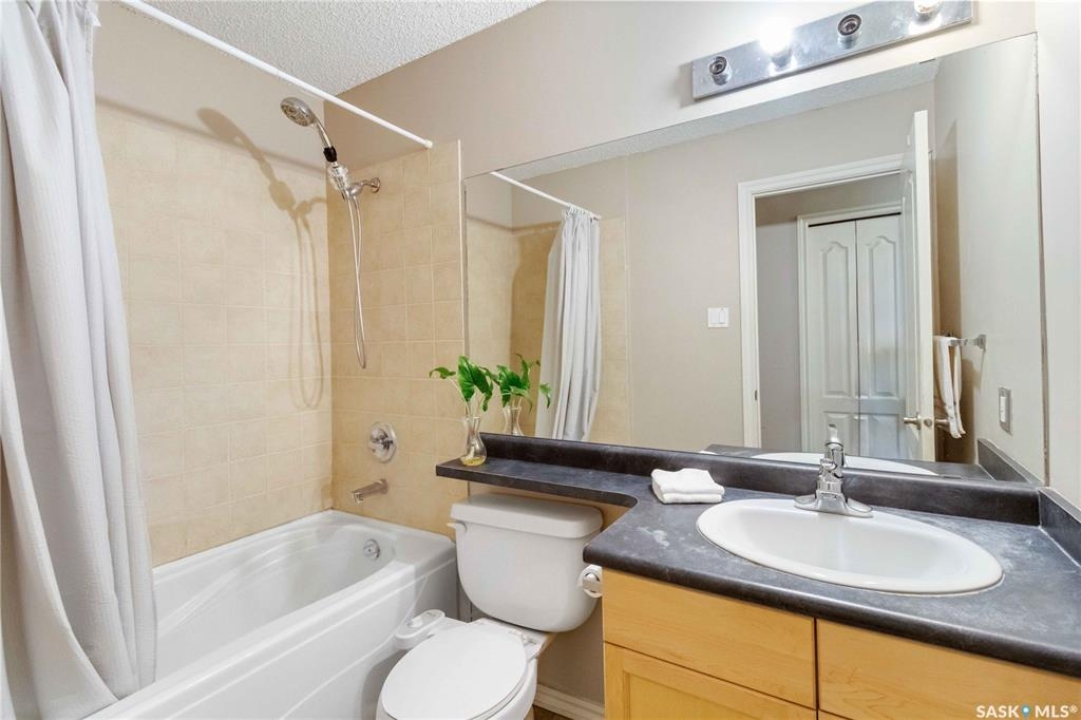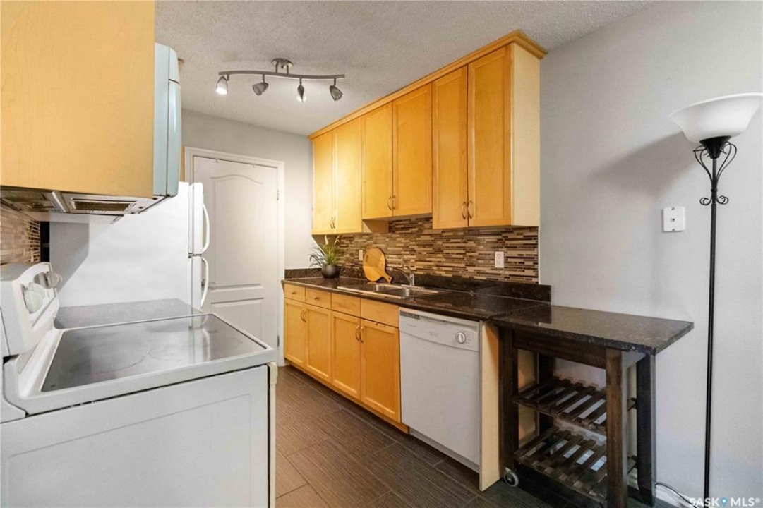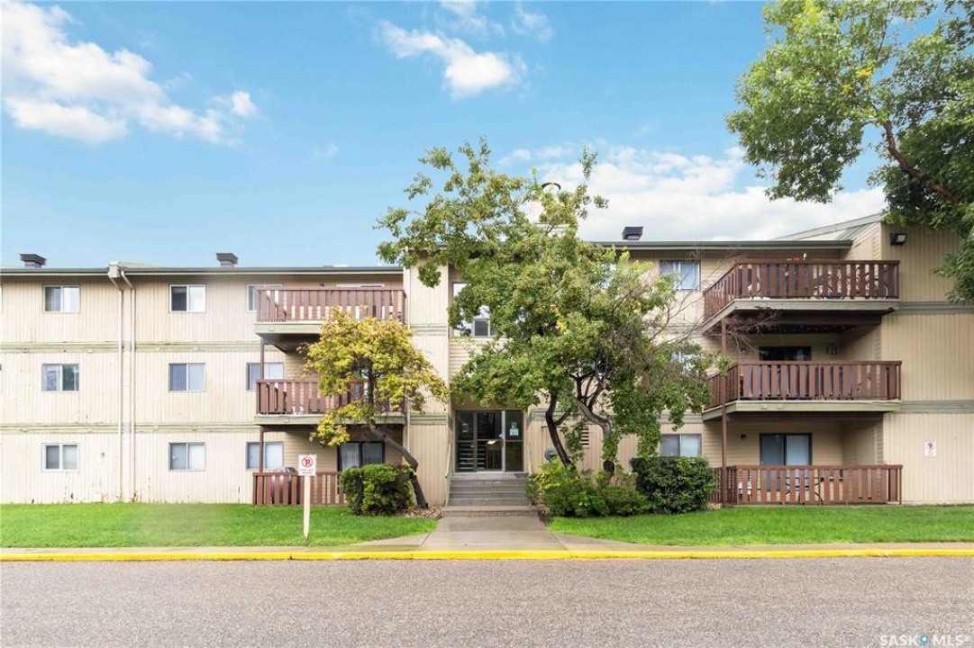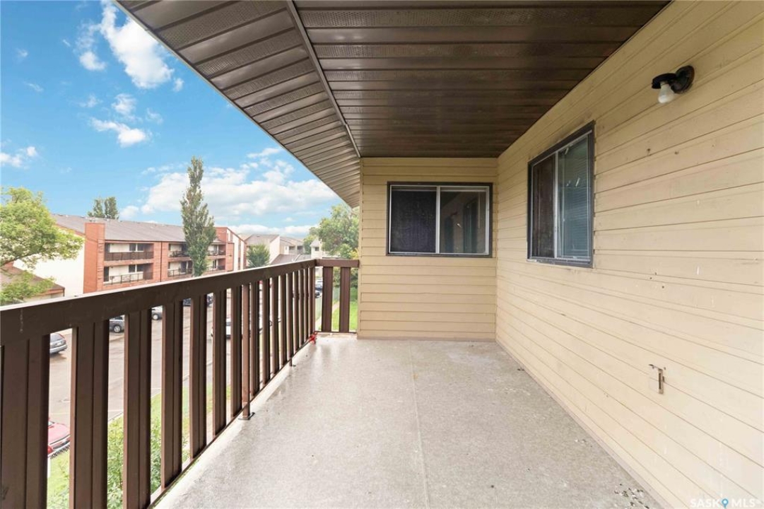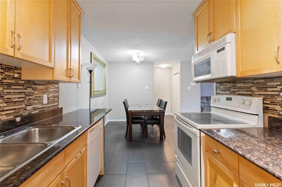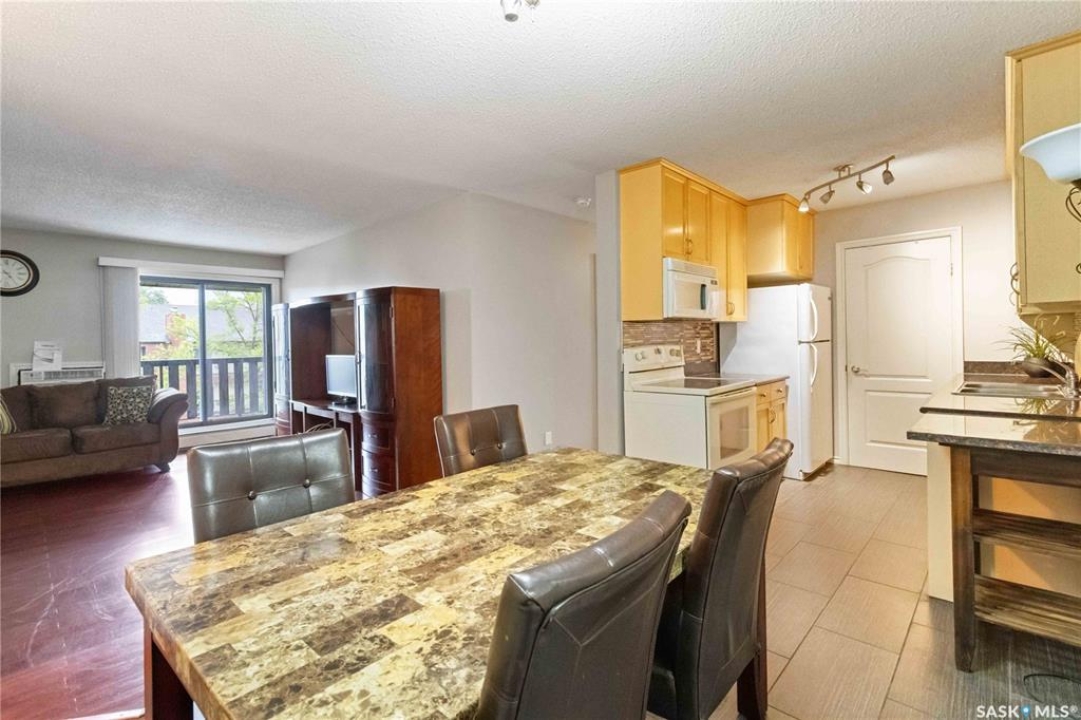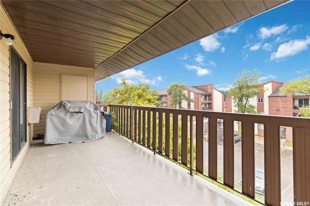 Ideally situated, this 1,087 sq. ft. top-floor corner condo with 3 bedrooms and 1.5 bathrooms is perfect for families, professionals, or students looking for a quiet, low-maintenance lifestyle in a highly convenient location. Situated within walking distance to grocery stores and just minutes from the University of Saskatchewan, Lakewood Civic Centre, Wildwood Golf Course, The Centre Mall, schools, restaurants, and more, this condo offers both comfort and convenience. Inside, the home features durable laminate tile flooring throughout the main living areas, a modern kitchen with granite countertops, maple cabinetry, and a large walk-in pantry. The open-concept living and dining area leads to an oversized covered balcony ideal for relaxing or entertaining. The spacious primary bedroom includes a private 2-piece ensuite, while the main 4-piece bathroom is easily accessible from the other two bedrooms. An in-suite washer and dryer add to the unit's convenience, and two electrified parking stalls are included. Additional highlights include condo fees that cover heat and water, a pet-friendly policy (with board approval), and access to a clubhouse with a gym. The building is also scheduled for an exterior upgrade to maintenance-free Hardie Board siding. Don't miss your chance to own this bright, spacious, and well-located top-floor condo!
