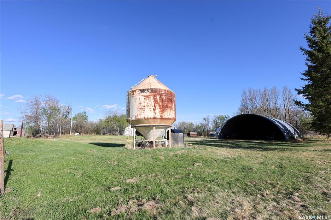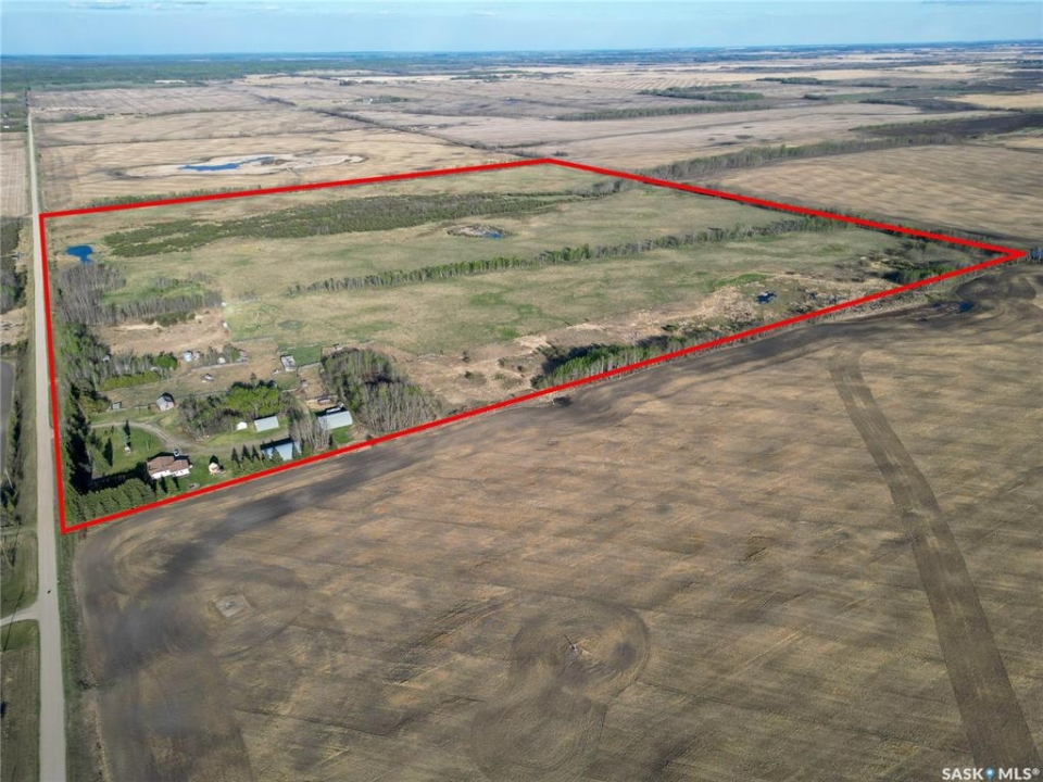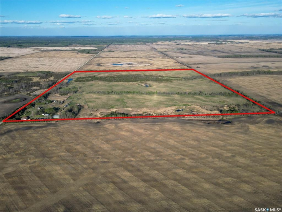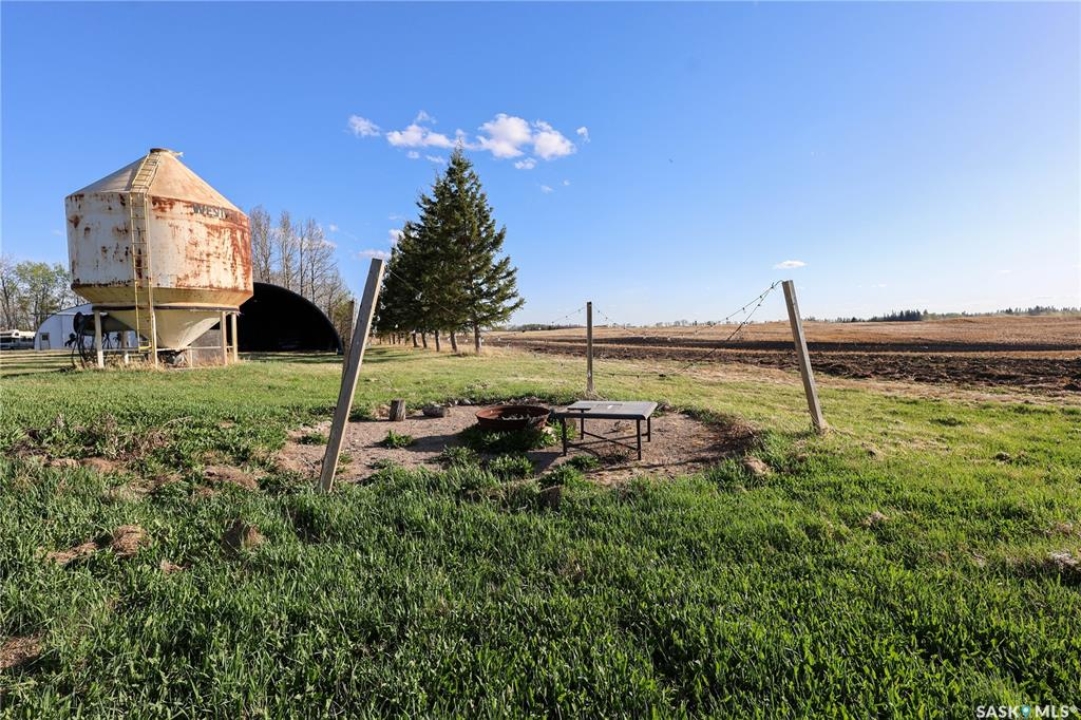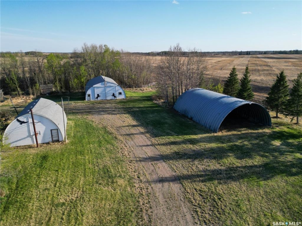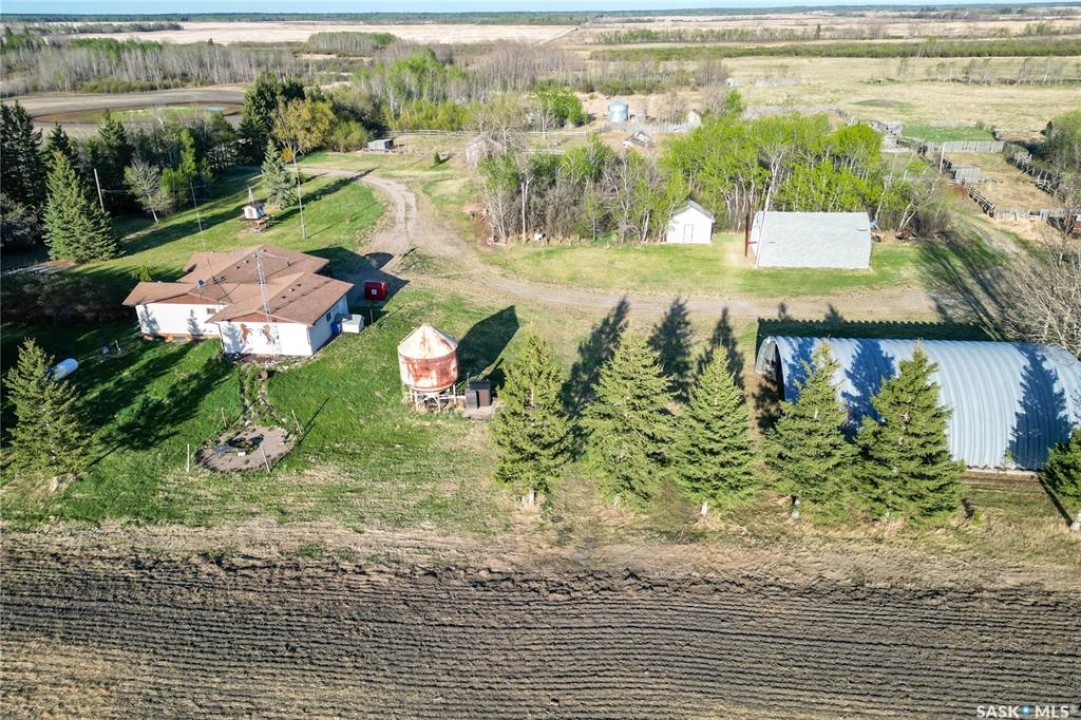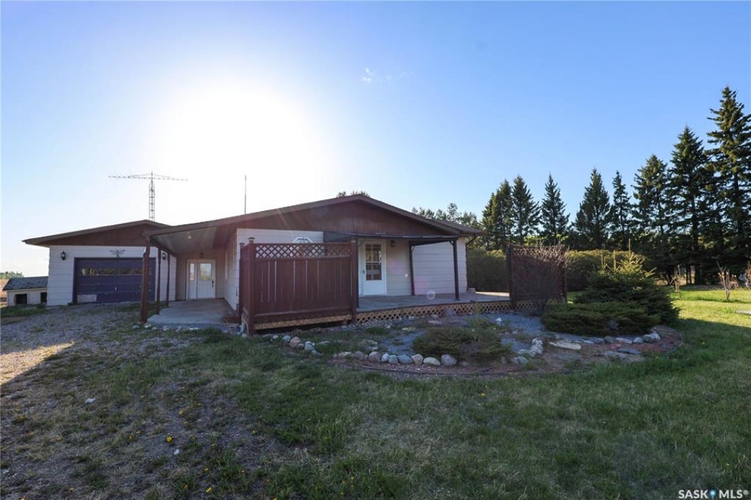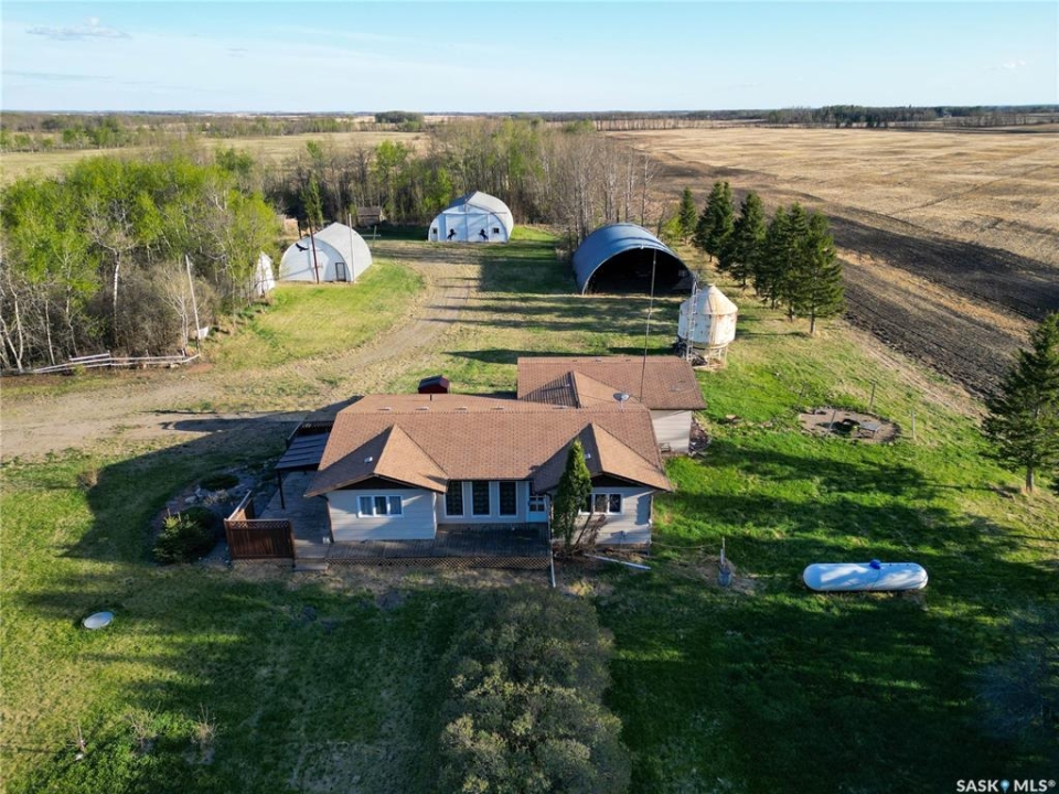 Beautiful 158.46 acre acreage tucked away in a private rural setting, offering a spacious home, multiple outbuildings and plenty of room to live, work and play. The main floor features an open concept design highlighted by a spacious kitchen with ample cabinetry, a peninsula with bar seating and an island with a built-in stove top ideal for family meals and entertaining. The cozy dining area has an electric fireplace that opens to a sunken living room filled with natural light from large windows. A well appointed 3 piece bathroom and a generous laundry room with a sink and abundant storage add to the home's functionality. The fully finished basement includes a large family room, two good sized bedrooms, a 4 piece bathroom, cold storage and a utility room. Outside, you will find a fully insulated single attached garage, a massive covered deck perfect for relaxing or entertaining and a charming fire pit area. The property also features a 60 x 40 ft metal quonset, a 38 x 55 ft shop with a mezzanine and a 36 x 28 ft shop, providing incredible potential for projects, business or storage. This property features 60 cultivated acres and an additional 45 acres of native grassland with potential for future cultivation. The farmable land has a J soil class rating and the assessed value of the land is $152,300, according to SAMA. Surrounded by mature trees and natural beauty, this acreage is a rare opportunity to enjoy a peaceful country living with endless possibilities. Call today to take the next step!