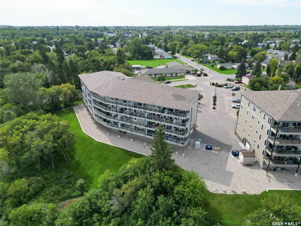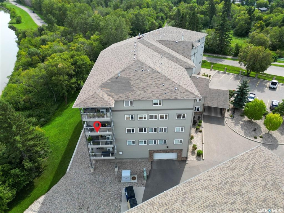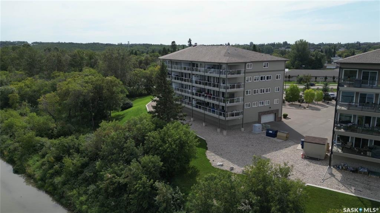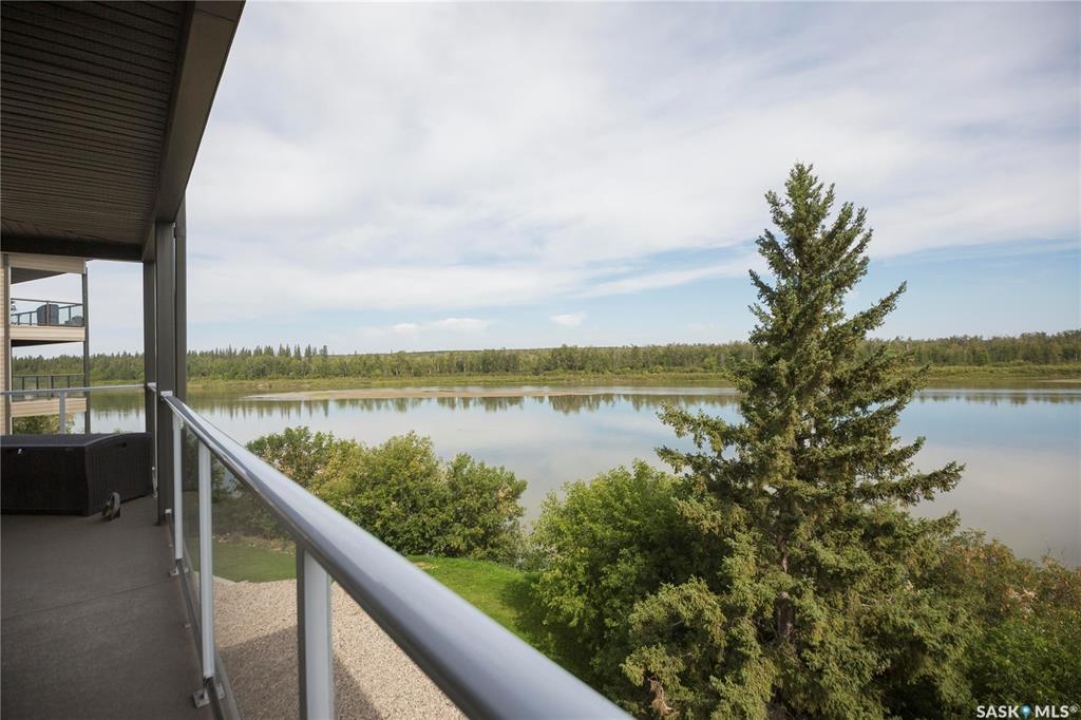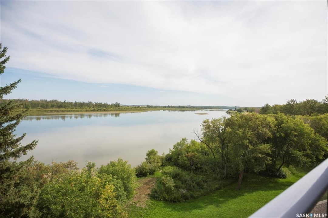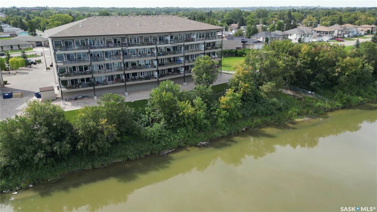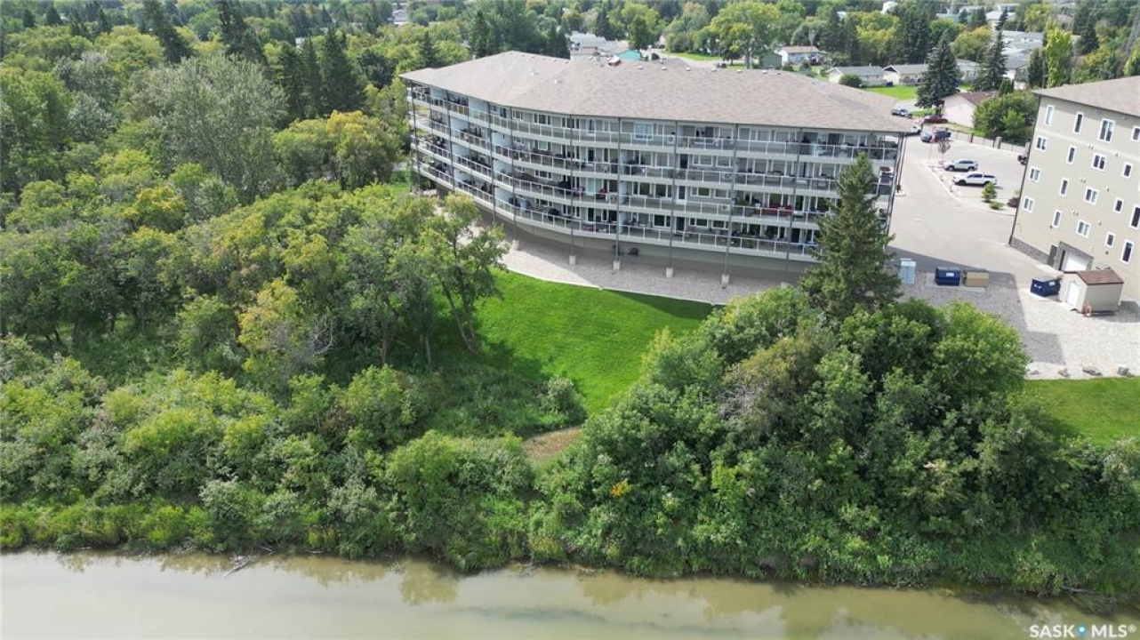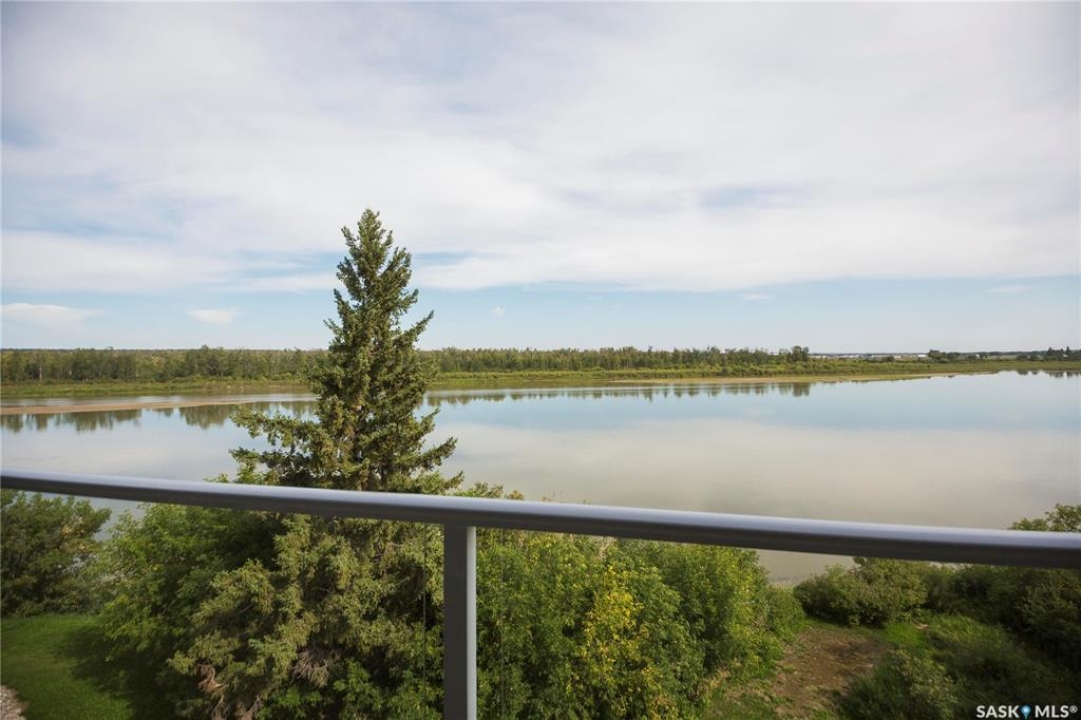 Experience elevated riverfront living in this exceptional third-floor corner condominium, offering 2,000 sq. ft. of luxurious space with some of the finest views in Prince Albert. Northeast facing, this home captures both sunrise and sunset, best enjoyed from the oversized wraparound balcony overlooking the North Saskatchewan River and Rotary Trail. The thoughtfully designed interior features a grand open-concept living and dining area, perfectly suited for entertaining or quiet evenings at home. A chef's kitchen anchors the space with granite countertops, custom cherry cabinetry and an abundance of workspace. Brazilian cherry hardwood flooring flows seamlessly throughout, complemented by tile in the bathrooms, foyer, and laundry room. The private primary suite offers a spa-inspired ensuite and an impressive walk-in closet. Upgraded LED lighting and included heat provide both efficiency and comfort year-round. This exclusive building also offers exceptional amenities, including one in-building heated parking stall and one exterior stall, a generous common area with kitchenette and pool table, plus an exercise room for active living. With direct access to the riverbank and Rotary Trail, this residence blends natural beauty with modern elegance—an extraordinary opportunity to own one of Prince Albert's most desirable riverfront condominiums. Recent upgrades from 2022-2023 include a new fridge, dishwasher, air conditioner, microwave fan, washer, dryer, and freezer.